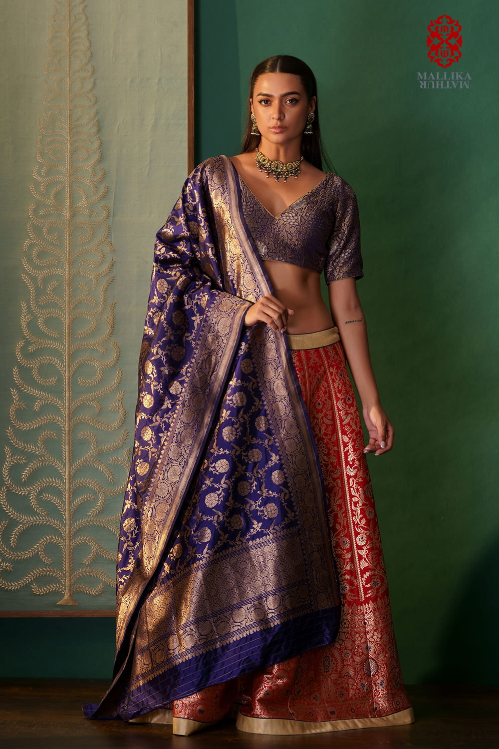 Dupatta silk banarsi royal blue floral jaal handwoven in kadhuan.