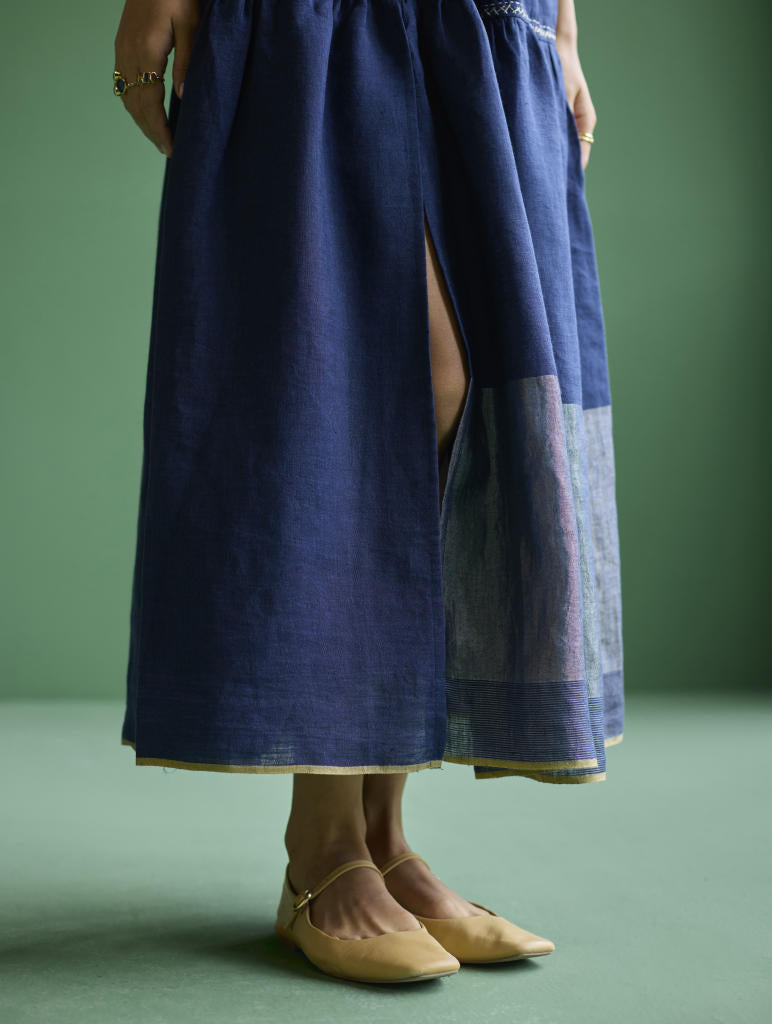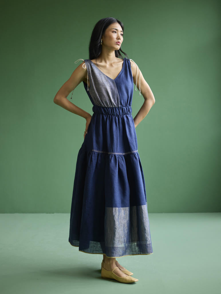 This flowing sleeveless maxi dress is handcrafted from soft handloom yarn-dyed linen with a metallic woven border and woven stripes, along with the hem finished with a grey selvage. The versatile Aria Dress features a V-neckline, hand-embroidered shoulder ties, a cinched waist, and a flowing skirt. Perfect for an outdoor get-together or a relaxed evening look. Pair with our statement hoops for a timeless look.