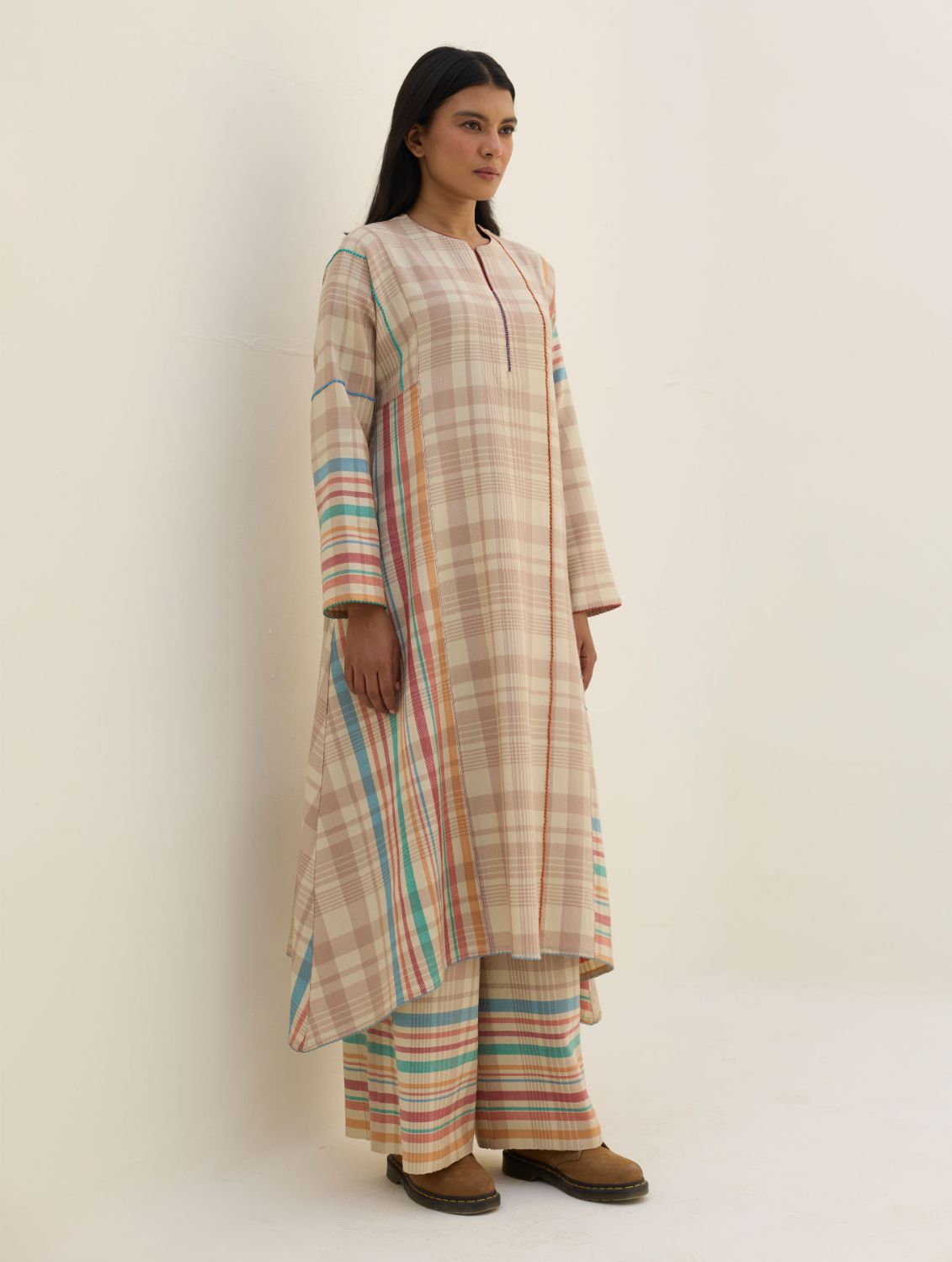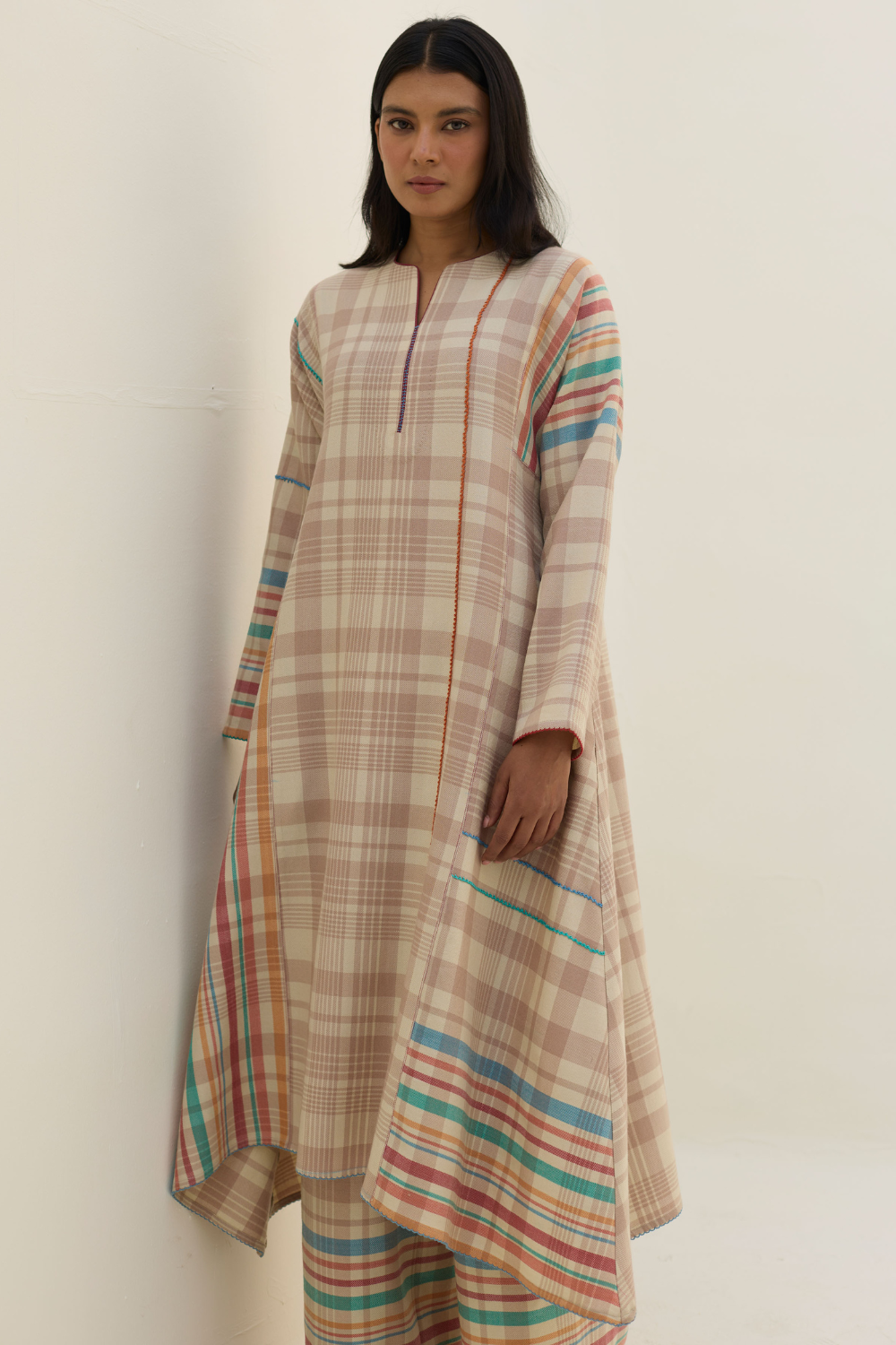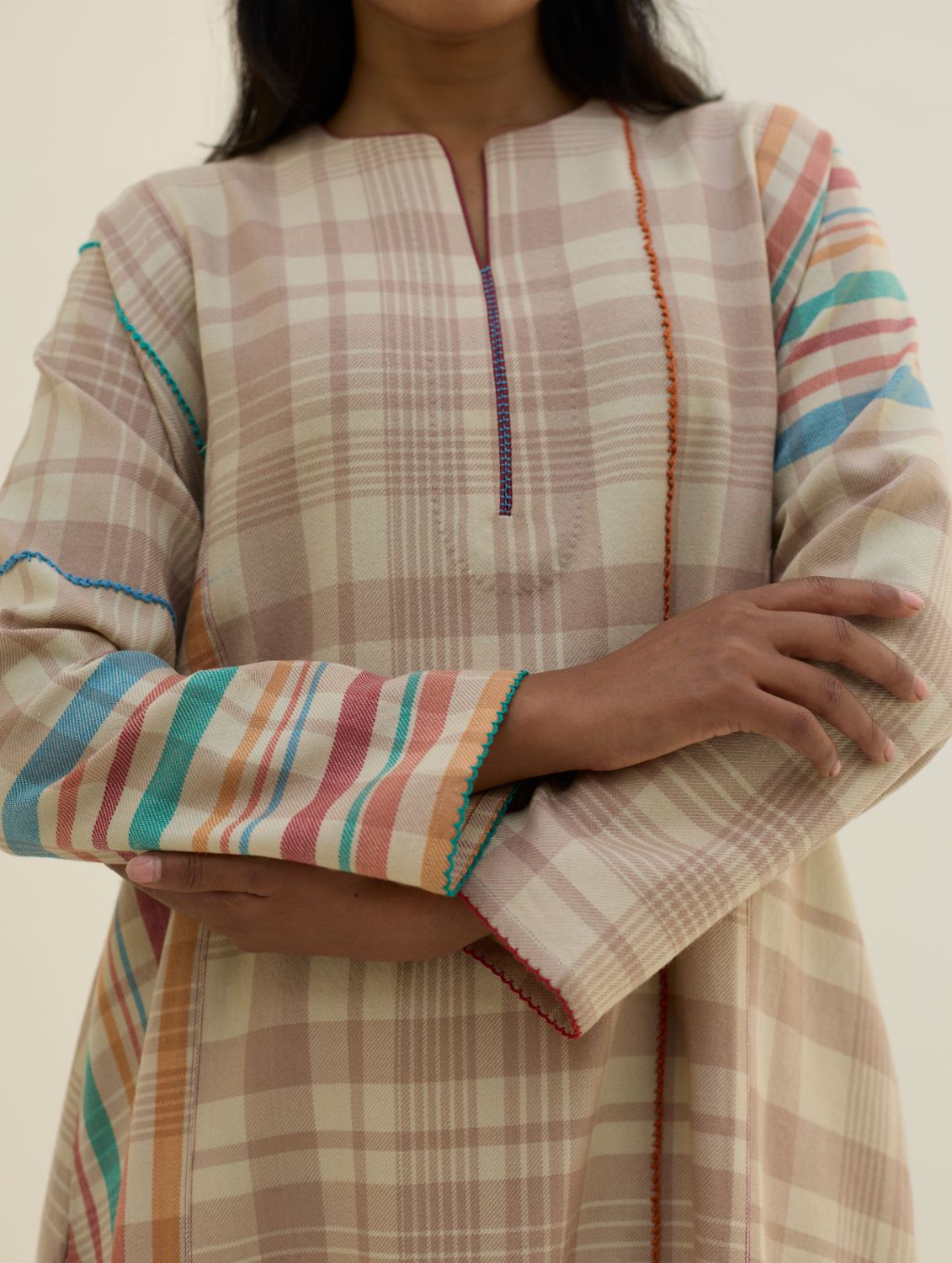 The Daphne is a full-sleeve angrakha style kurta designed in our yarn-dyed pure merino wool with two-toned woven checks, accented with a vibrant multi-coloured striped border thoughtfully placed across the bodice. Side panels are thoughtfully added to bring extra flare and movement to the silhouette. The front opens with a soft round neckline with an intricate contrast piping and jaali detailing. Playful intricate picoting details are placed around the sleeves and hem, pop-coloured hand-knotting details are added for texture and contrast, while comfortable wool-lined side pockets are provided for comfort and warmth.