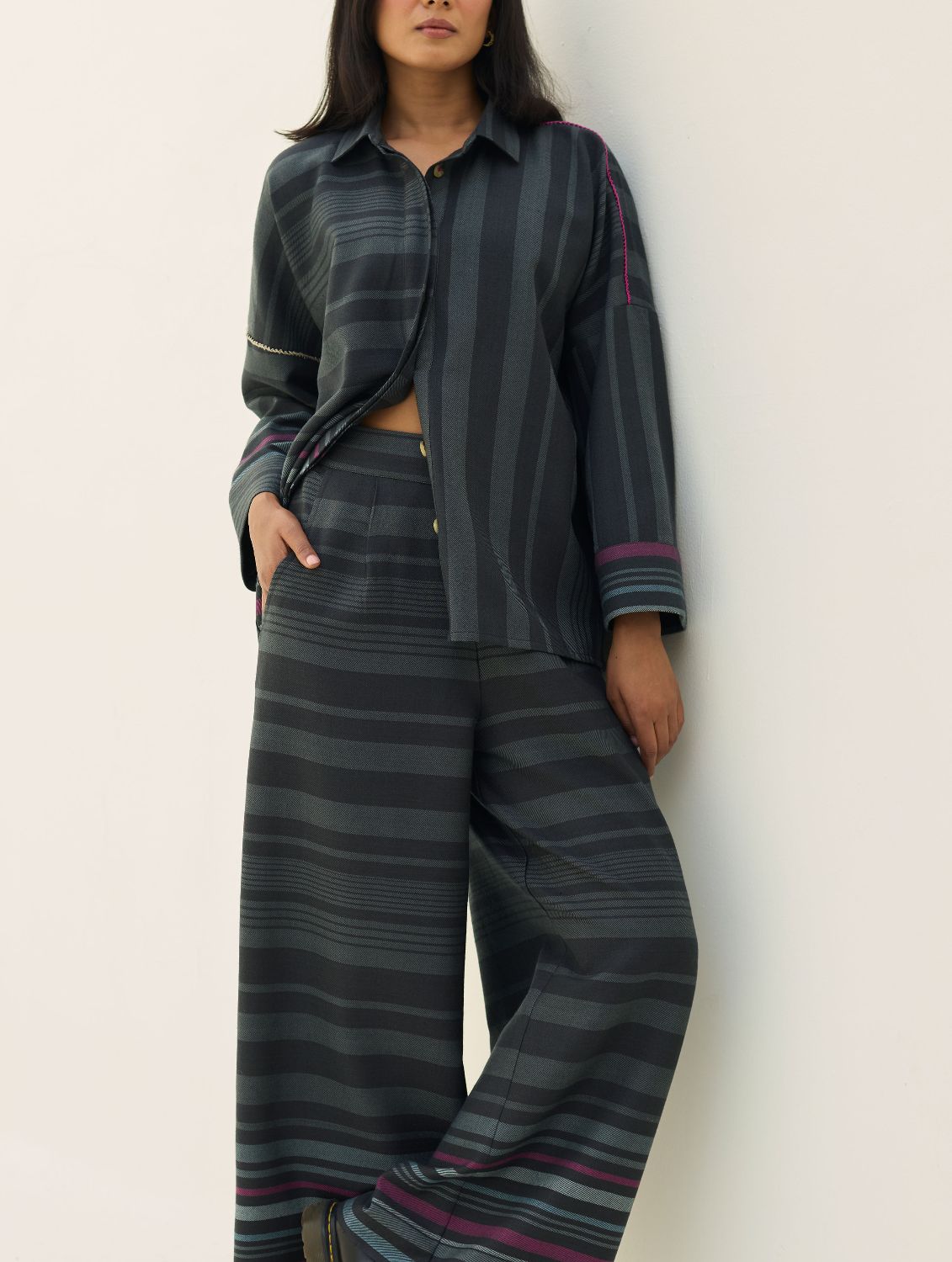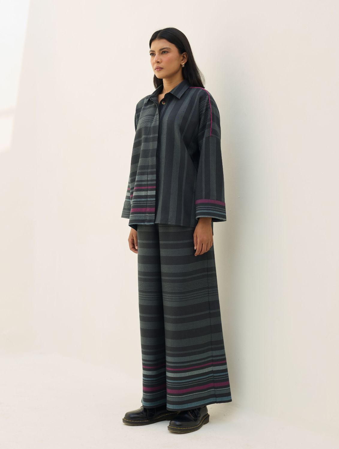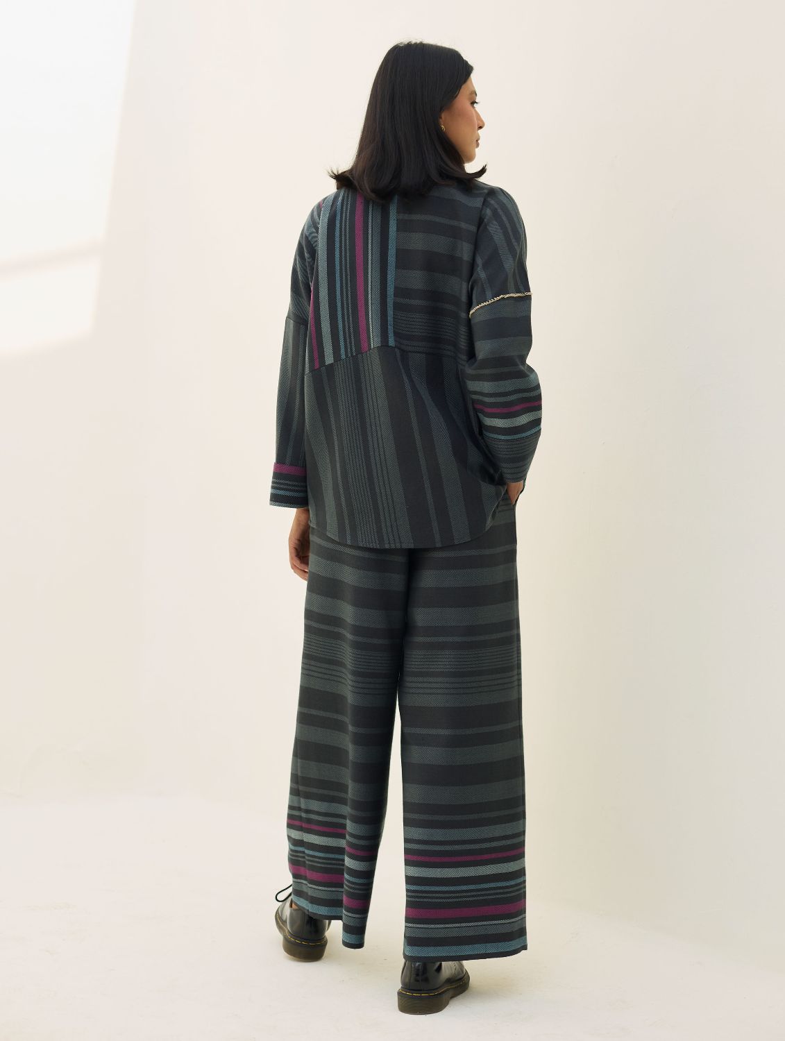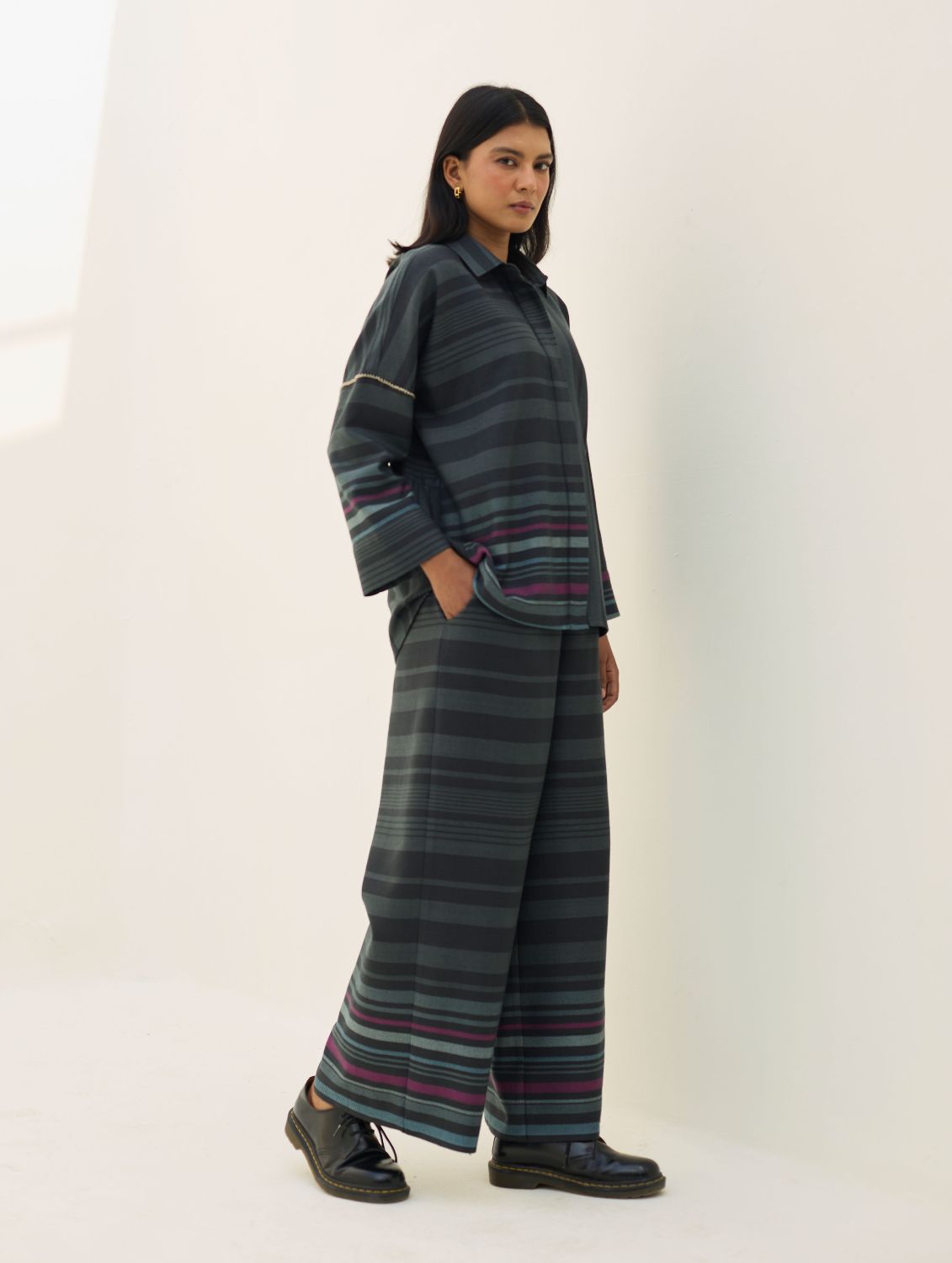 The Ellen shirt is handcrafted in our yarn-dyed pure merino wool woven in two-toned checks with a fun multi-coloured striped border. Designed with relaxed dolman sleeves and a clean, concealed placket, Ellen offers a soft structured silhouette that is easy-to-wear and versatile. Woven multi-coloured vibrant stripes are placed thoughtfully on the bodice which is detailed hand-knotted pop-coloured stitch detailing. Ellen is one of our perennial favourites to layer over your favourite turtleneck sweater or pair over denims or our woven merino wool trousers.