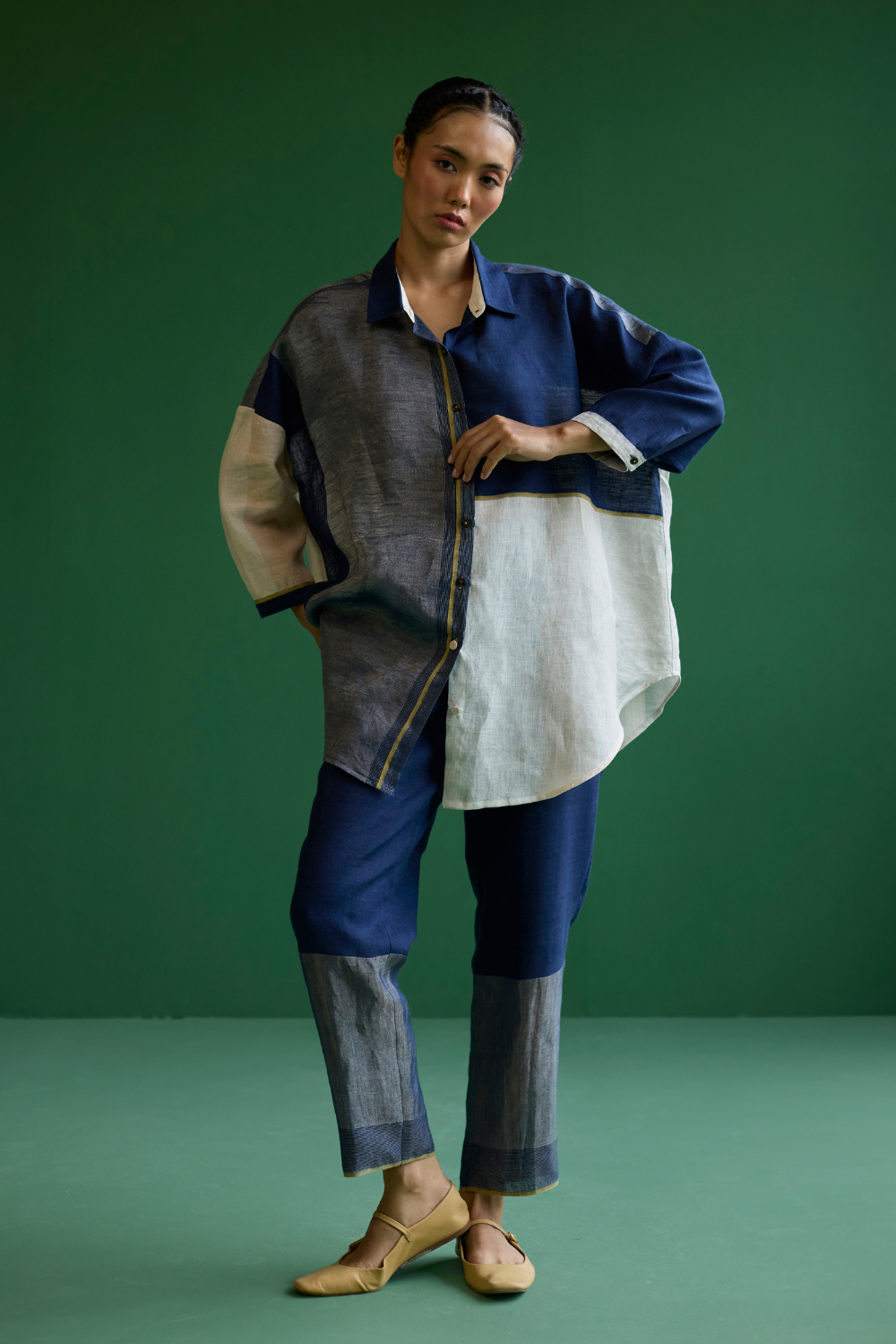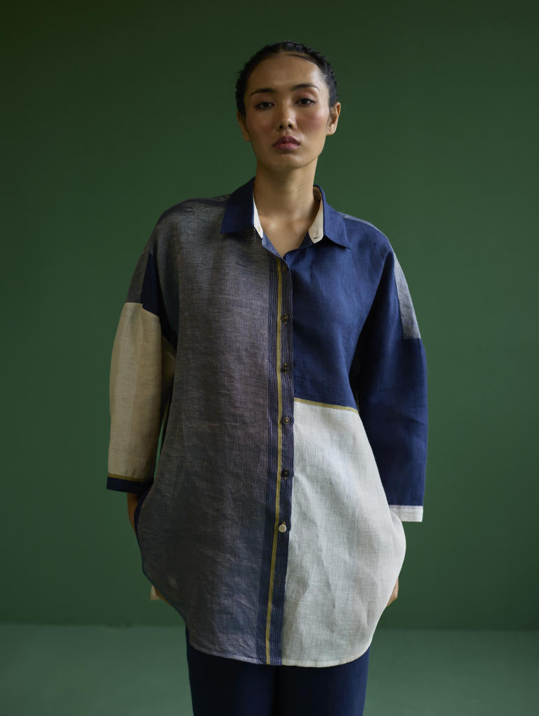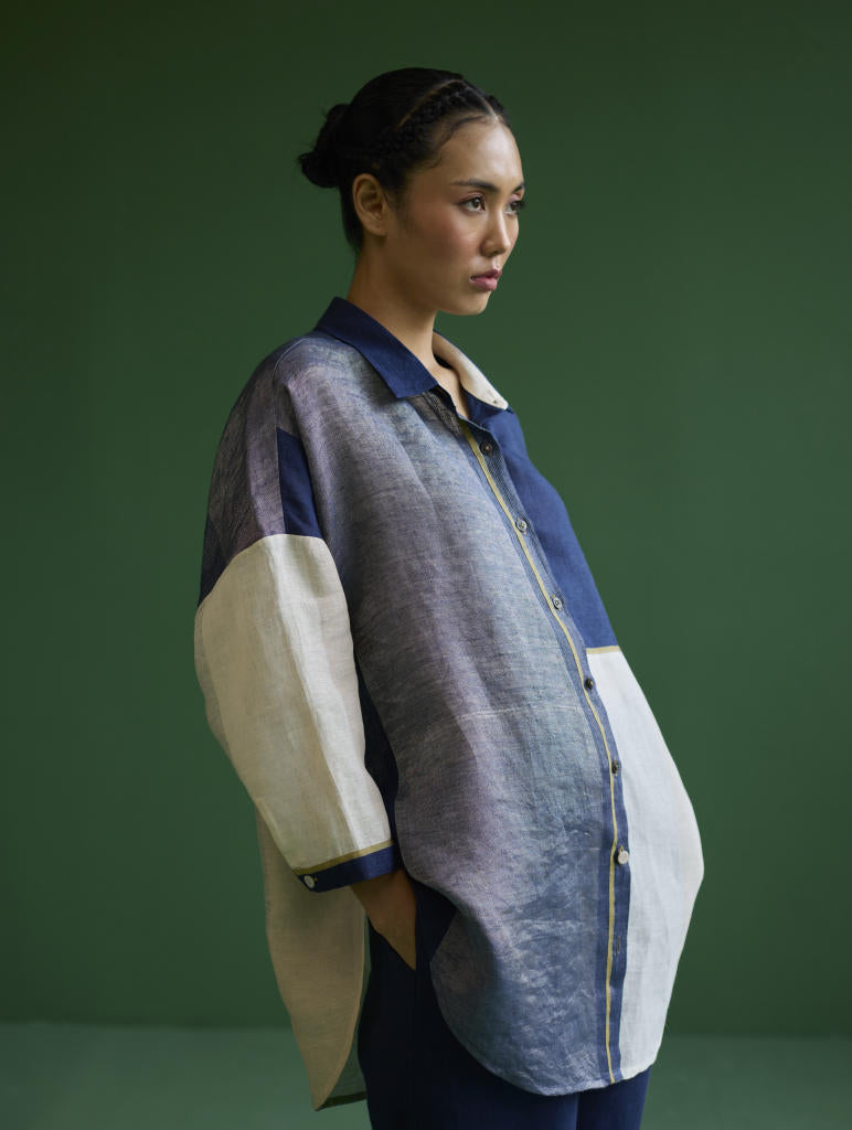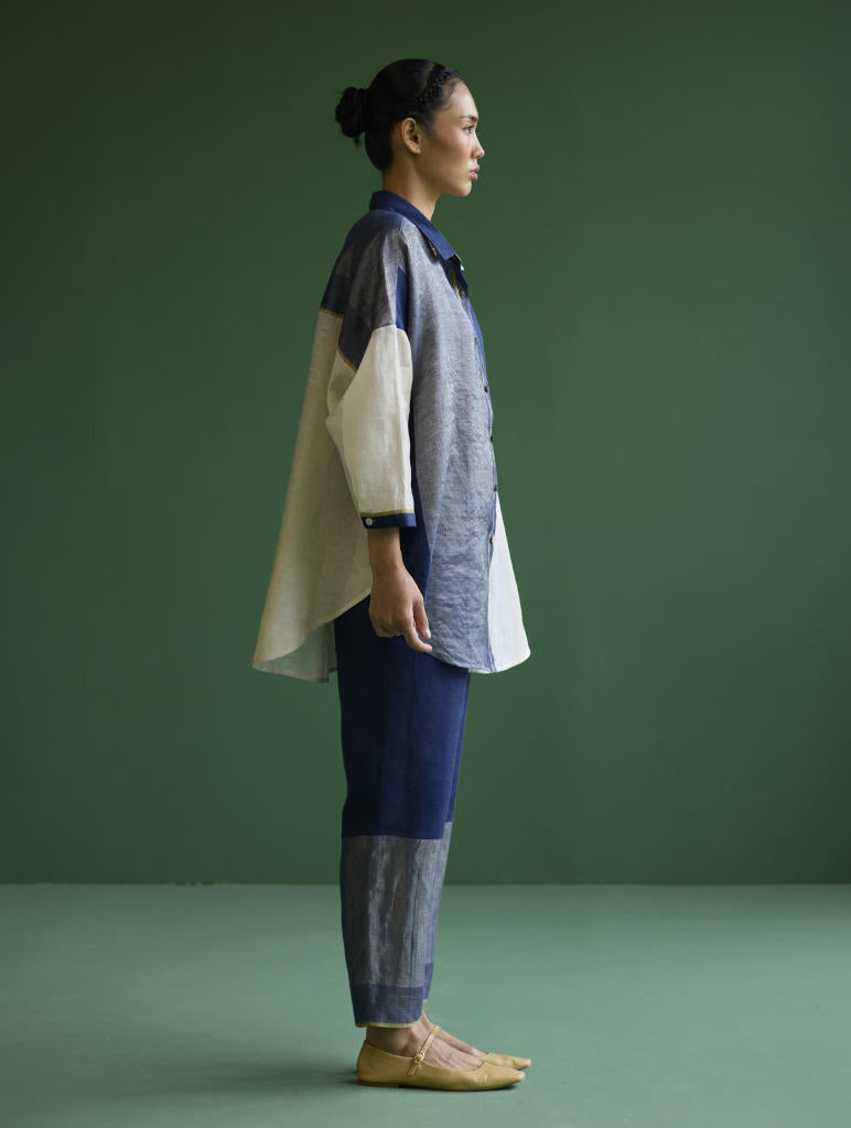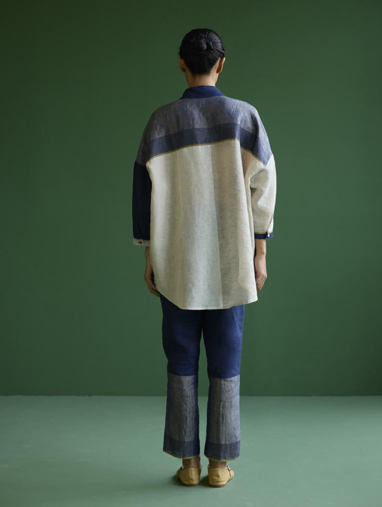 Shirt - A chic, flared, color-blocked shirt with Dolman sleeves crafted from our signature soft handloom metallic border linen in shades of ivory and navy. The design features a self-woven pop-colored selvage and is detailed with metallic brass buttons and linen fabric-covered buttons accented with pop-colored threads.