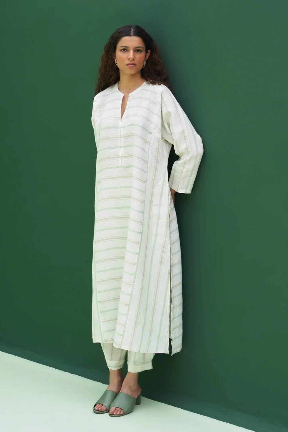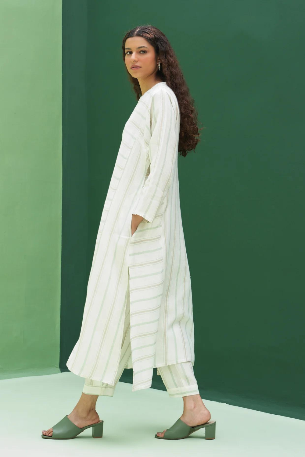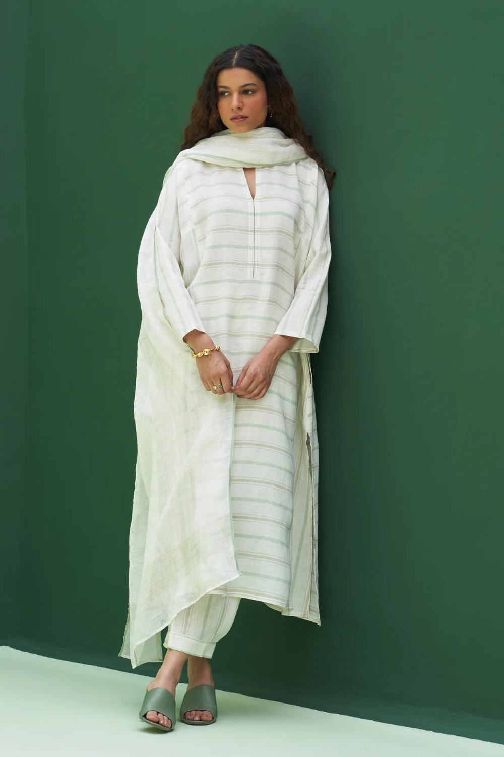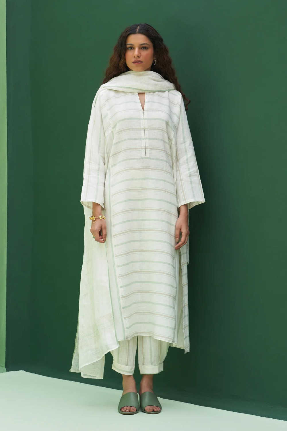 Kurta - A patchwork angrakha style summer kurta designed in our soft handloom striped linen with pockets and side slits finished with a two coloured topstitch detail. It can be worn as a dress, kurta with matching pants or jeans. Pant - Handloom striped linen drawstring pants with an elasticated waist, pleat detail at the ankle with a cuff and pockets. Pairs beautifully with our striped and solid linen shirts, tops and kurtas. Dupatta - The softest handwoven dupatta with a mint and metallic stripe border on beautiful flowing soft sheer linen.