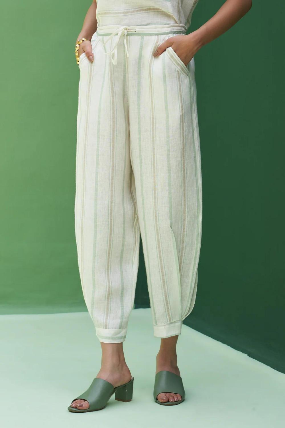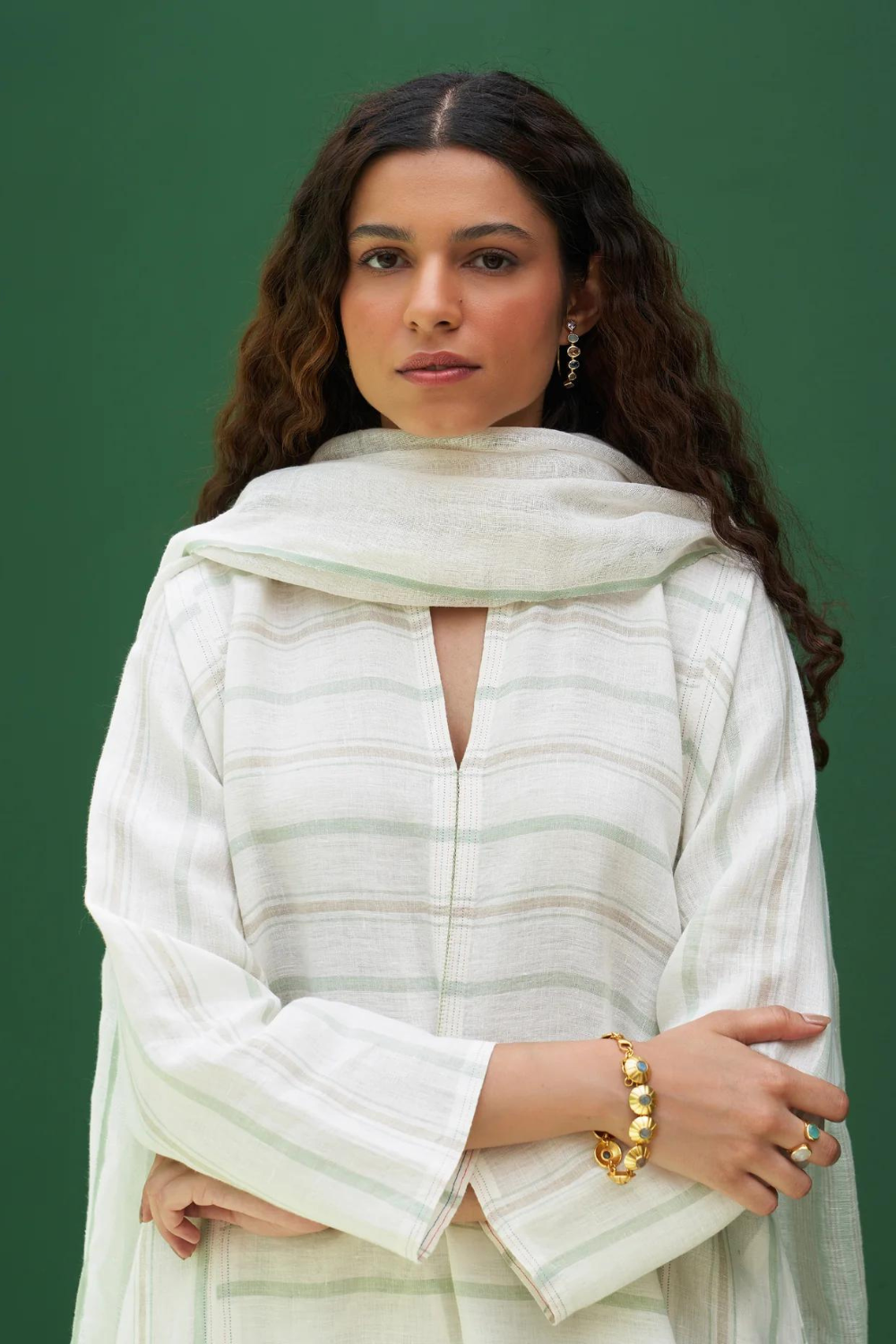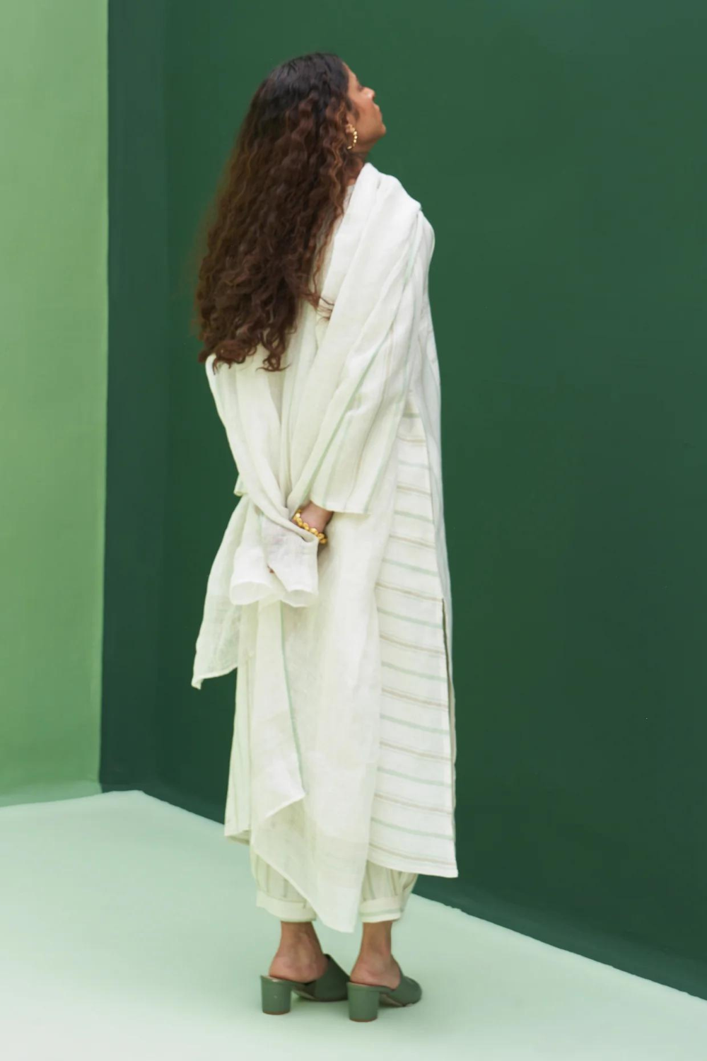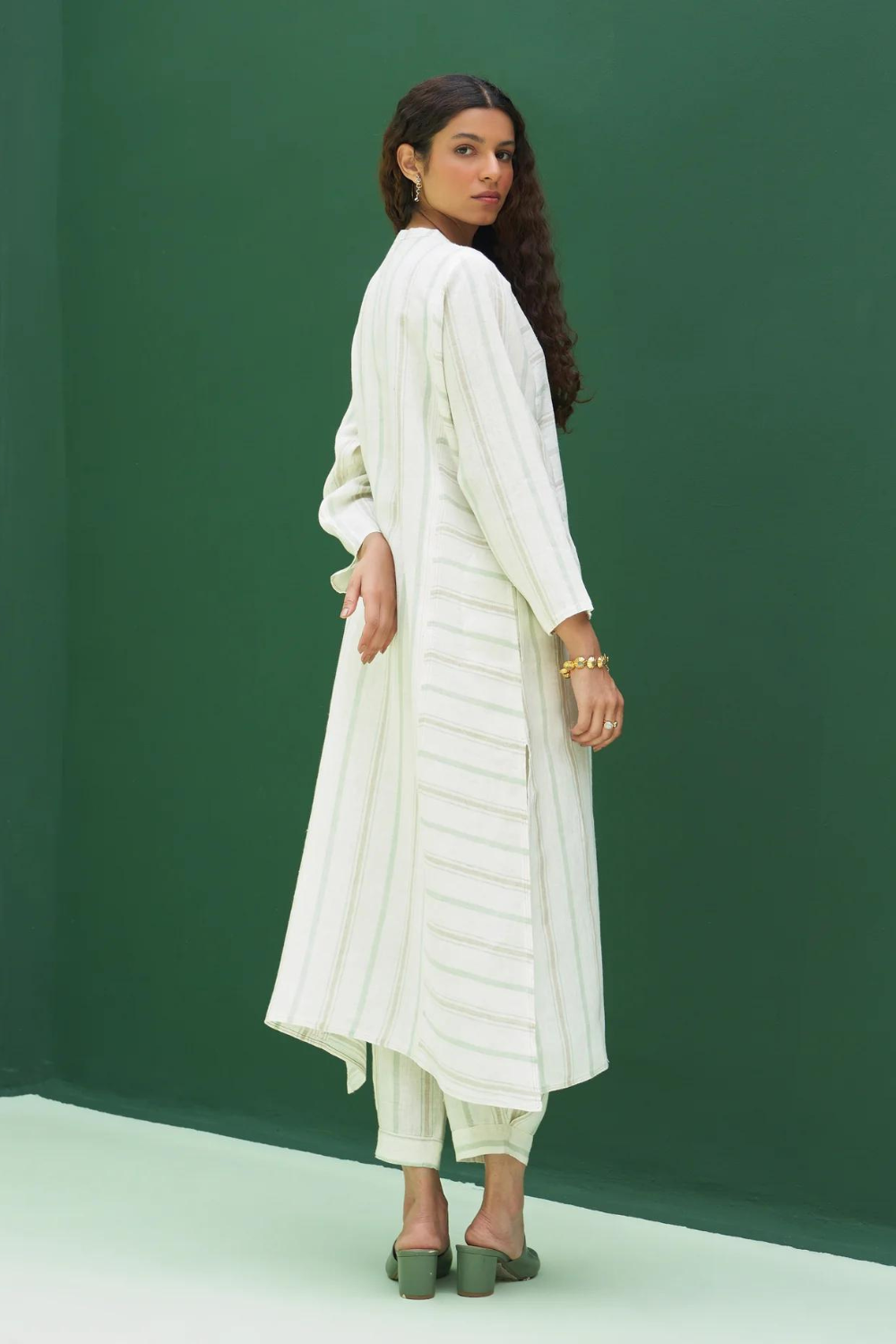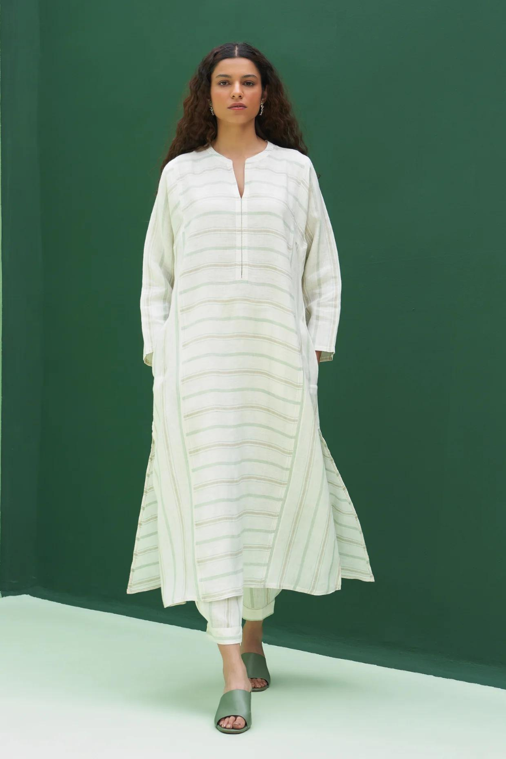 Kurta - A patchwork angrakha style summer kurta designed in our soft handloom striped linen with pockets and side slits finished with a two coloured topstitch detail. It can be worn as a dress, kurta with matching pants or jeans. Pant - Handloom striped linen drawstring pants with an elasticated waist, pleat detail at the ankle with a cuff and pockets. Pairs beautifully with our striped and solid linen shirts, tops and kurtas. Dupatta - The softest handwoven dupatta with a mint and metallic stripe border on beautiful flowing soft sheer linen.