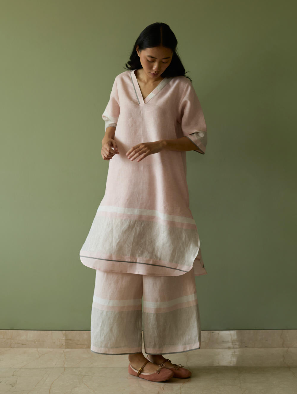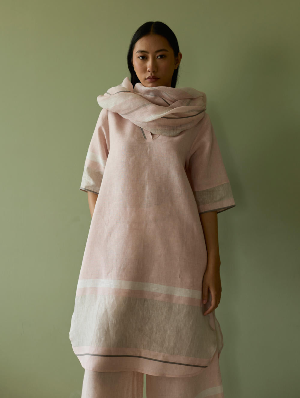 This timeless versatile kurta is designed in our bespoke handwoven soft metallic border linen with a grey selvedge. The Iva Kurta has pockets and is accented with a metallic border at the hemline with a woven grey edging placed at the hemline, neckline and sleeves. The Iva works for all occasions and is one of our year-round favourites.