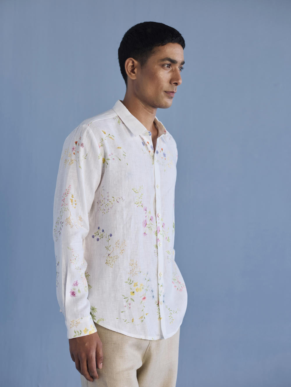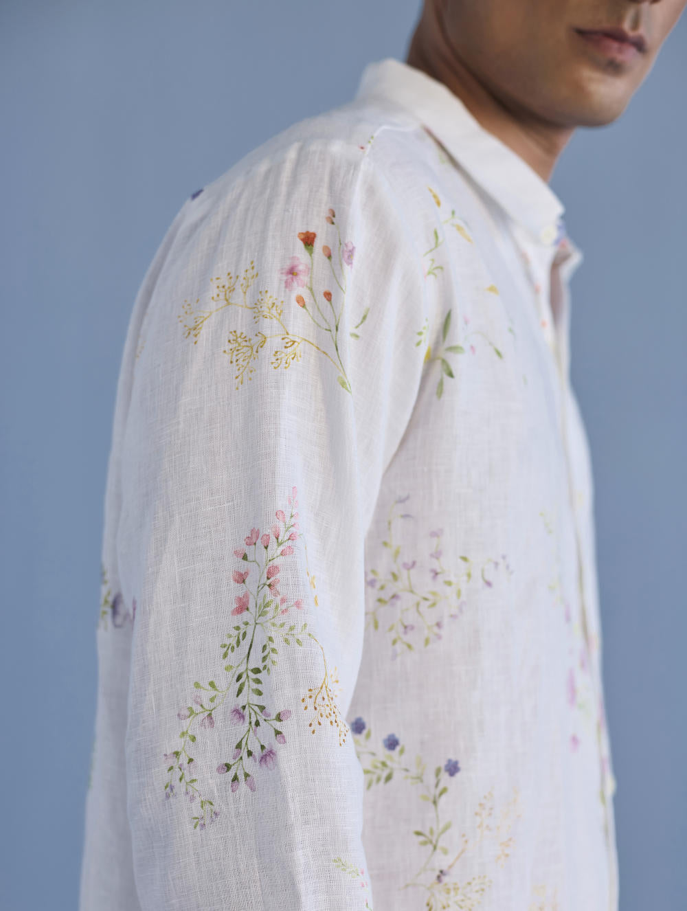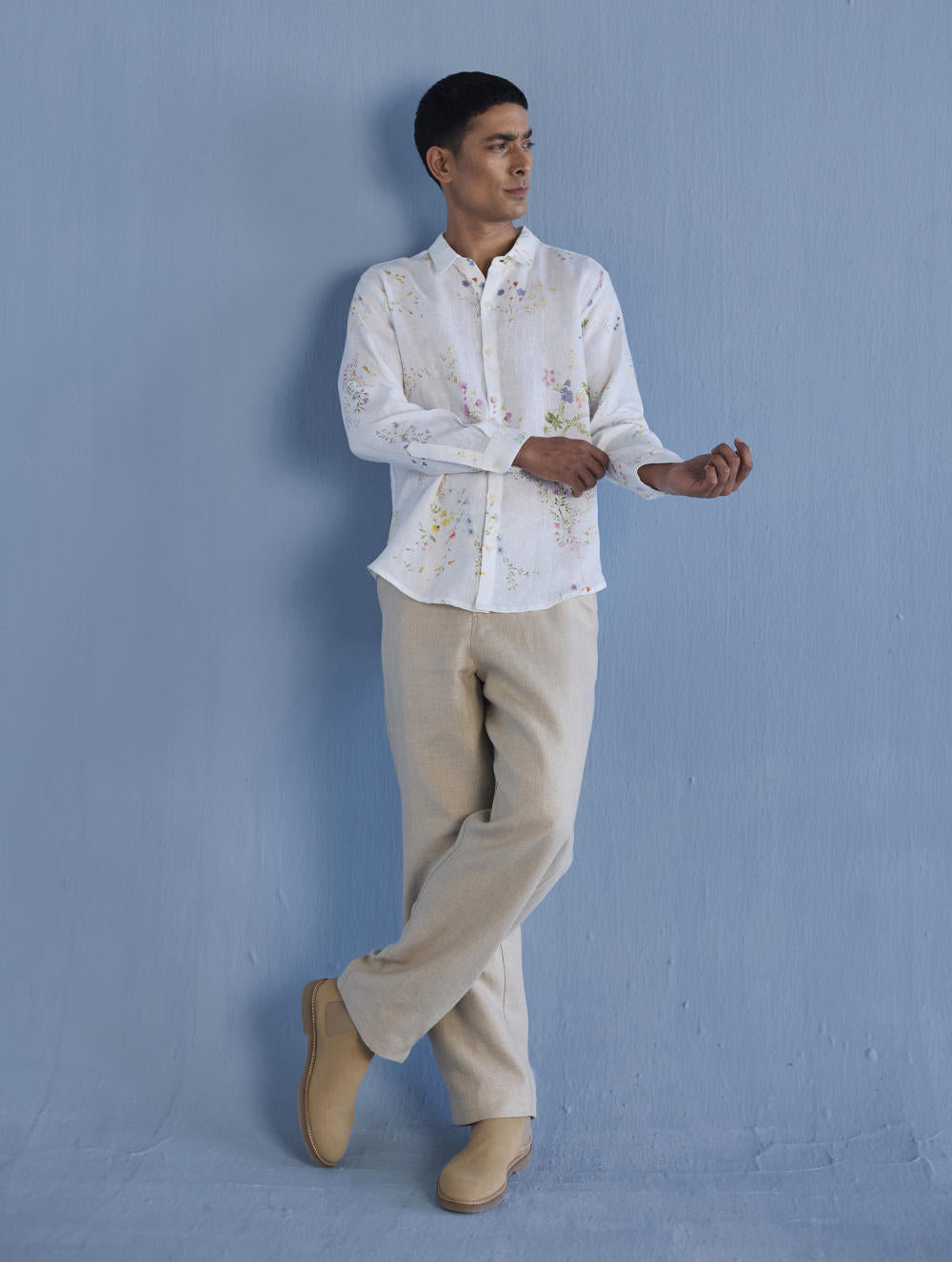 A contemporary hand-painted watercolour floral printed full-sleeve yarn-dyed soft linen shirt. The shirt has two floral prints - a jaal (mesh) floral print and a buta (motif) floral print in multi-colored brush strokes. The shirt pairs beautifully with our linen pants and your favourite denims.