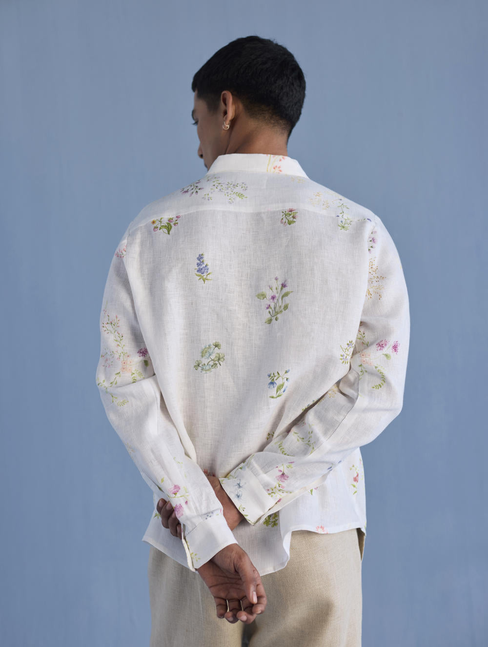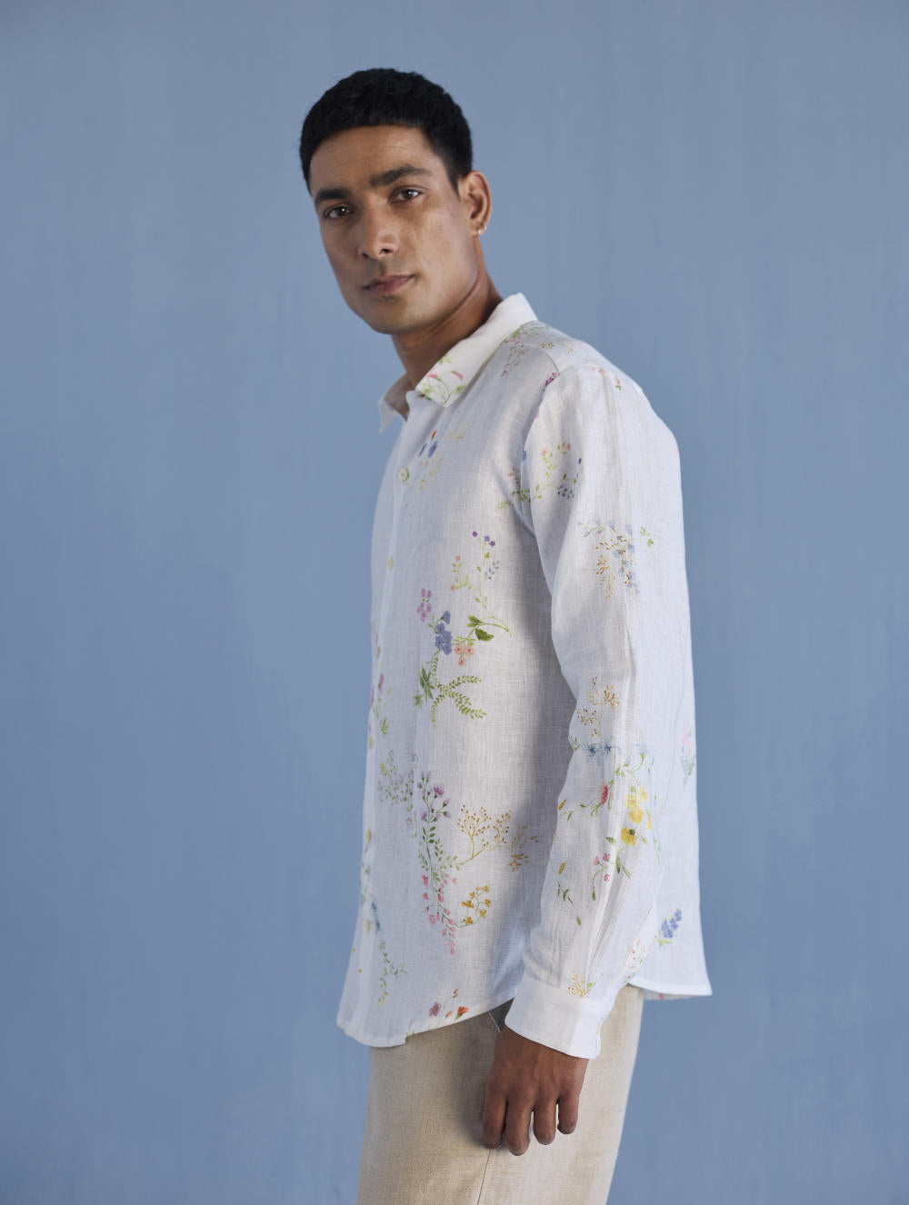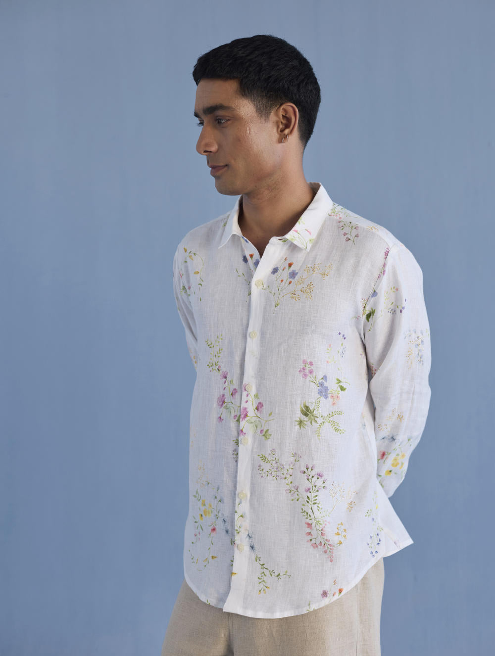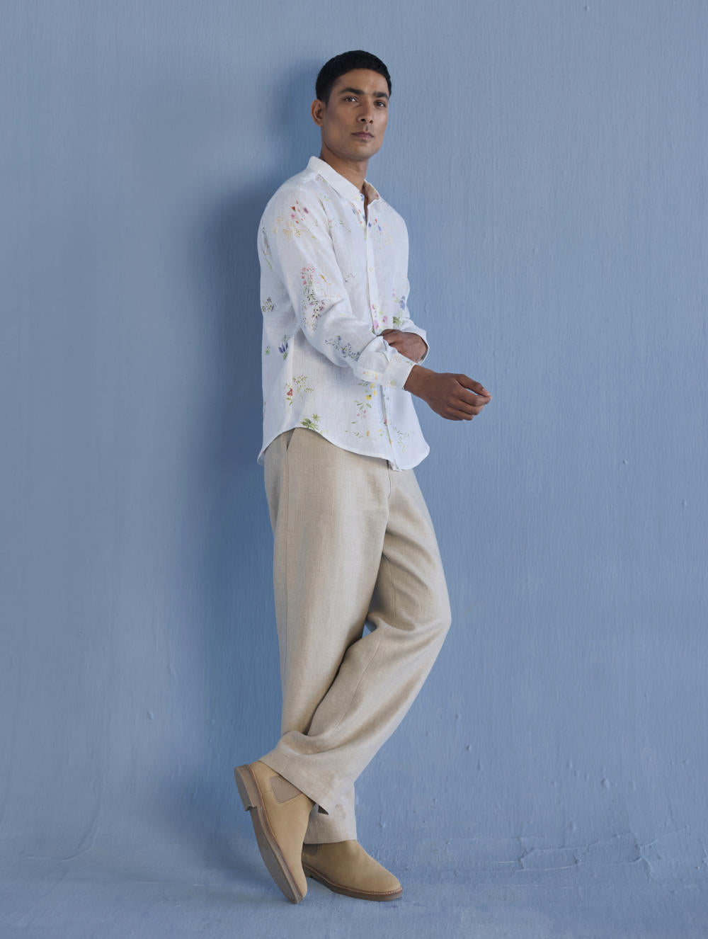 A contemporary hand-painted watercolour floral printed full-sleeve yarn-dyed soft linen shirt. The shirt has two floral prints - a jaal (mesh) floral print and a buta (motif) floral print in multi-colored brush strokes. The shirt pairs beautifully with our linen pants and your favourite denims.