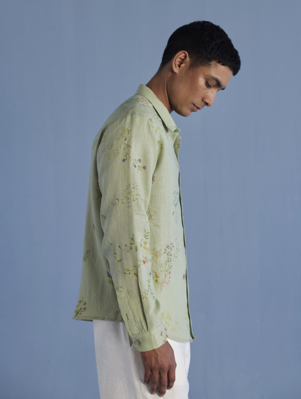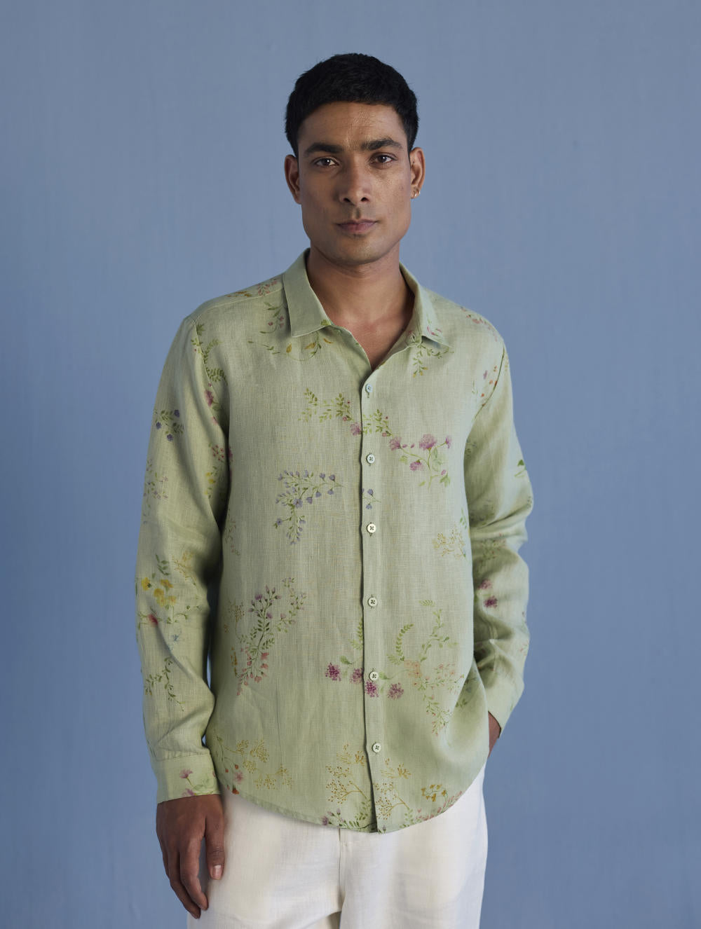 A classic collared full sleeve shirt in the softest pure yarn-dyed linen made dressy with subtle and intricate hand-embroidery - a beautiful floral border hand-embroidered with intricate thread embroidery and micro hand-embroidered beadwork running across across one side of the button placket, hemline, cuff finished with a motif on the collar. Perfect for a soft statement look.