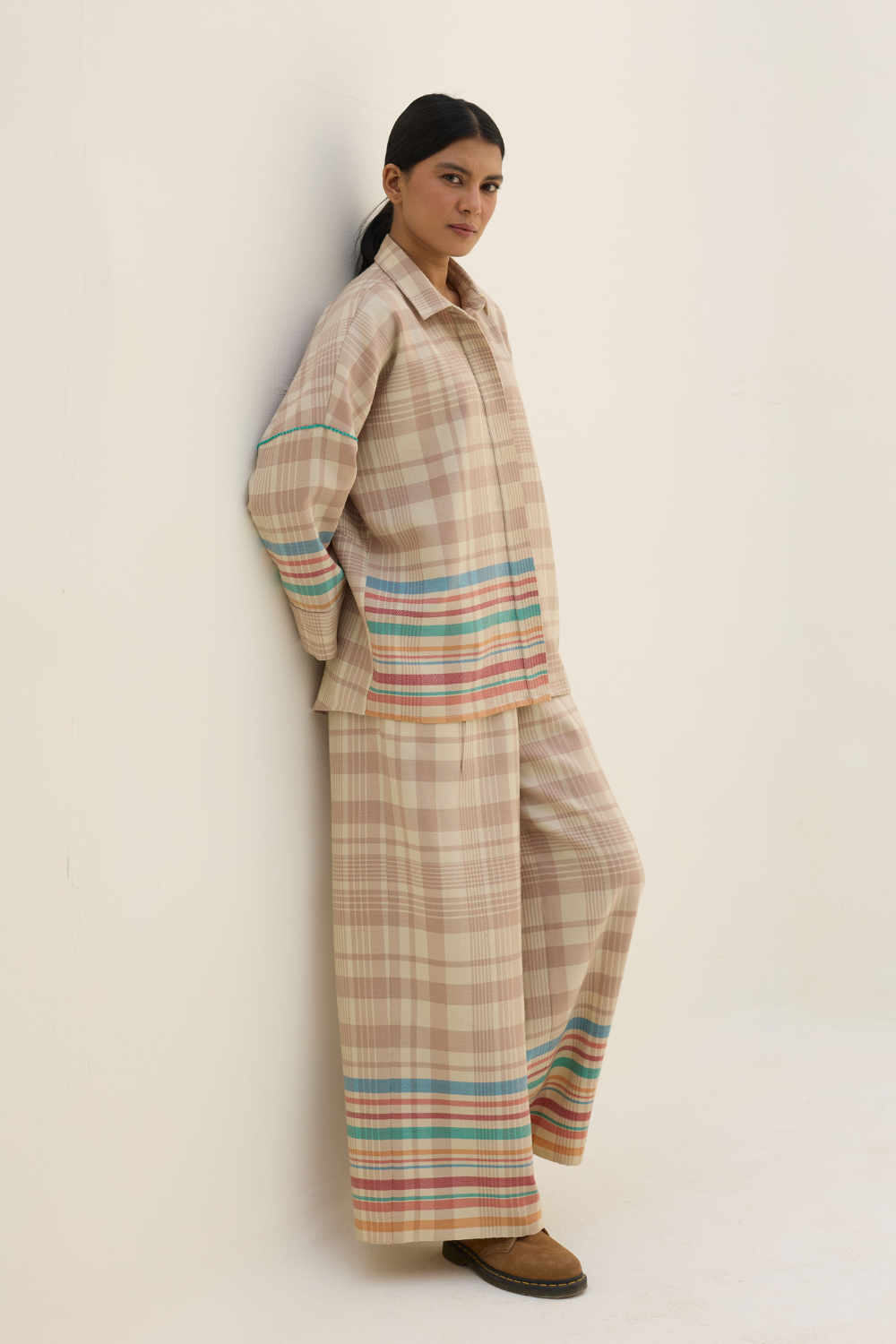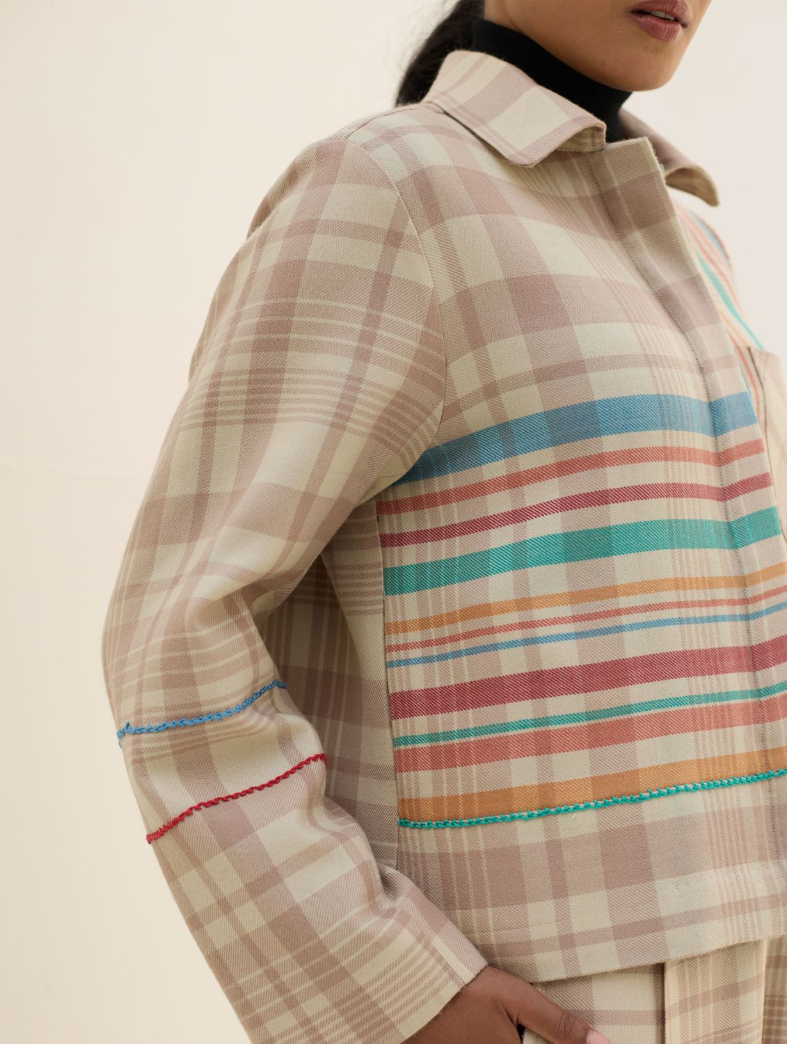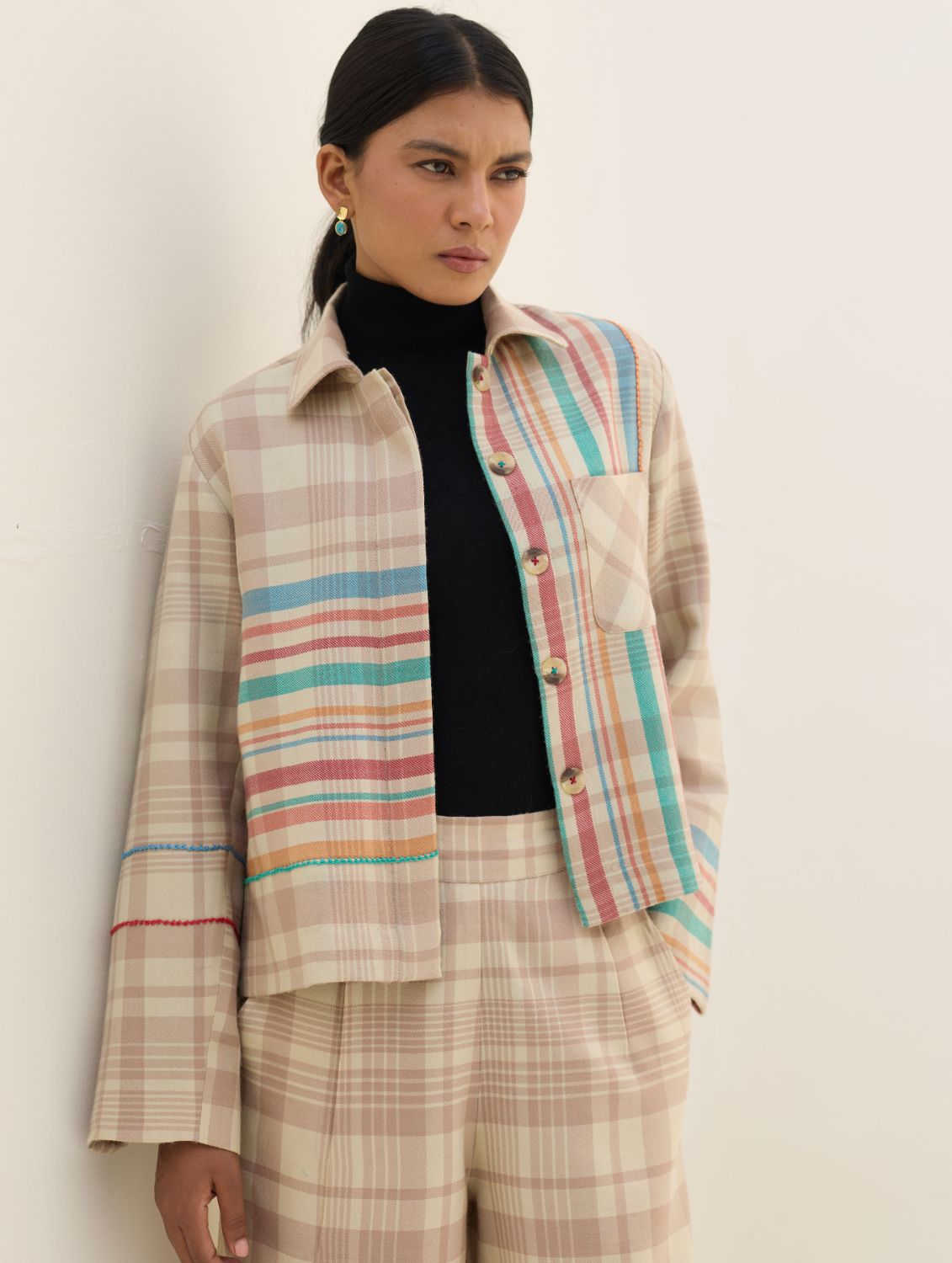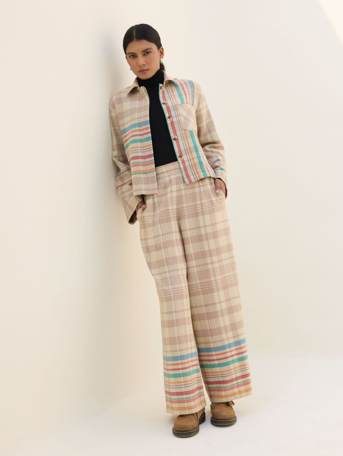 Jacket- The Noelle Shacket is designed in our soft merino wool woven in a two-toned check with a statement multi-coloured striped border, lined with a timeless handloom linen. This versatile shacket features a soft collar, button down concealed placket with wool-lined side pockets for warmth and delicate hand-stitch knotting details for texture and colour. The Noelle is designed to pair effortlessly with coordinated trousers or everyday basics. Layer it open over your favourite sweaters or shirts - perfect for a winter afternoon or evening.