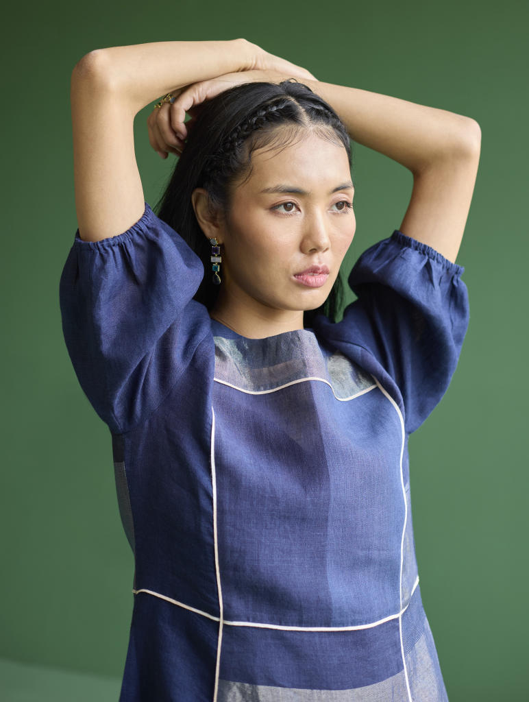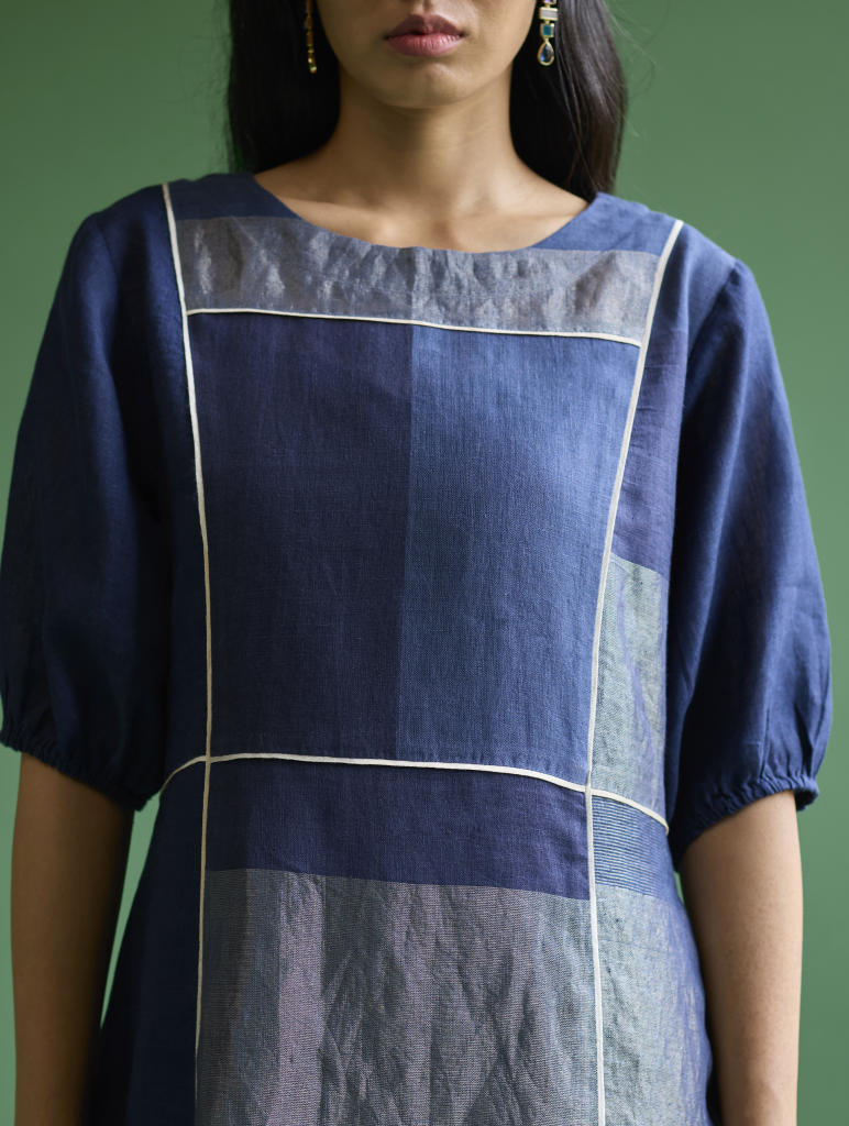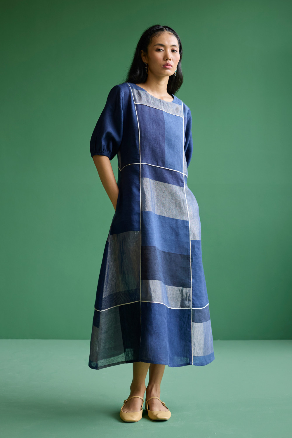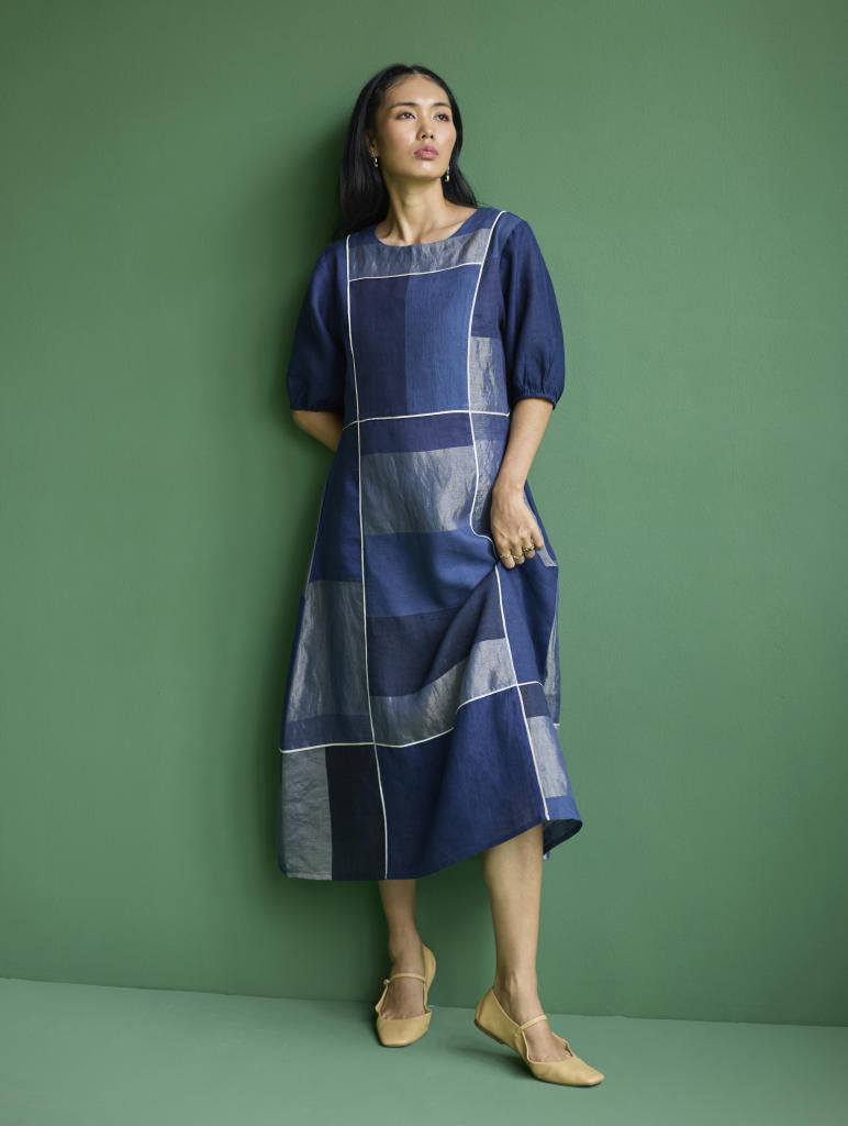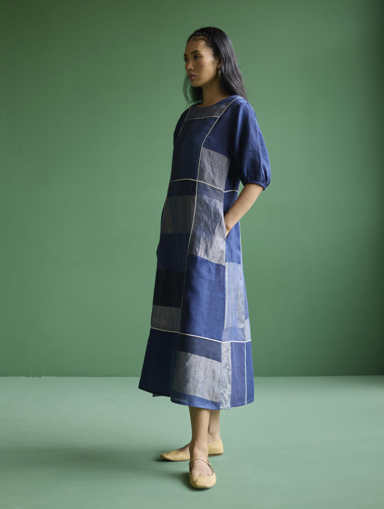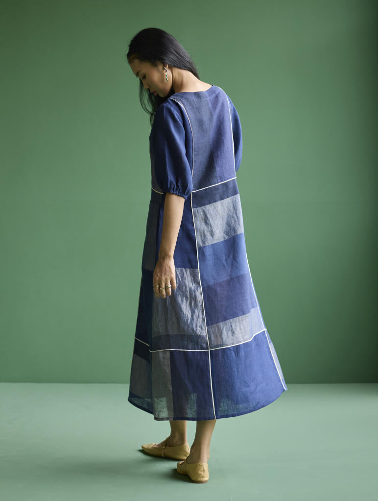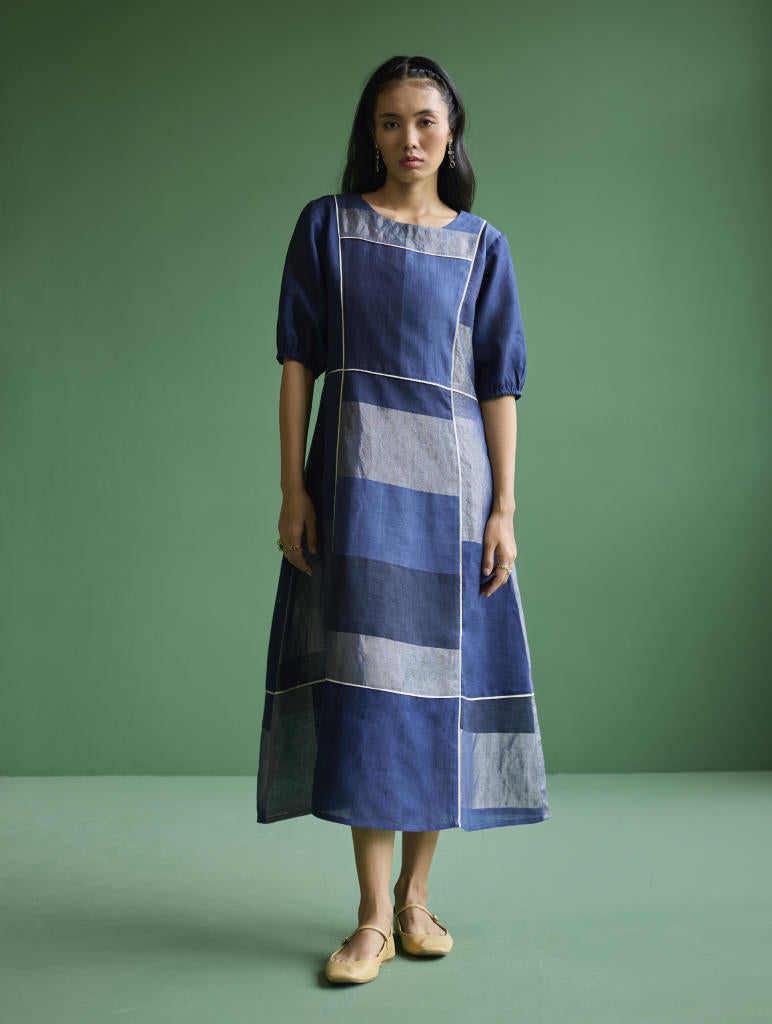 A statement patchwork linen dress designed in our shades of navy broad stripe metallic linen with contrasting linen piping detail. The Sehr Dress has a round neck, short puff sleeves and comfortable pockets. Perfect for an afternoon get-together or a dinner with friends and family.