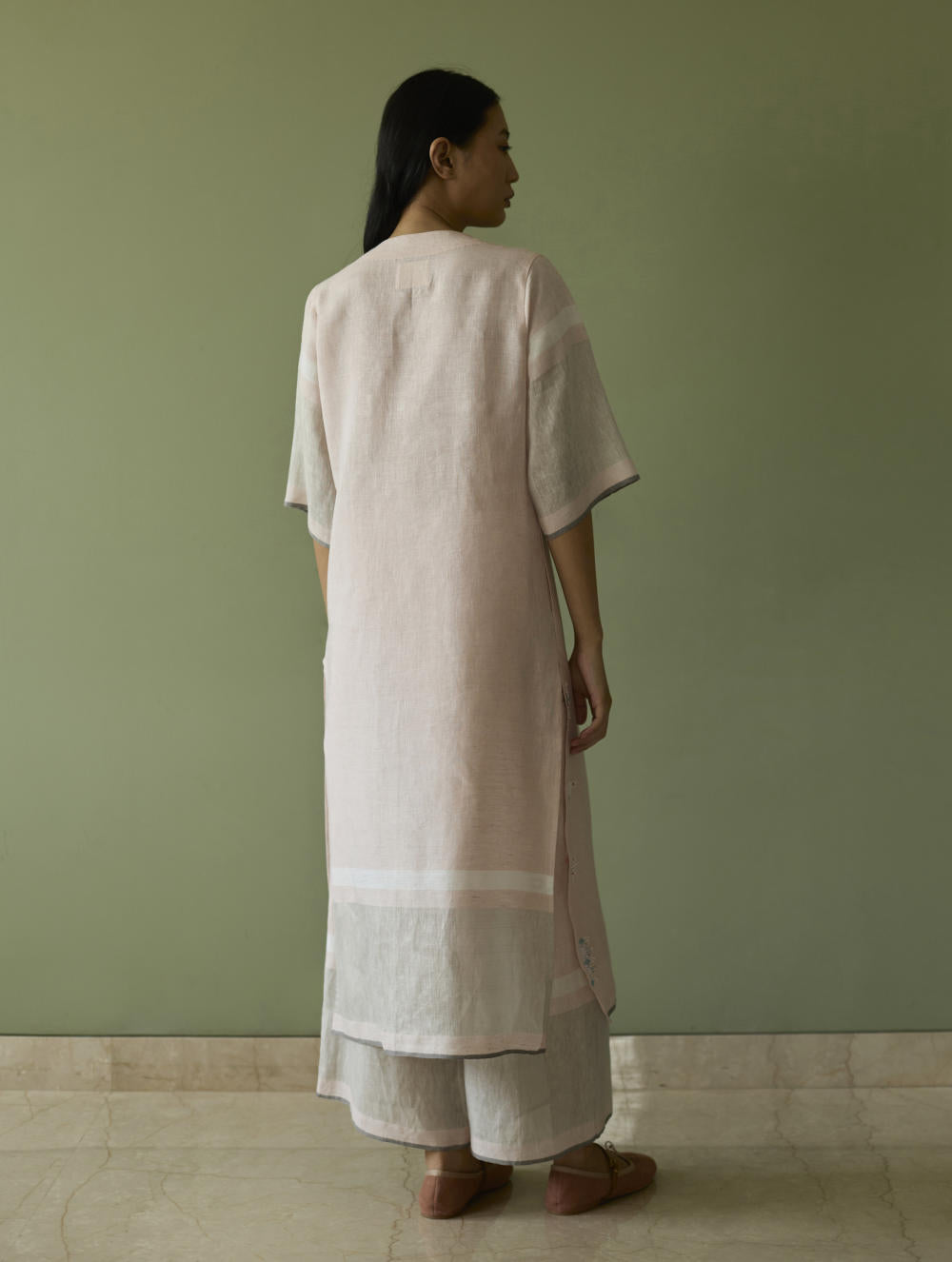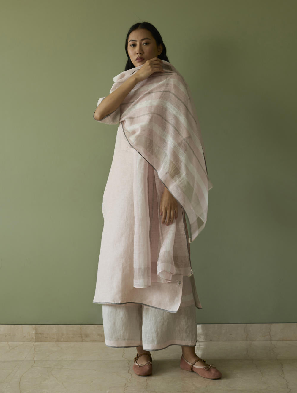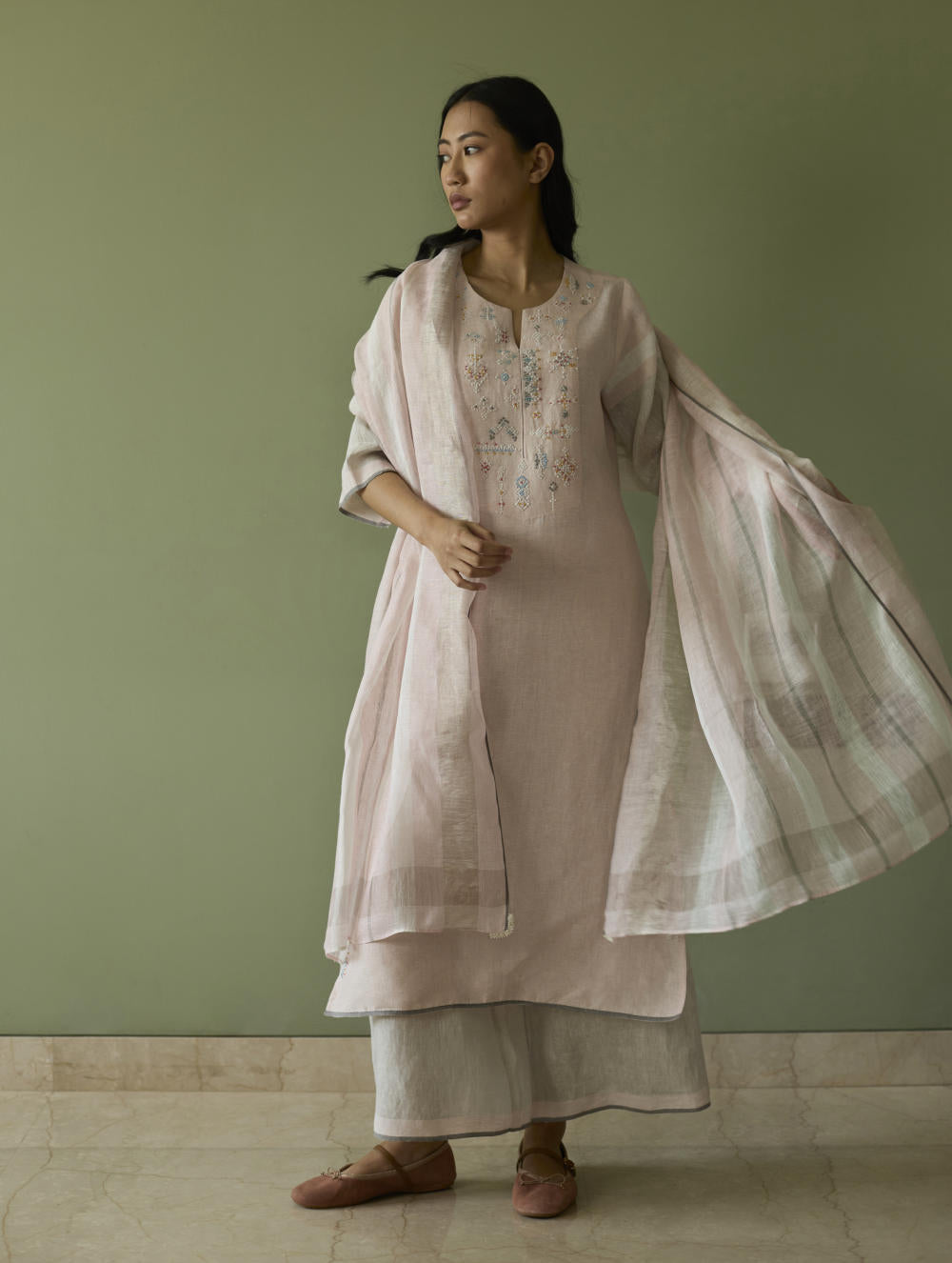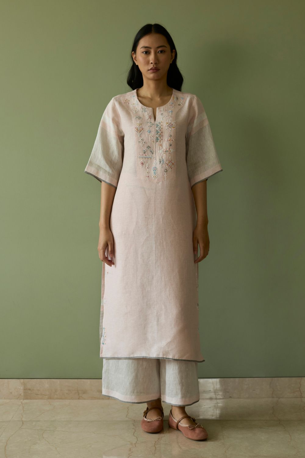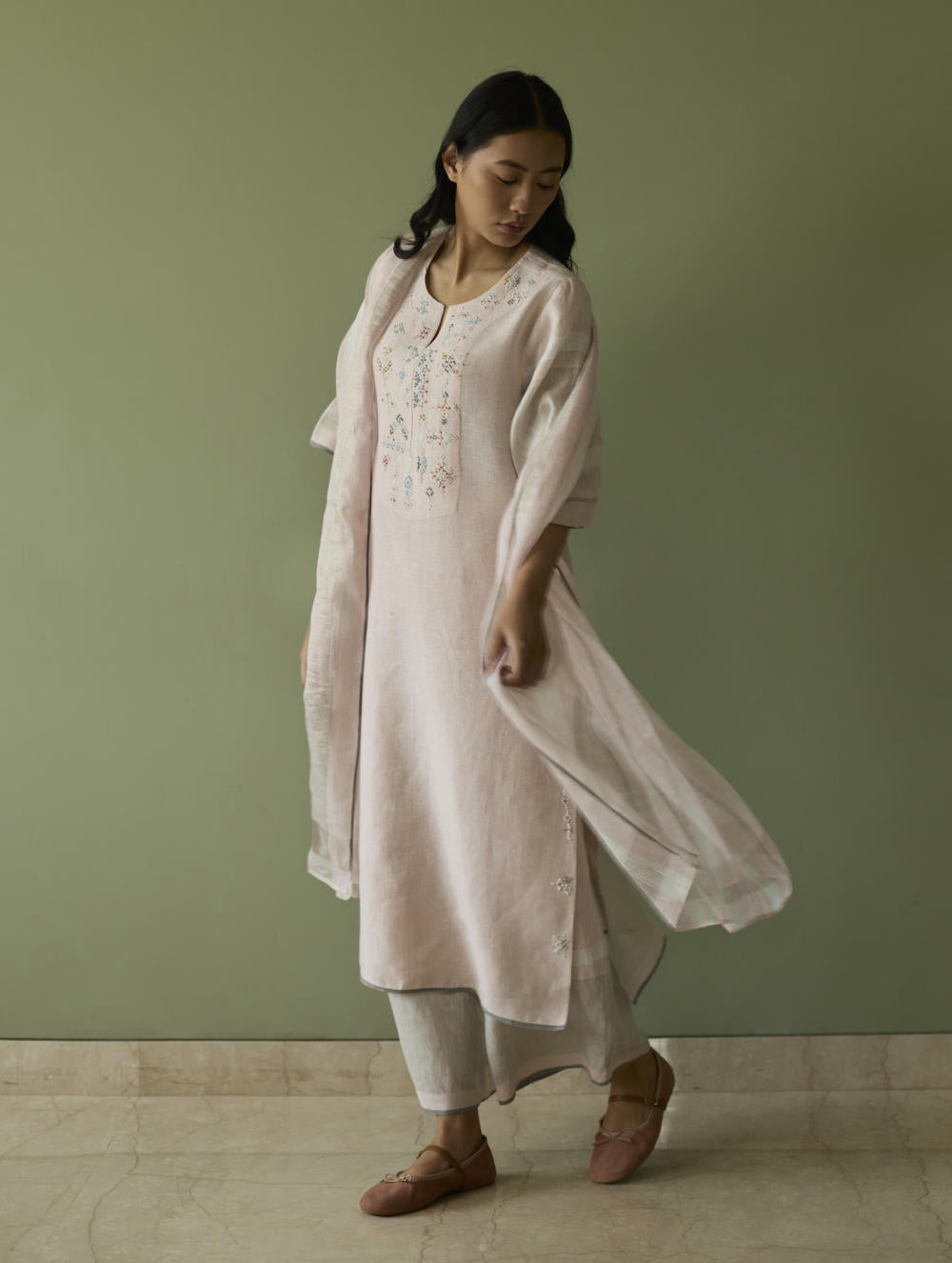 A signature Manan kurta crafted from our soft handwoven metallic border linen with a soft grey selvedge. Hand-embroidered with intricate motifs, along the neckline and side slits, inspired by the timeless age-old Tangalia weave. The hand-embroidery is brought to life through meticulous multi-coloured french knots in threads and fine beadwork, creating a subtle pattern of texture and colour. Wear Vira with our flared pants for a statement, yet comfortable look.