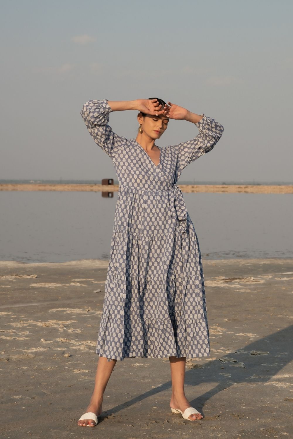 Wrap dresses are versatile and can be tied in multiple ways. This one is blue hand-block printed in a soft lotus print and has loads of volume and flounce. The puffed sleeves complete the look and tie it all together! Dress is down for a sunday brunch, or dress is up for an intimate dinner with friends.