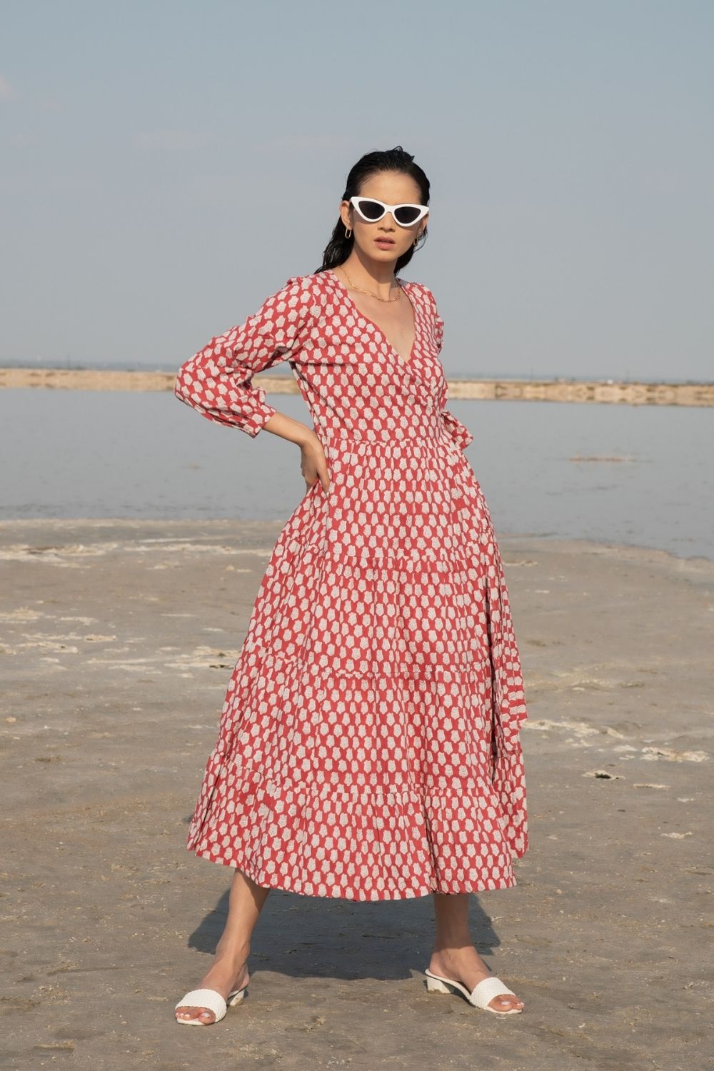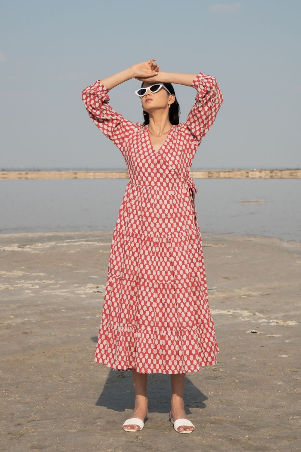 Wrap dresses are versatile and can be tied in multiple ways. This one is red handblock printed in a soft lotus print and has loads of volume and flounce. The puffed sleeves complete the look and tie it all together! Dress is down for a sunday brunch, or dress is up for an intimate dinner with friends.
