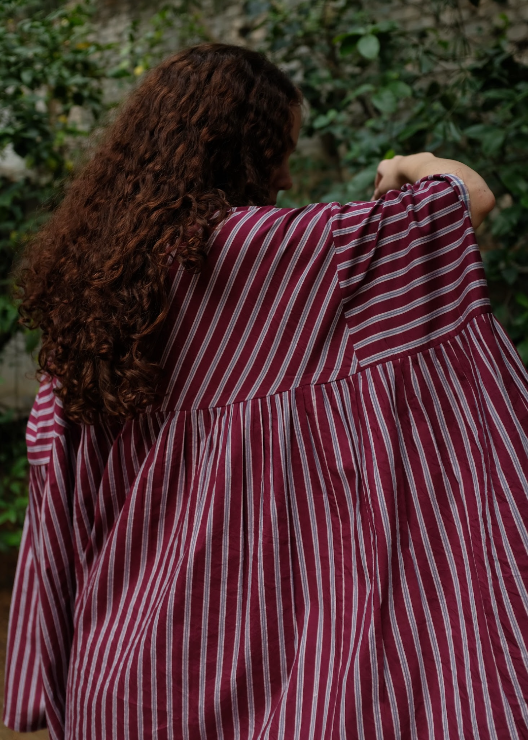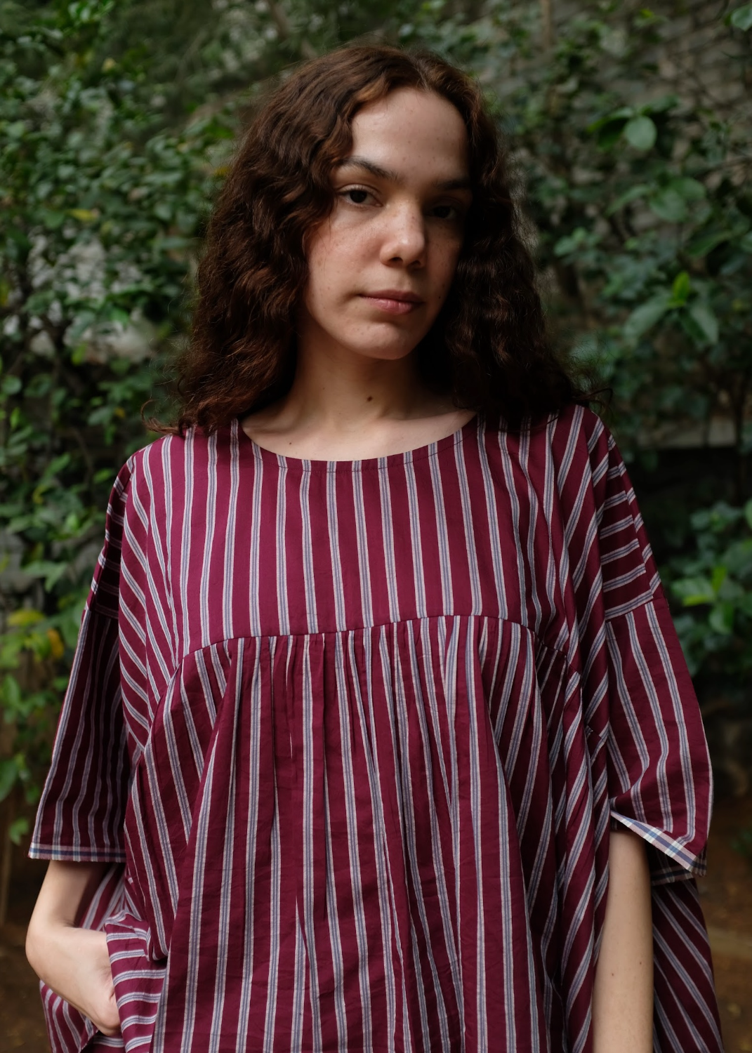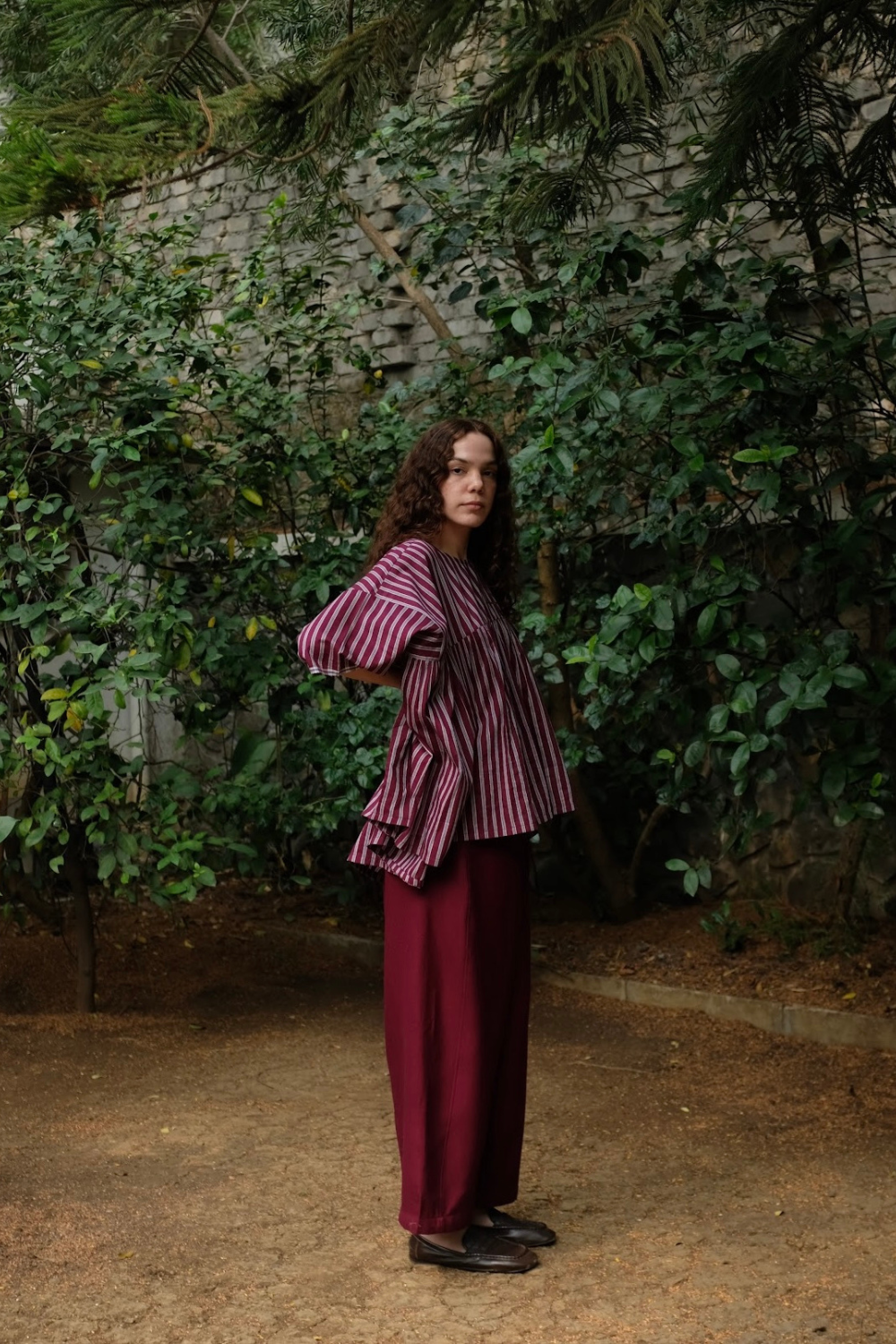A playful, one-size-fits-all, voluminous gathered soft cotton silk top with beautiful wine stripes and an uneven hemline. The top is elegantly fastened at the back with a button.