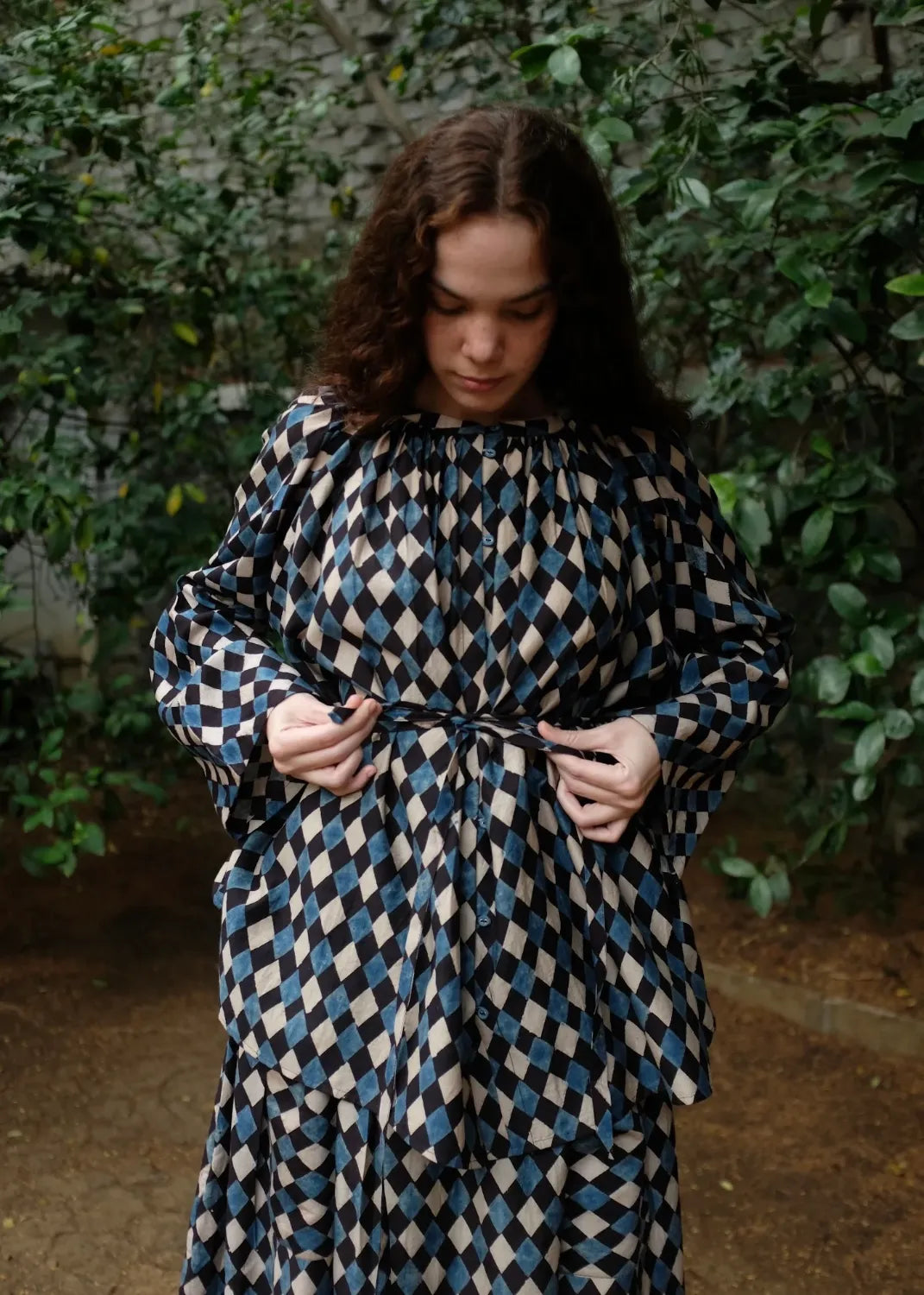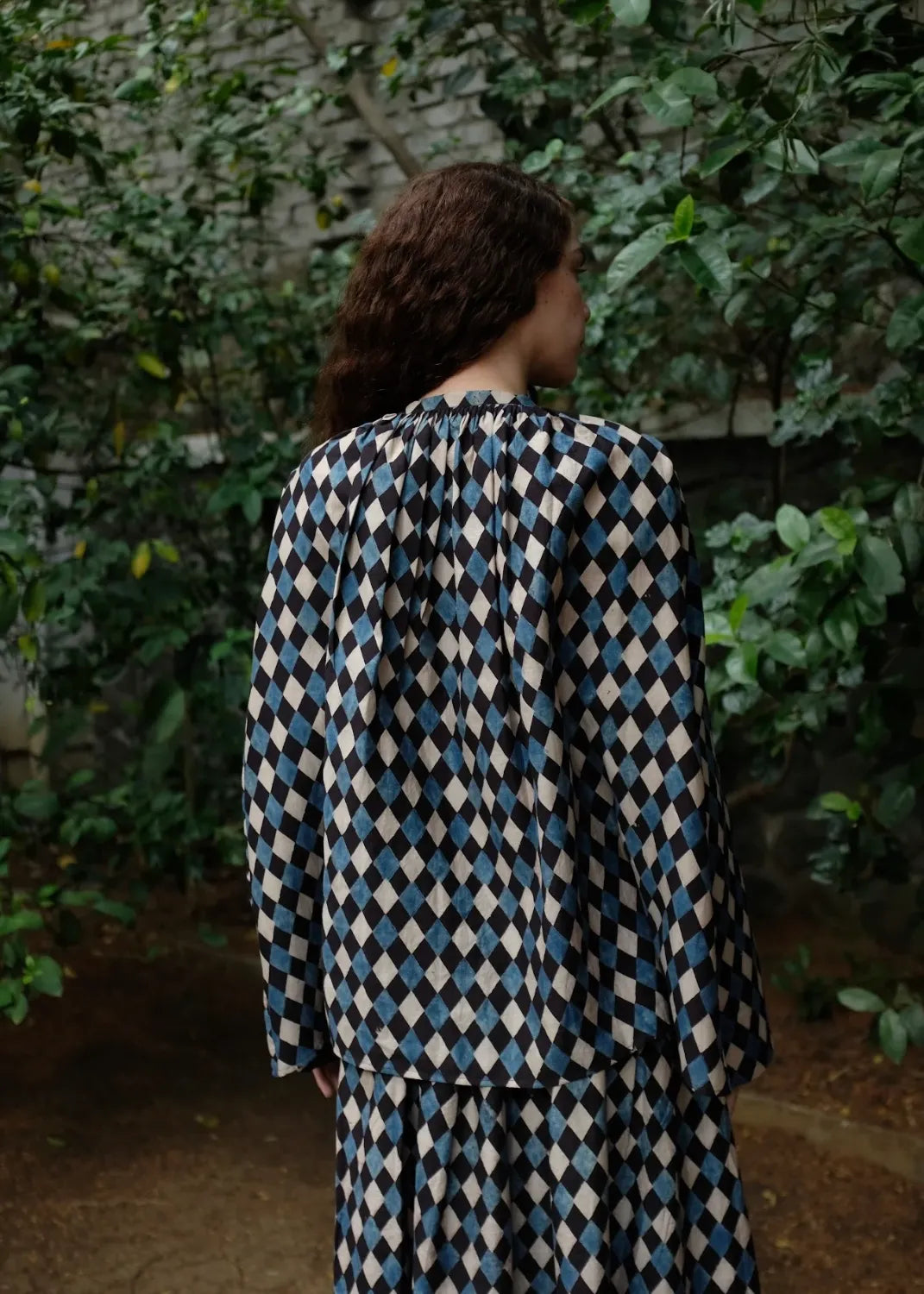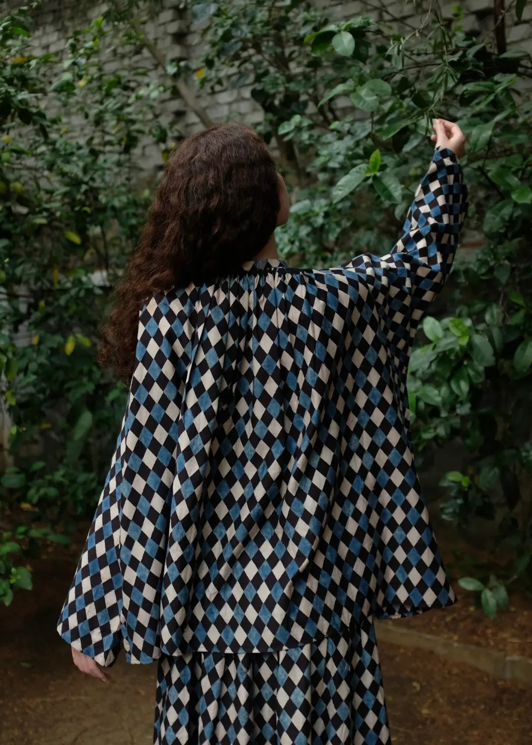 A versatile top crafted from handwoven cotton silk fabric, hand-printed using the 'Ajrakh' technique. Soft gathers fall from the neckline at the front and back, creating an easy, fluid silhouette. A full-length placket extending to the hem is finished with loop-and-button fastening, while the free-size design offers a relaxed, inclusive fit shaped by craftsmanship and comfort. The garment comes with a thin belt that can be used to define the waist.