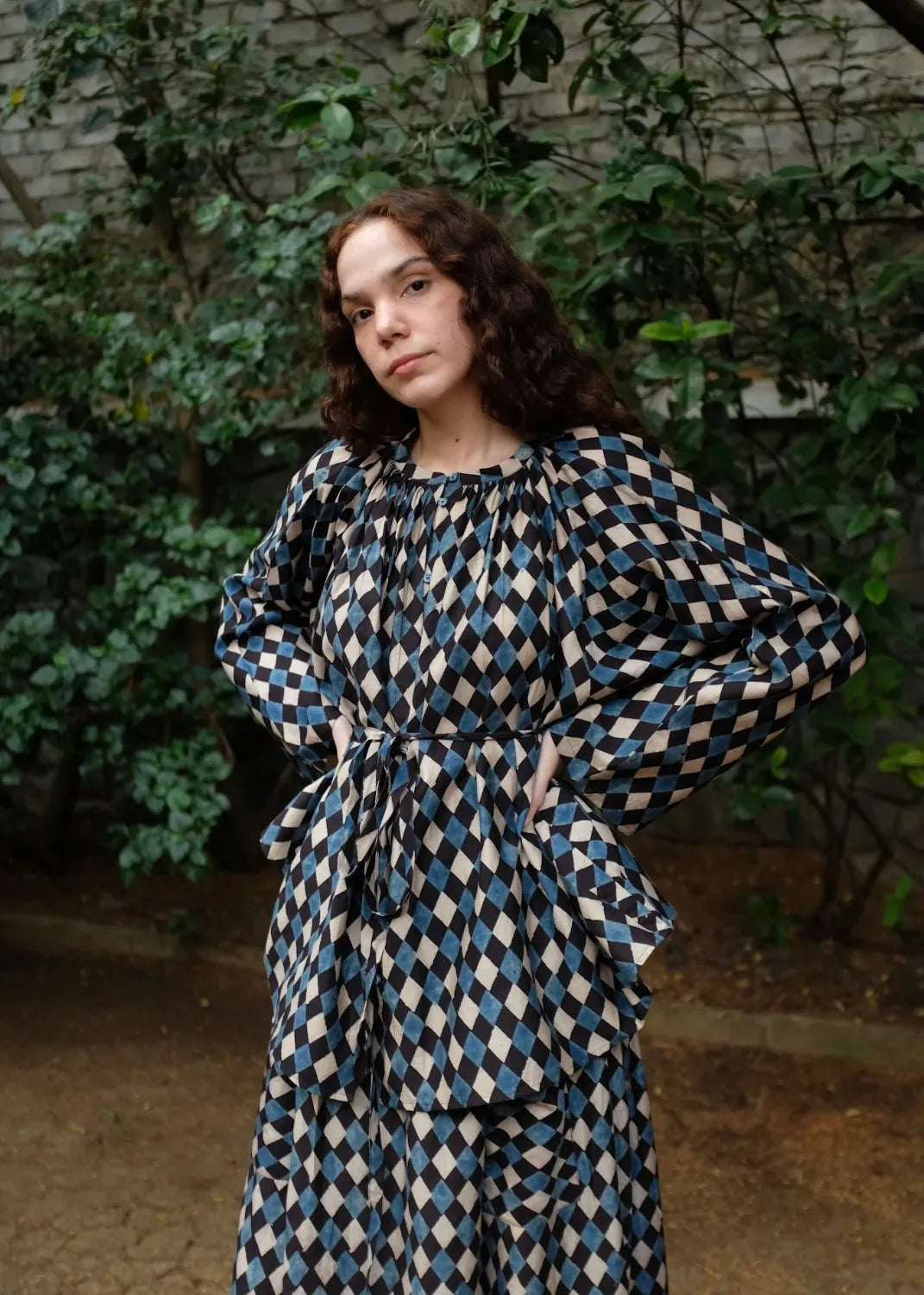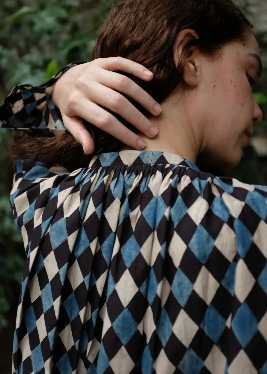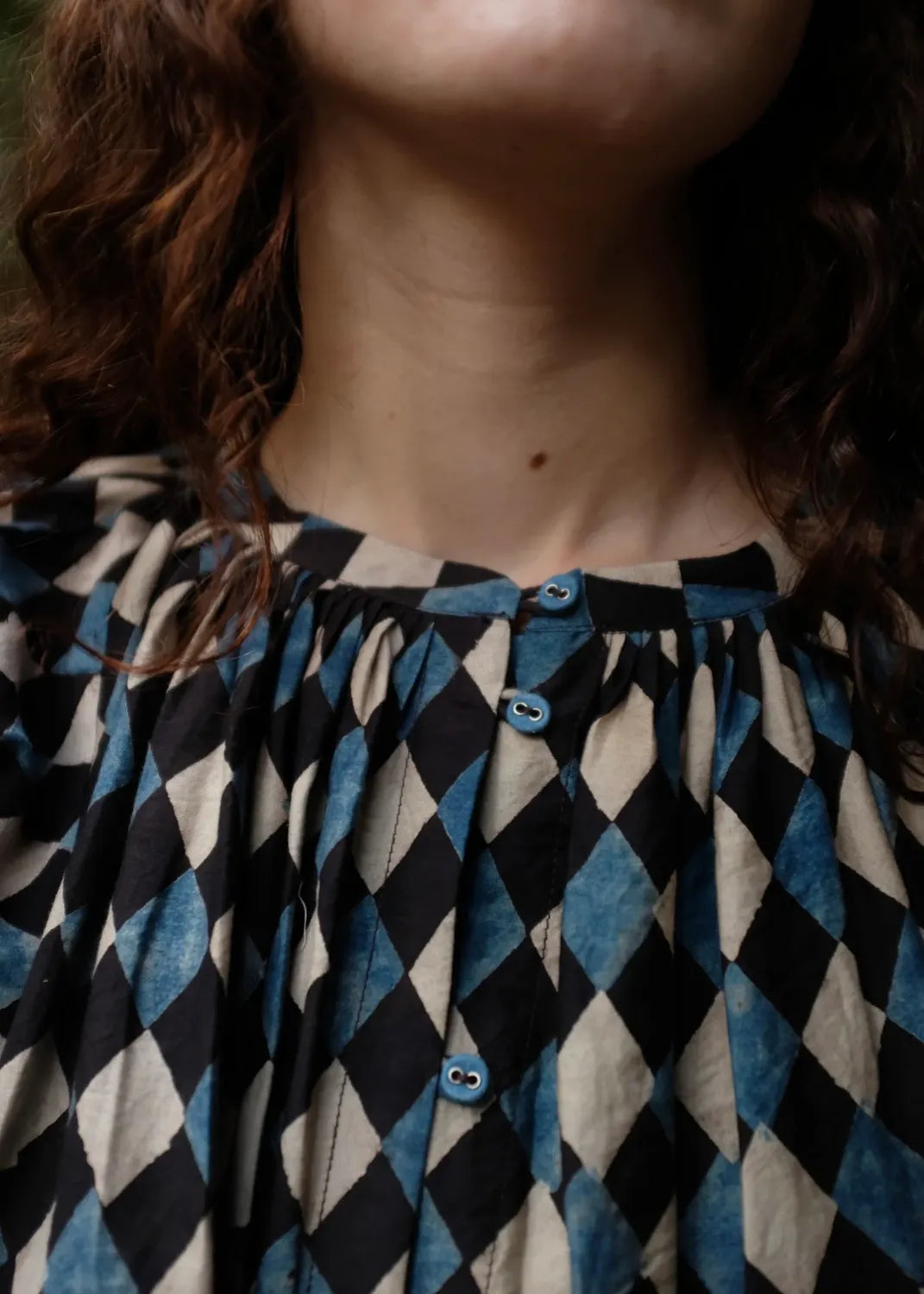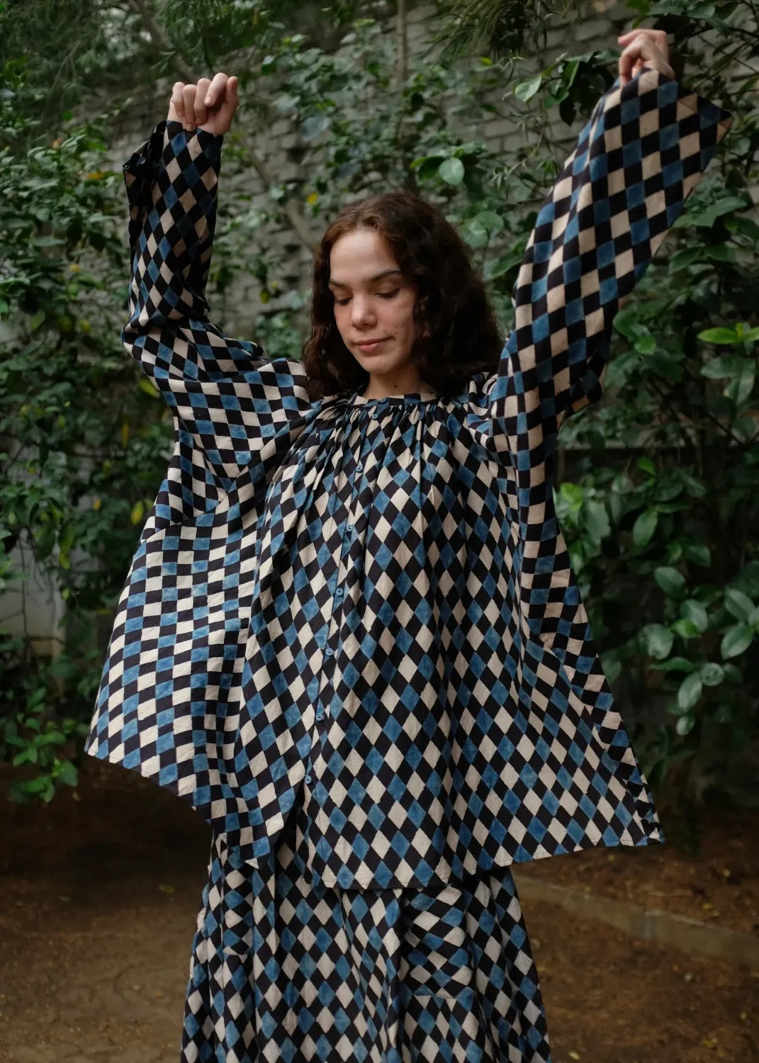 A versatile top crafted from handwoven cotton silk fabric, hand-printed using the 'Ajrakh' technique. Soft gathers fall from the neckline at the front and back, creating an easy, fluid silhouette. A full-length placket extending to the hem is finished with loop-and-button fastening, while the free-size design offers a relaxed, inclusive fit shaped by craftsmanship and comfort. The garment comes with a thin belt that can be used to define the waist.