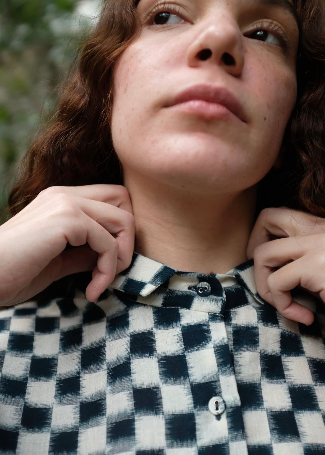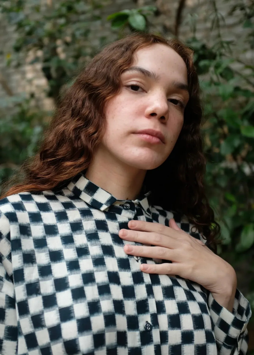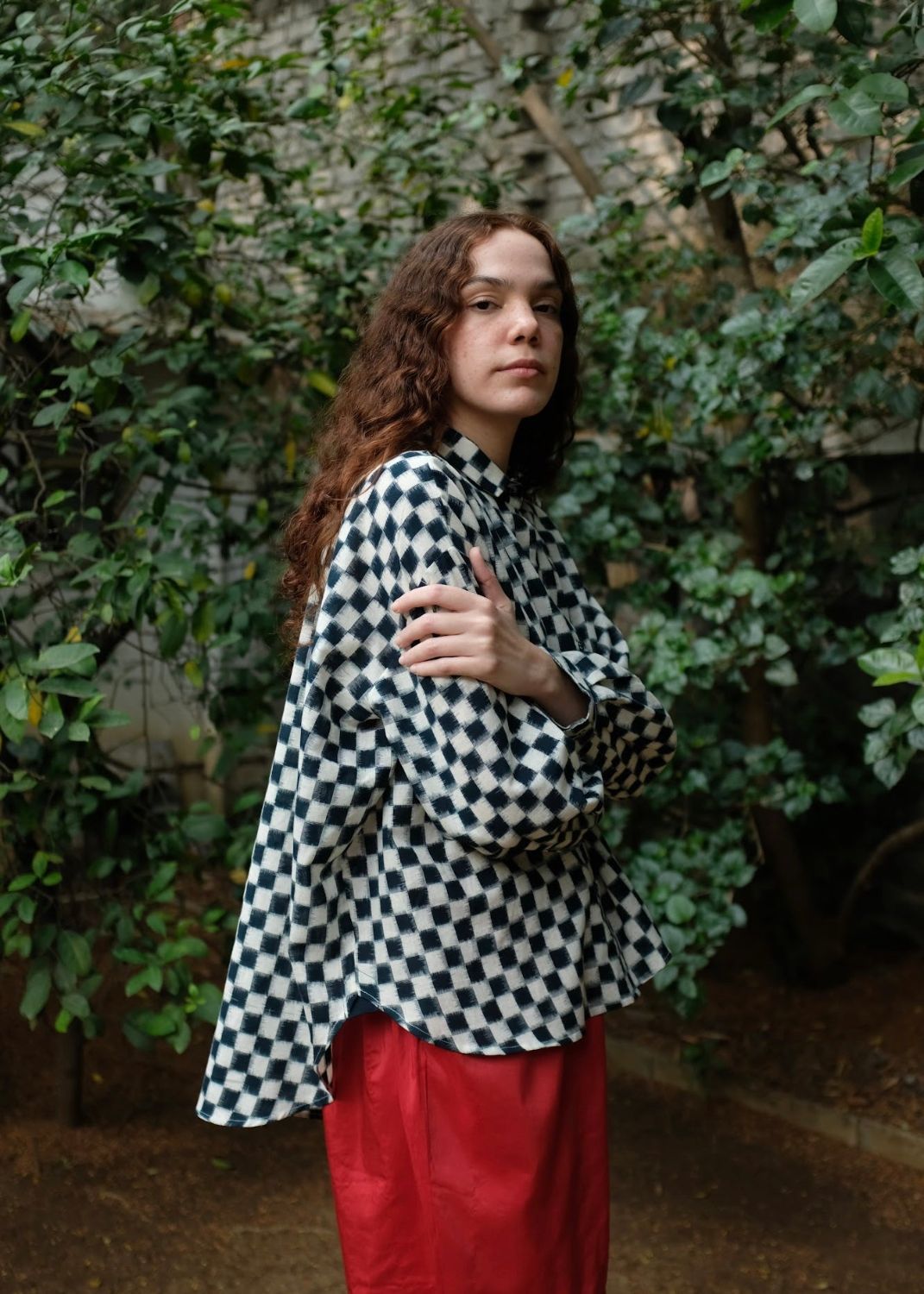 The shirt draws inspiration from the minimal aesthetics of Japenese dressing - simple but well-made. A loose-fit shirt defined by ease and thoughtful detailing, cut from a heritage Indian textile, the double Ikat cotton. Shaped with a uniquely styled petite collar, it features sleeves that finish in soft pleats and a refined cuff. Gentle gathers fall from the back neckline, lending the silhouette a breezy movement while maintaining a quiet, sophisticated presence.