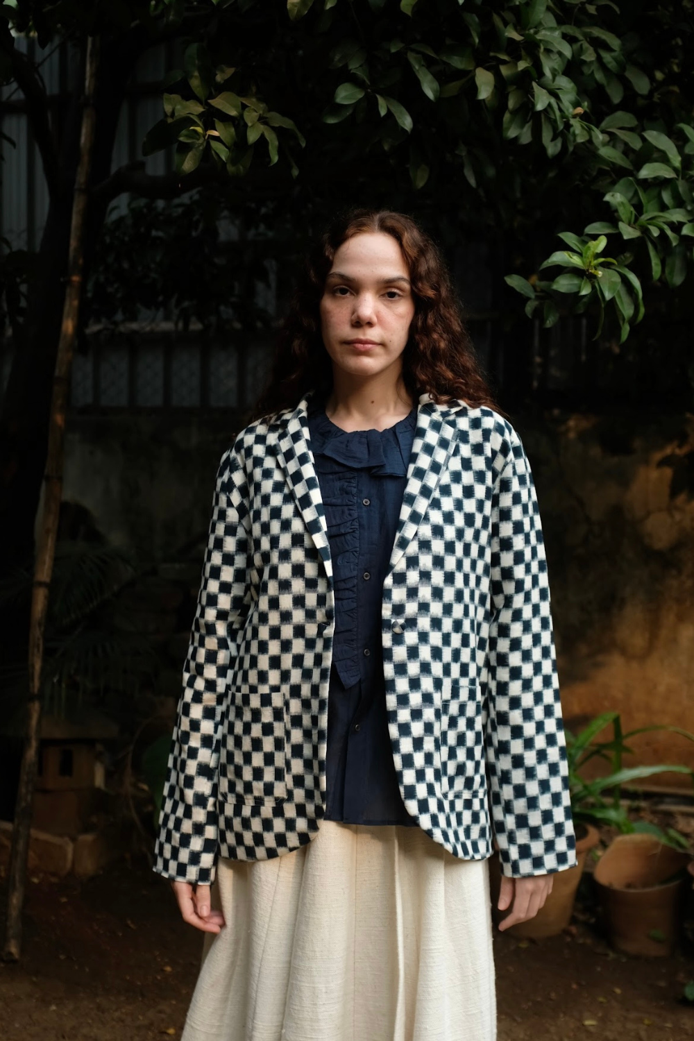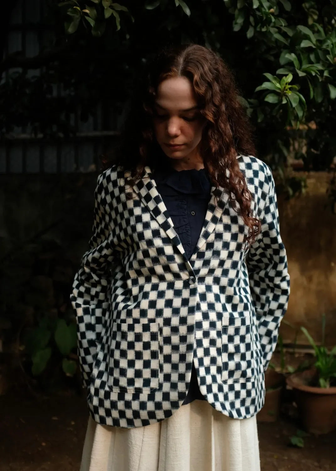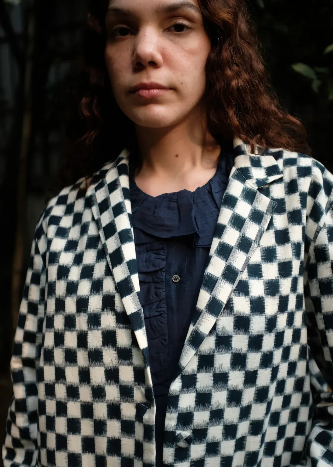 Traditional Indian weave reimagined to form a classic day coat. Handwoven medium weight double ikat fabric crafted using natural dyes, this labour intensive textile is our favourite from this lot. An easy coat that works as a light layer, lined with soft gamcha checks in kora cotton and finished with long lapels and patch pockets.