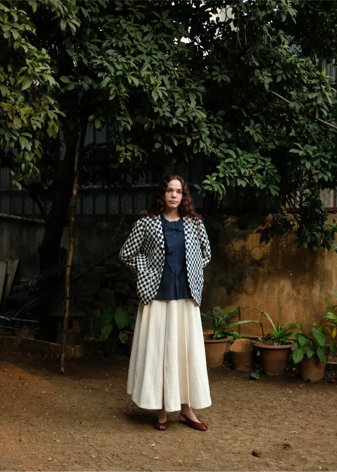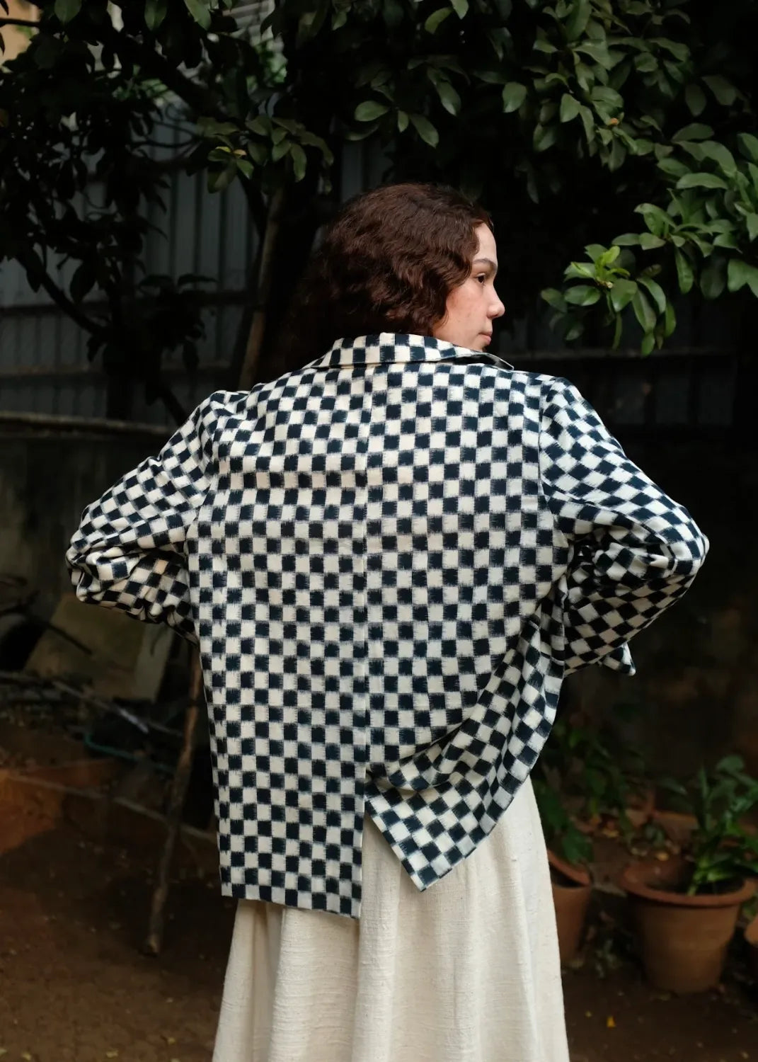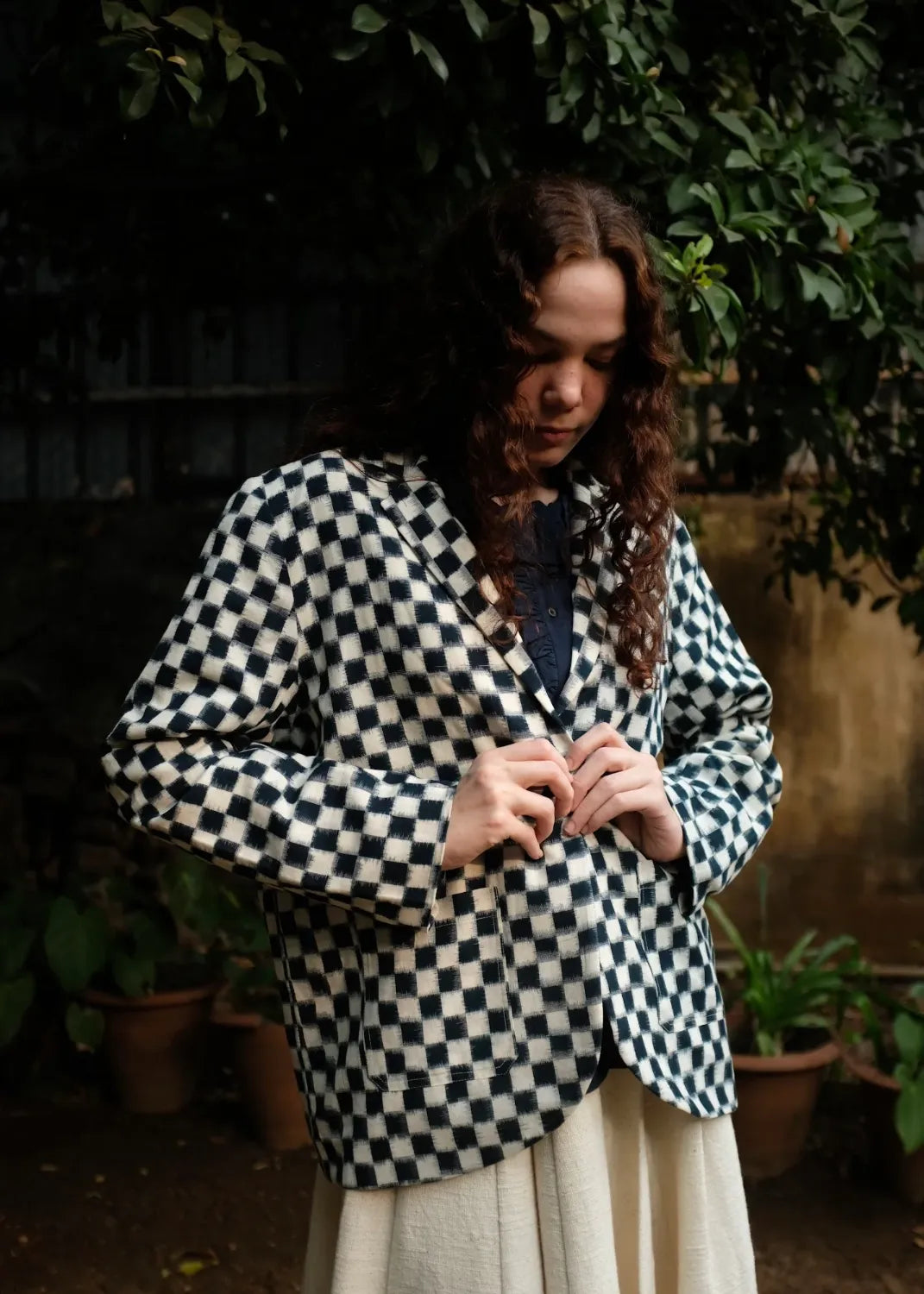 Traditional Indian weave reimagined to form a classic day coat. Handwoven medium weight double ikat fabric crafted using natural dyes, this labour intensive textile is our favourite from this lot. An easy coat that works as a light layer, lined with soft gamcha checks in kora cotton and finished with long lapels and patch pockets.