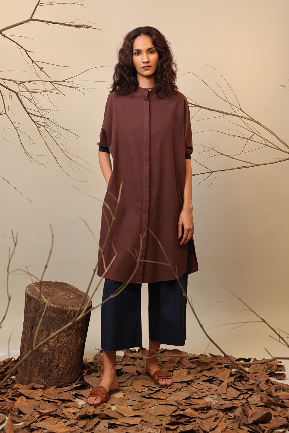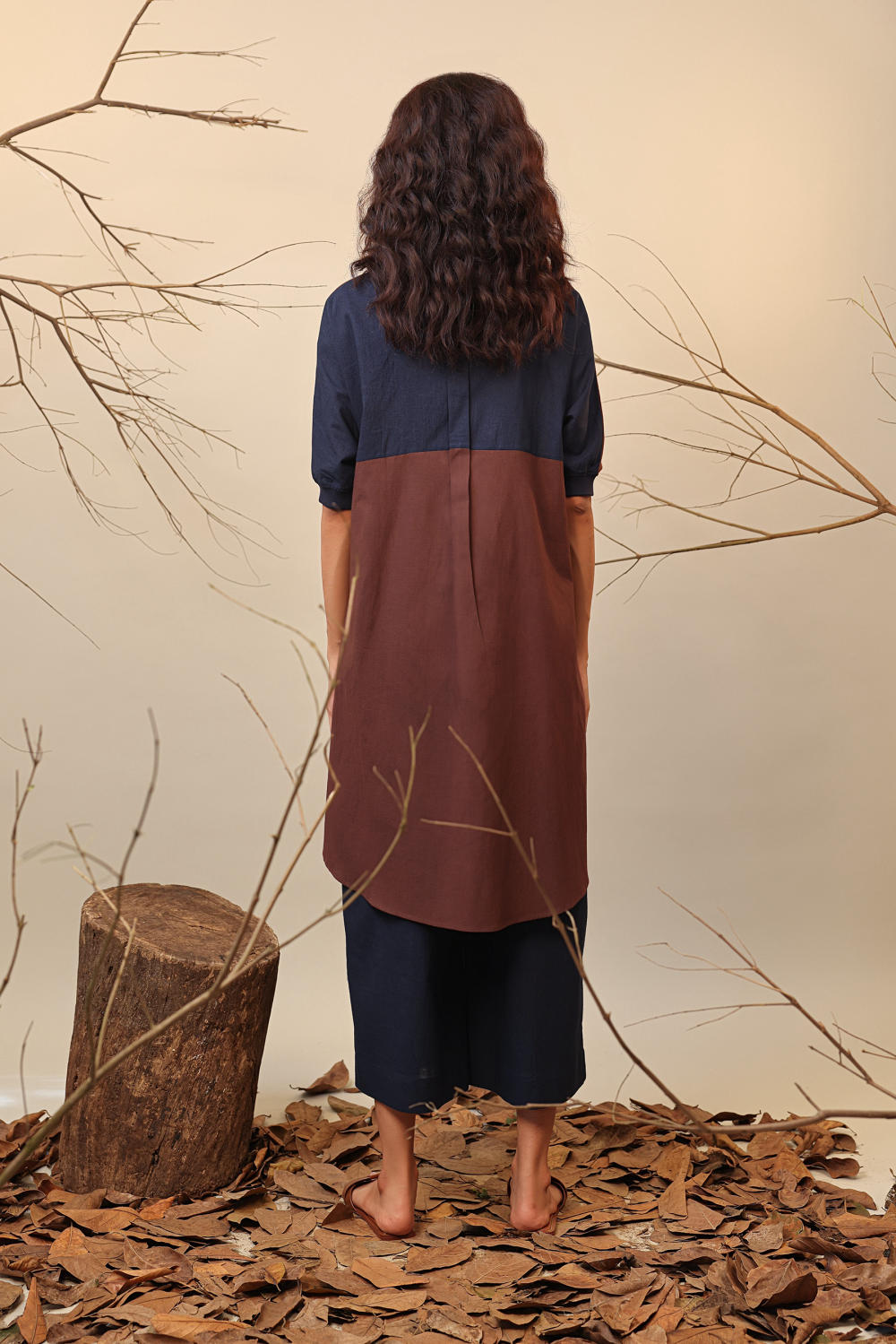 Colour block long shirt tunic with contrast back yoke, front button opening and contrast rib cuffs with side pockets. Team it up with our capri pants and complete the look. Please Note: Scarf and Pants are not included in this style listing