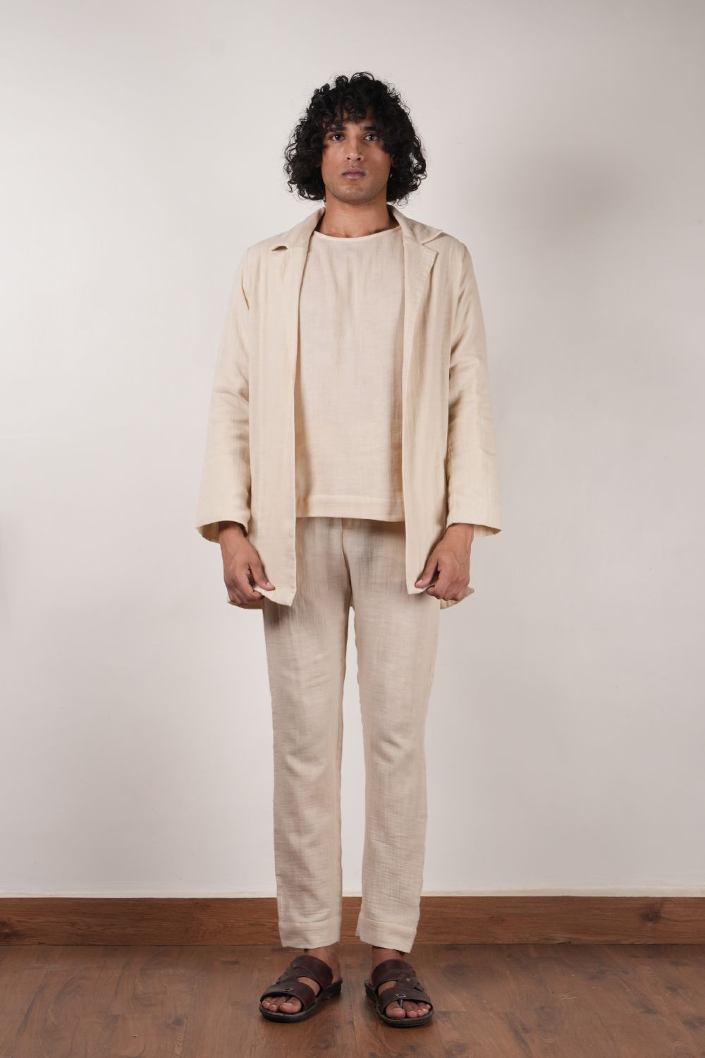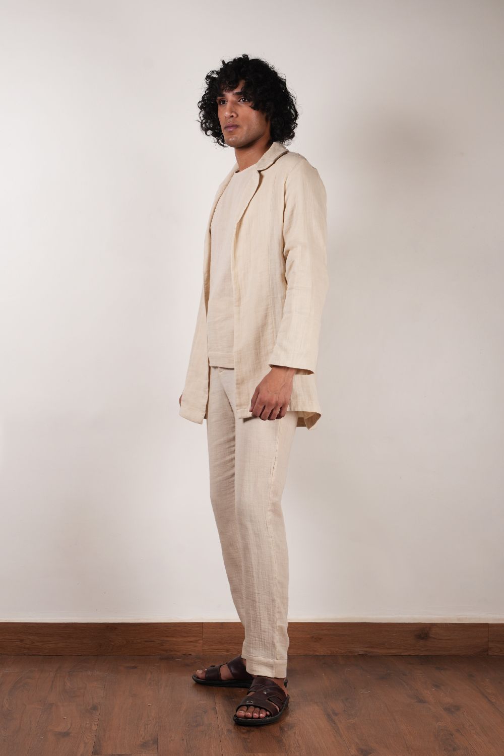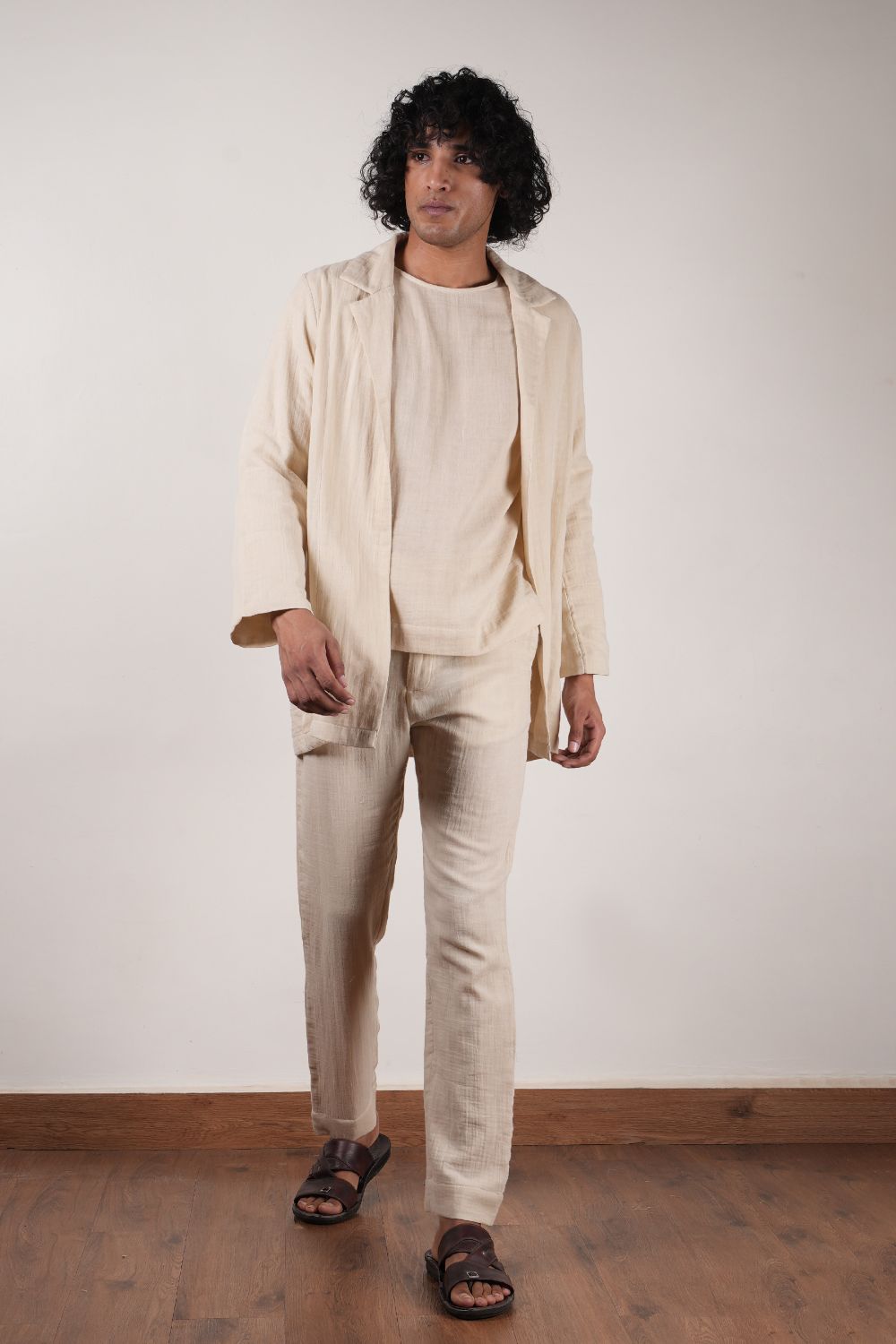 A comfort fit t-shirt with side shoulder zipper opening and extended sleeves comes with crush cotton pants and crush jacket all made in 100% natural cotton. Total 3 pcs.