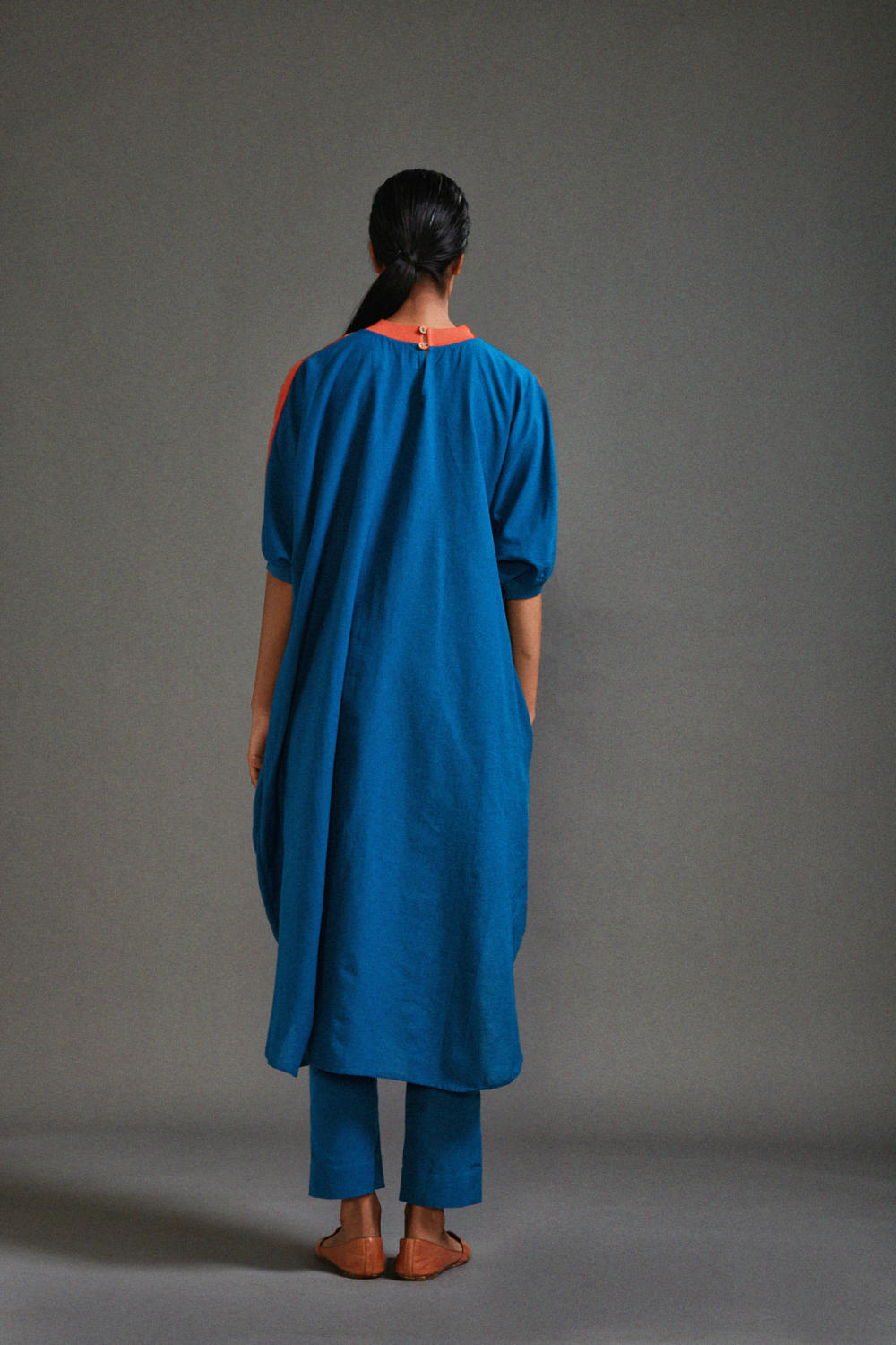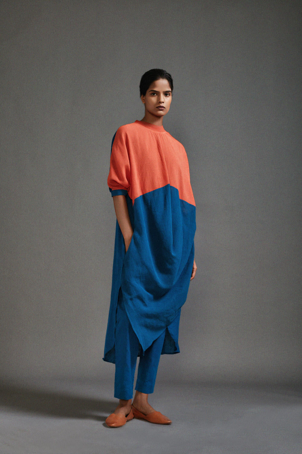 A Colour-block draped tunic in textured cotton with ribbed collar and cuffs. Side pockets and back button opening for ease. Complete the look with our SE pants from the collection.