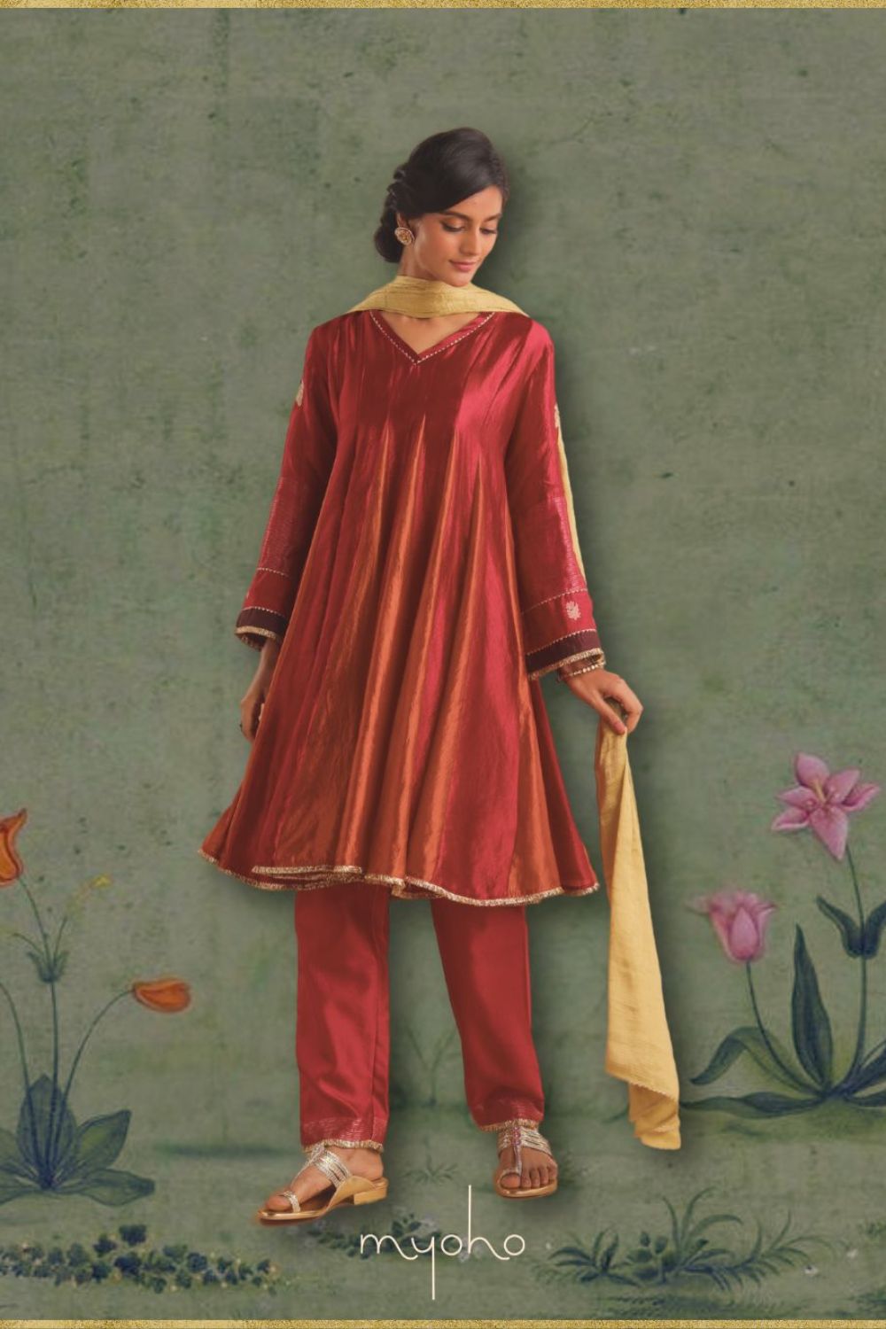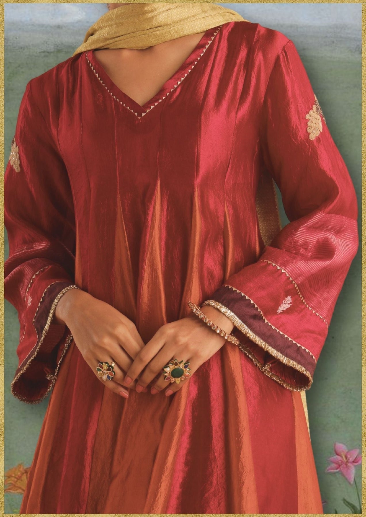 DUPION SILK MULTI COLOR GODET KURTA WITH SLEEVE EMB SET