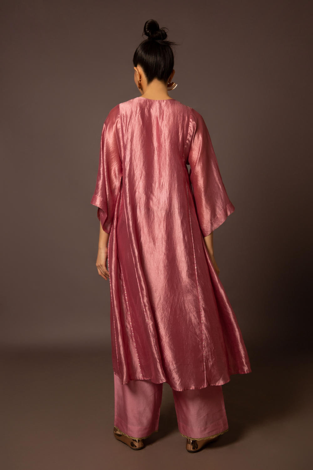 Hand dyed Dupion silk kurta with pitta handwork at neck and side panels with pants.