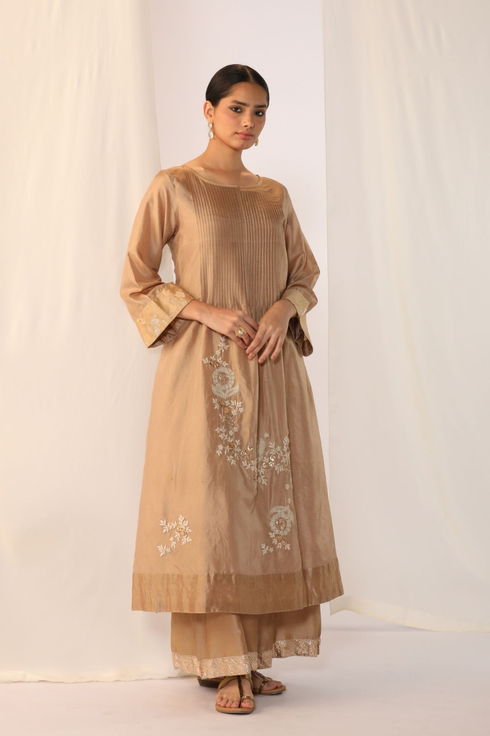Silk kurta featuring delicate scatter embroidery and refined pintuck detailing on the neck