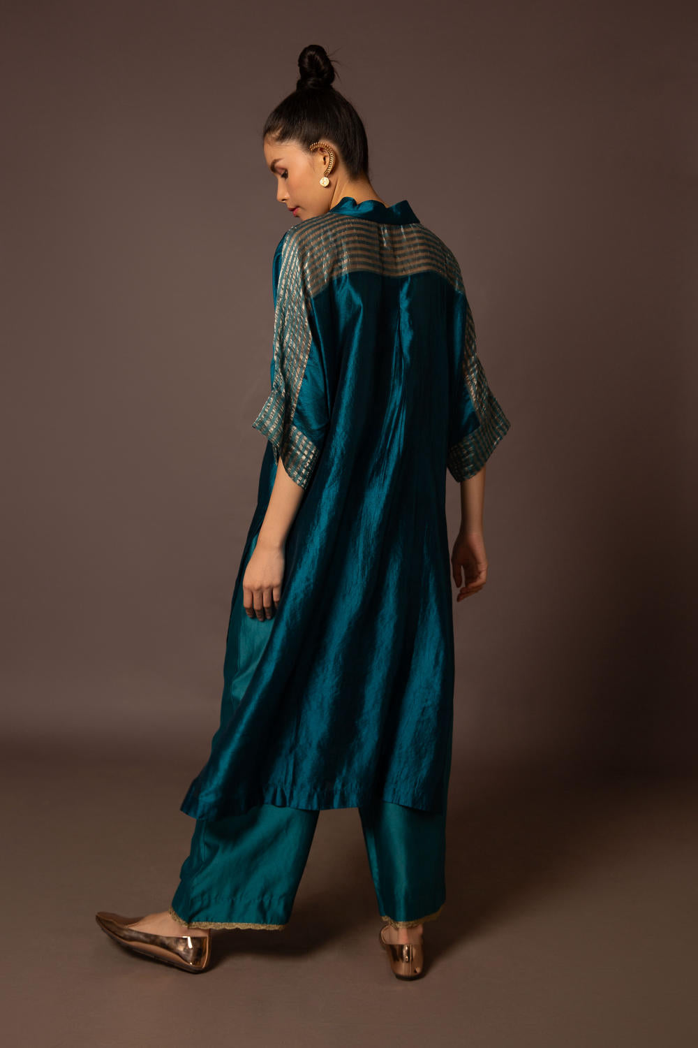 Jewel toned hand dyed Dupion silk kaftan kurta with pitta leaf hand work and side panel with pants.