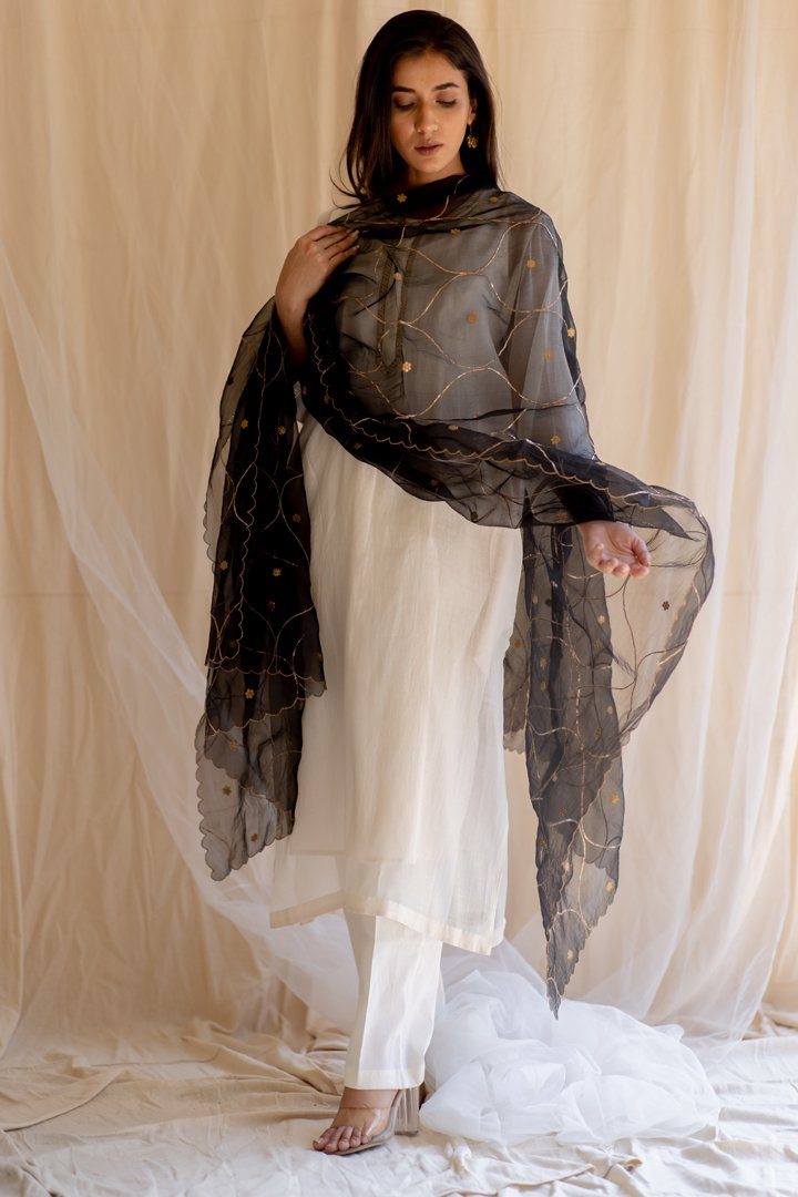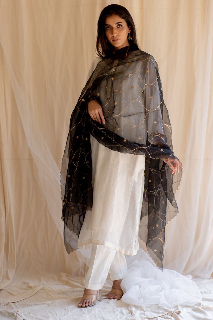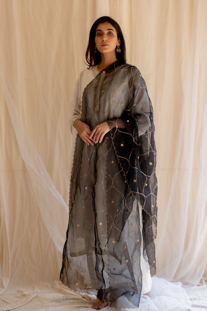 Jaal all over with edges scalloped, this dupatta speaks of pushing the boundaries, each step at a time.