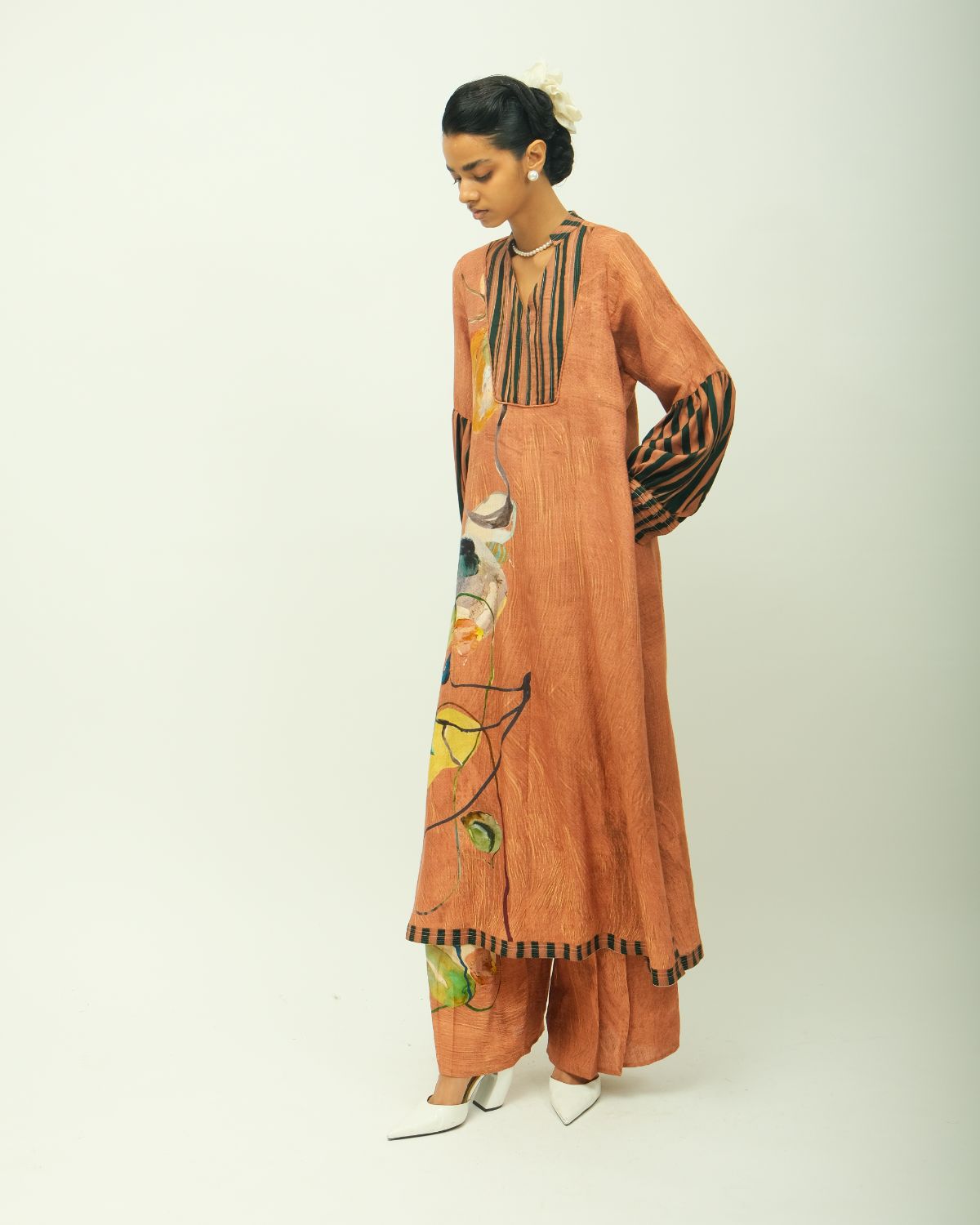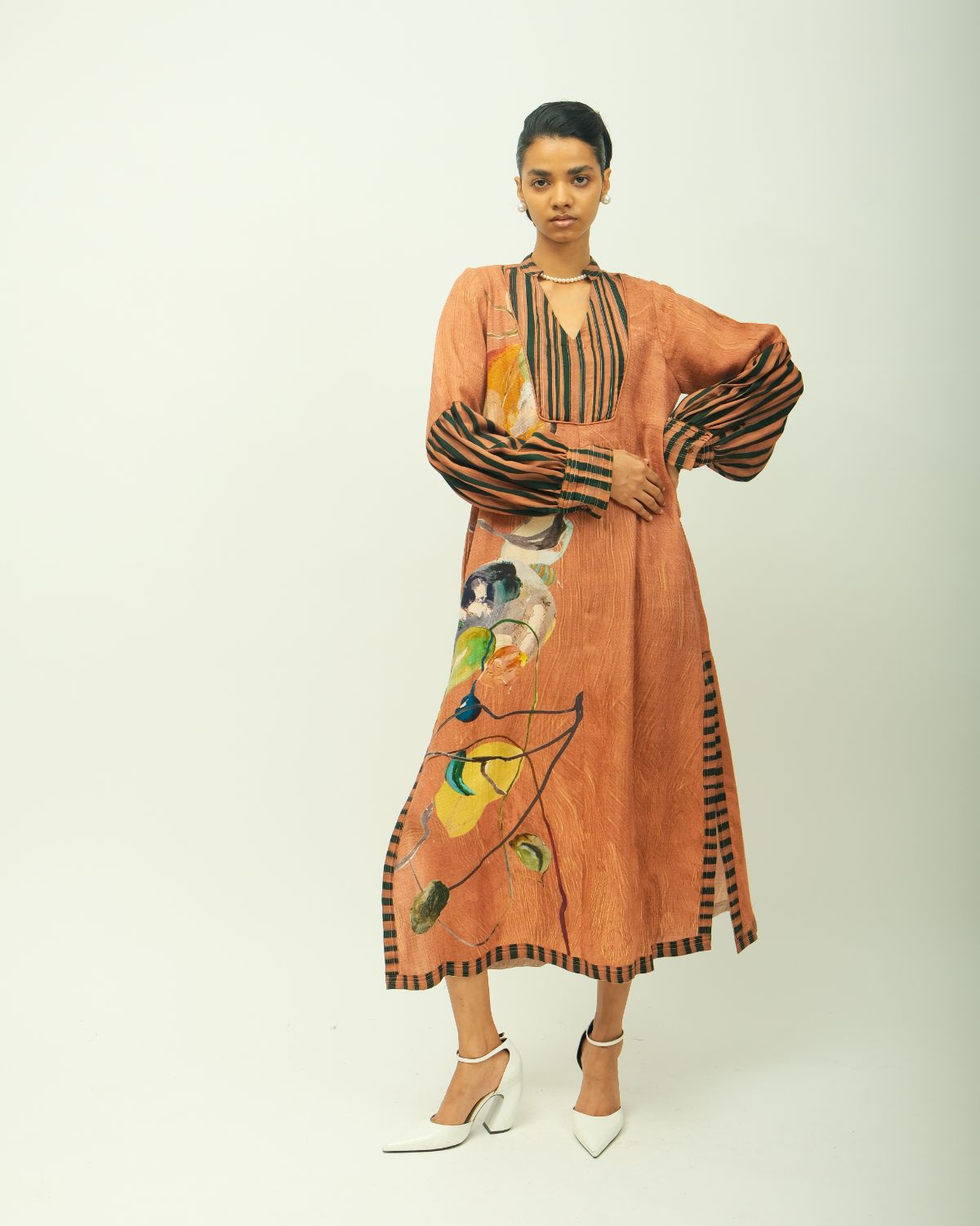 Dress: Anti fit, band collar, relaxed fit, flared long-sleeves, hand-painted abstract expressionist digitally transferred print, pin tucks on yoke, top stitch detailing, cording, striped pattern on sleeves and border, side slit. Ideal for festive celebration and dinner. Print placement may vary - single piece