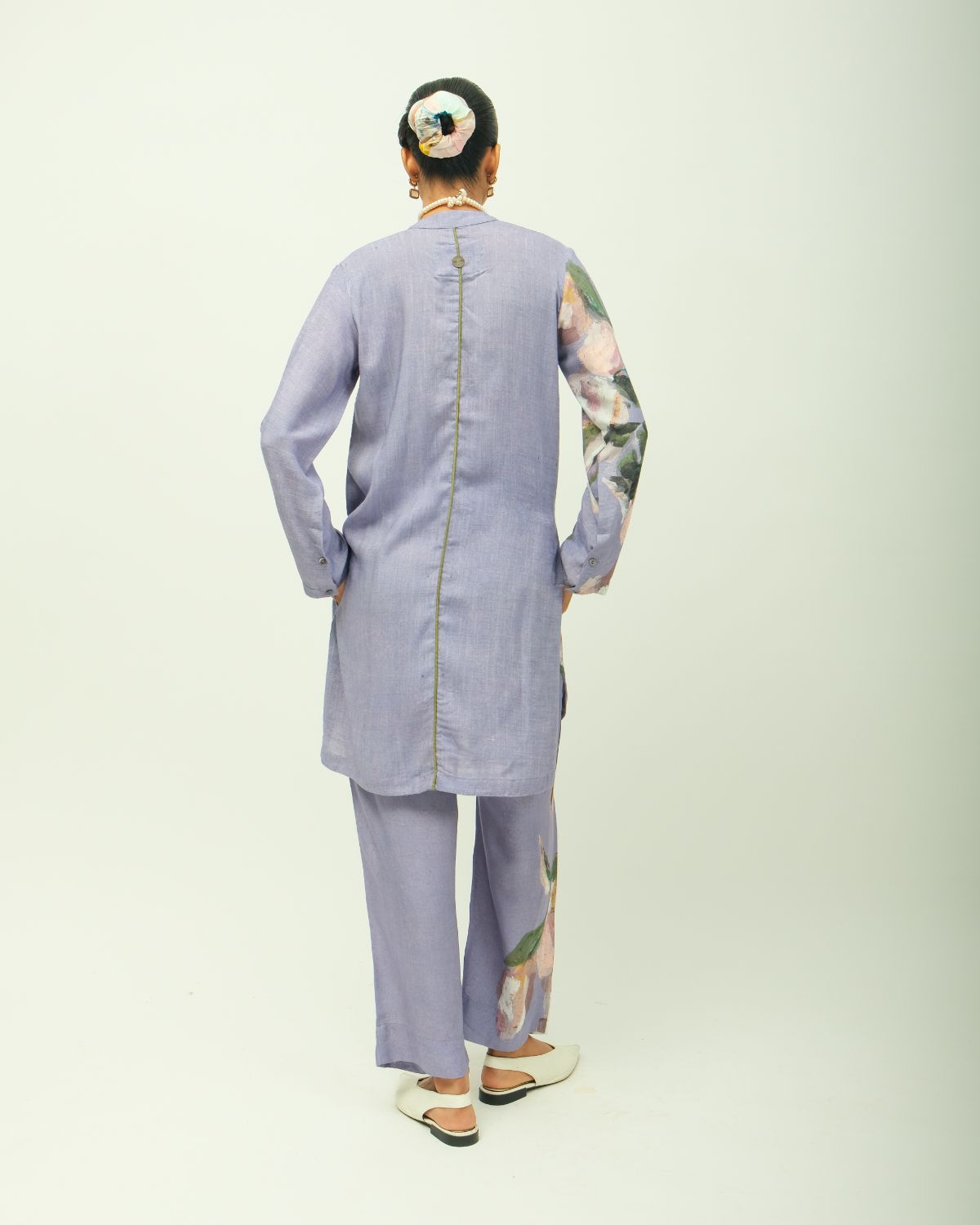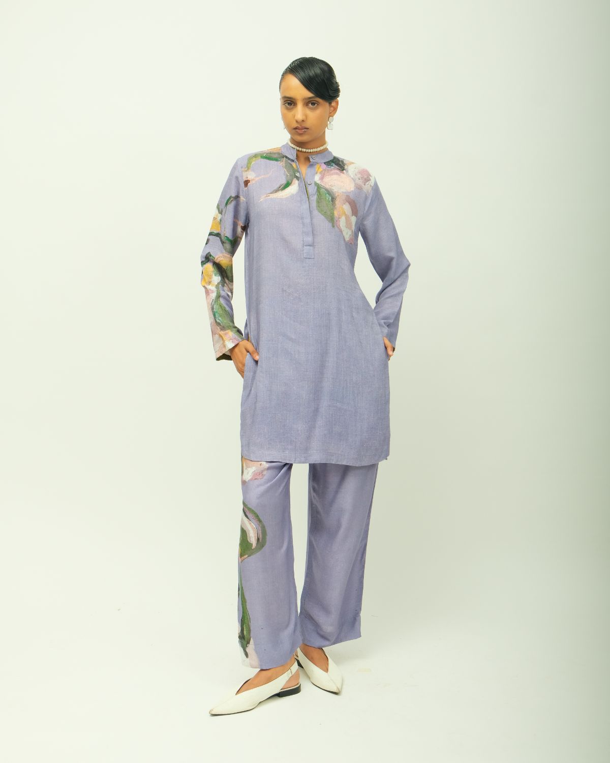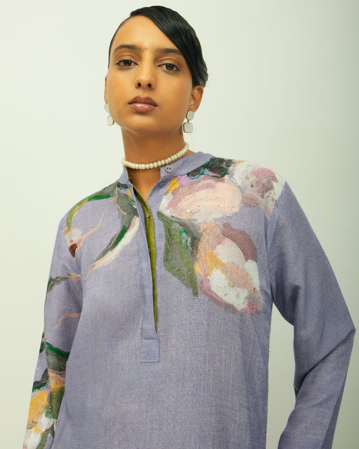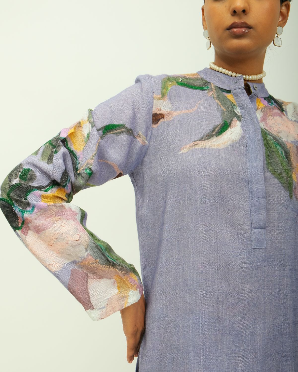 Anti fit, mandarin collar, half packet, full sleeves, perfect for casual outings, crafted from lightweight textiles, hand-painted abstract expressionist digitally transferred print, side pockets. Print placement may vary- Single piece. Garment Length - 34"