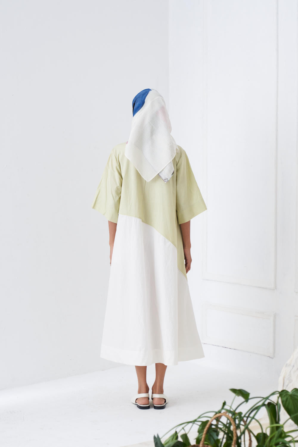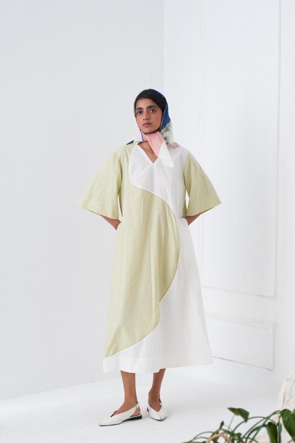 A-Line yin patchwork Dress with a V-Neck, and insert. Kimono sleeve and side Inseam pockets. Vintage coin detailing on the back. Model is wearing size M.