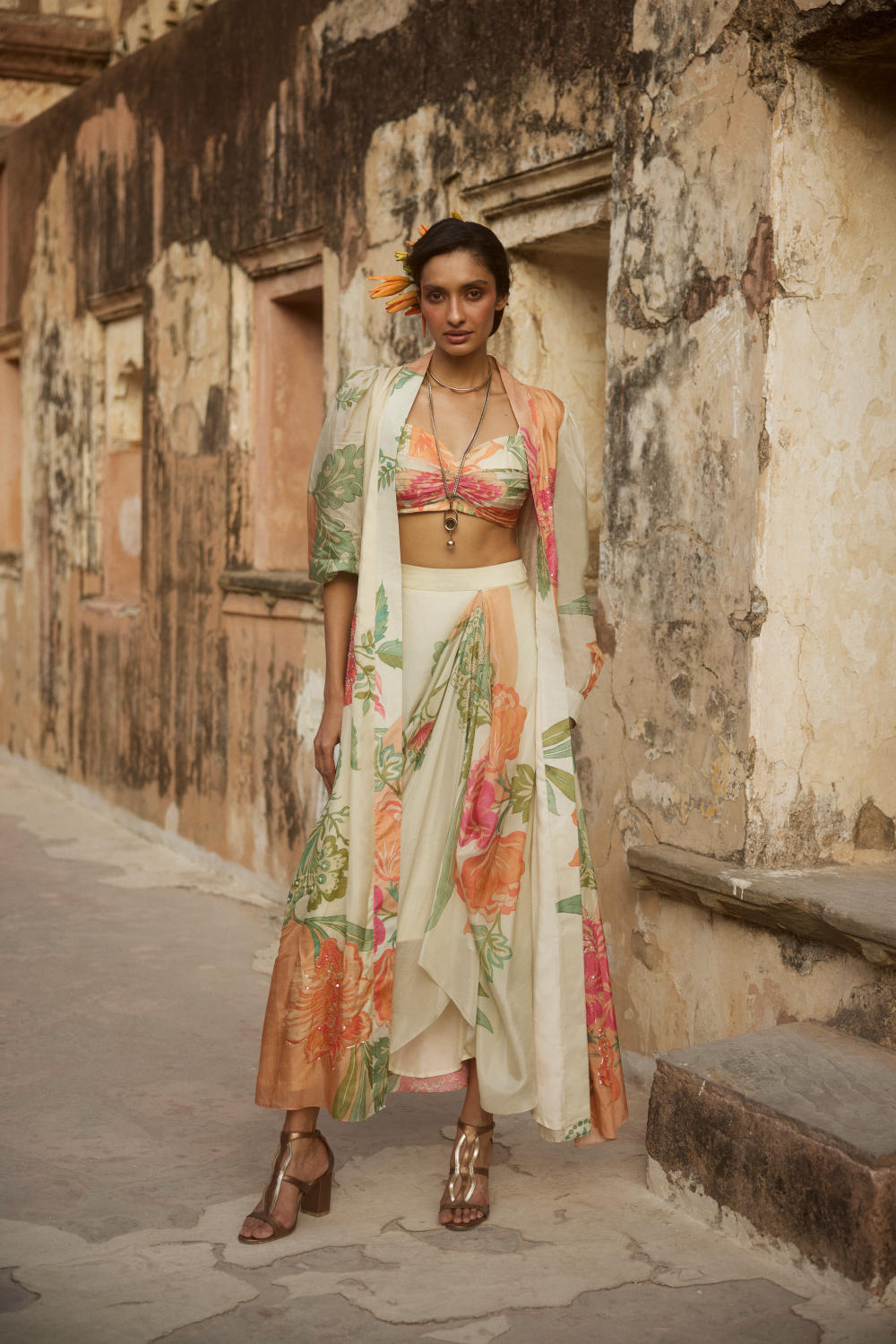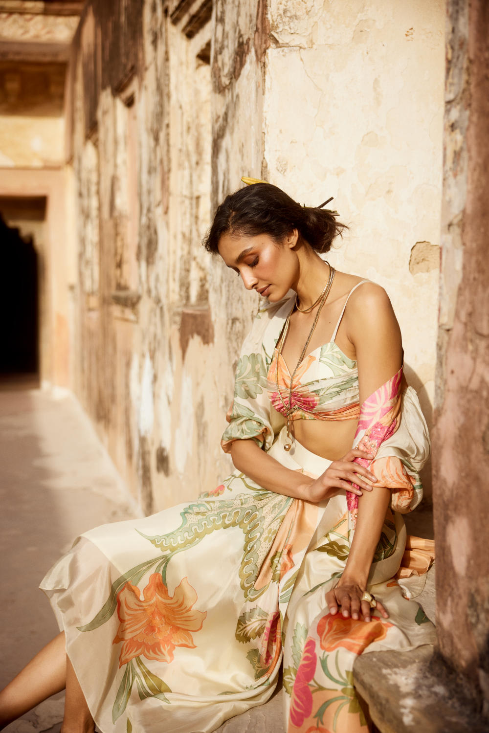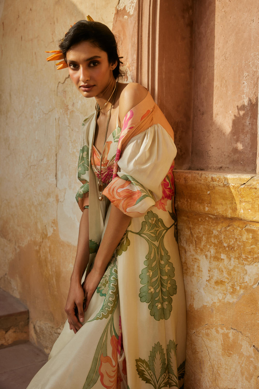 Every collection begins long before the garment is stitched: months of research into India’s rich craft traditions, followed by the painstaking creation of detailed illustrations. These artworks are then scanned, enhanced with jewel-toned palettes and touches of rich gold, and finally translated onto fabric. The result is a visual language so distinct that their name has become synonymous with print, colour, and the kind of glamour that still feels feather-light.