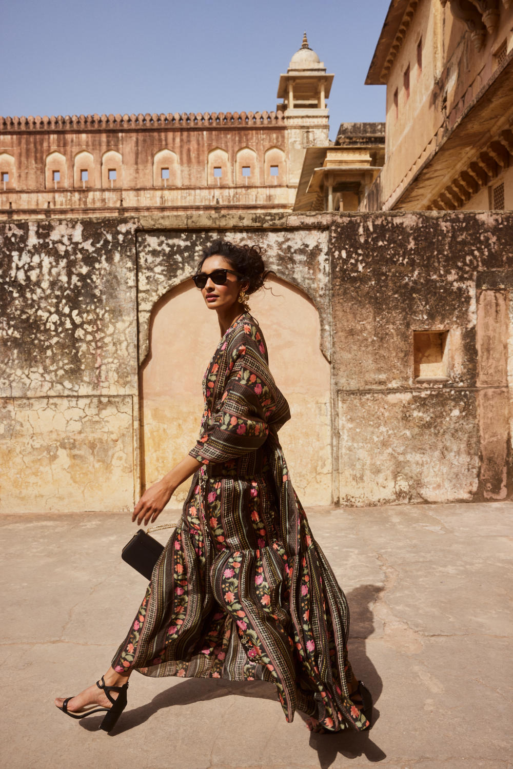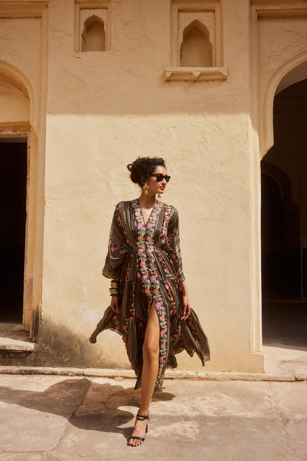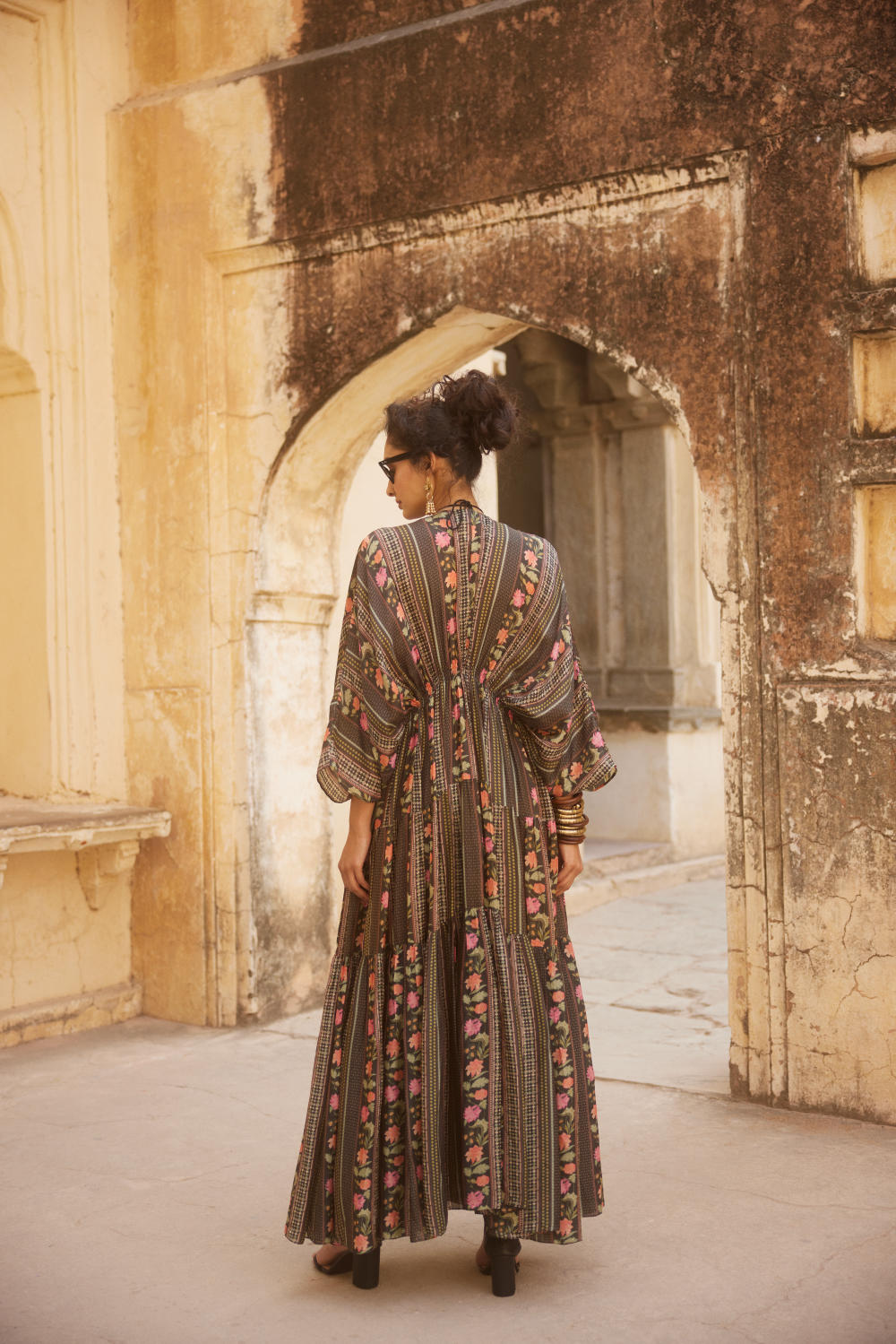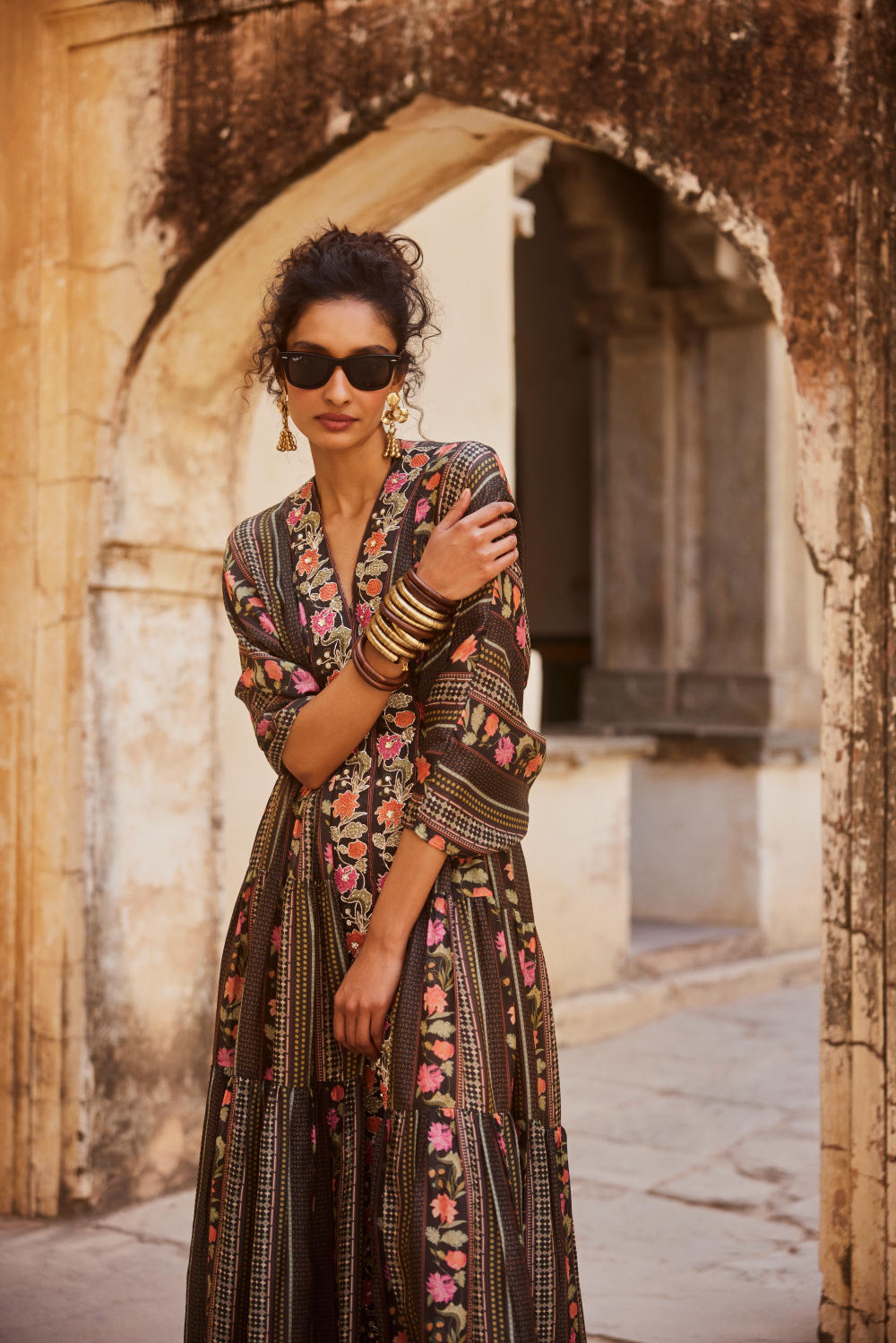 Every collection begins long before the garment is stitched: months of research into India’s rich craft traditions, followed by the painstaking creation of detailed illustrations. These artworks are then scanned, enhanced with jewel-toned palettes and touches of rich gold, and finally translated onto fabric. The result is a visual language so distinct that their name has become synonymous with print, colour, and the kind of glamour that still feels feather-light.