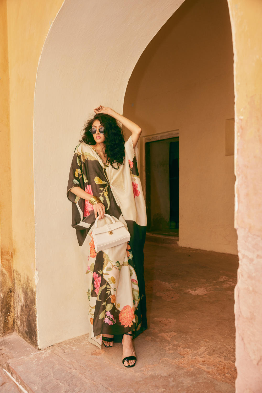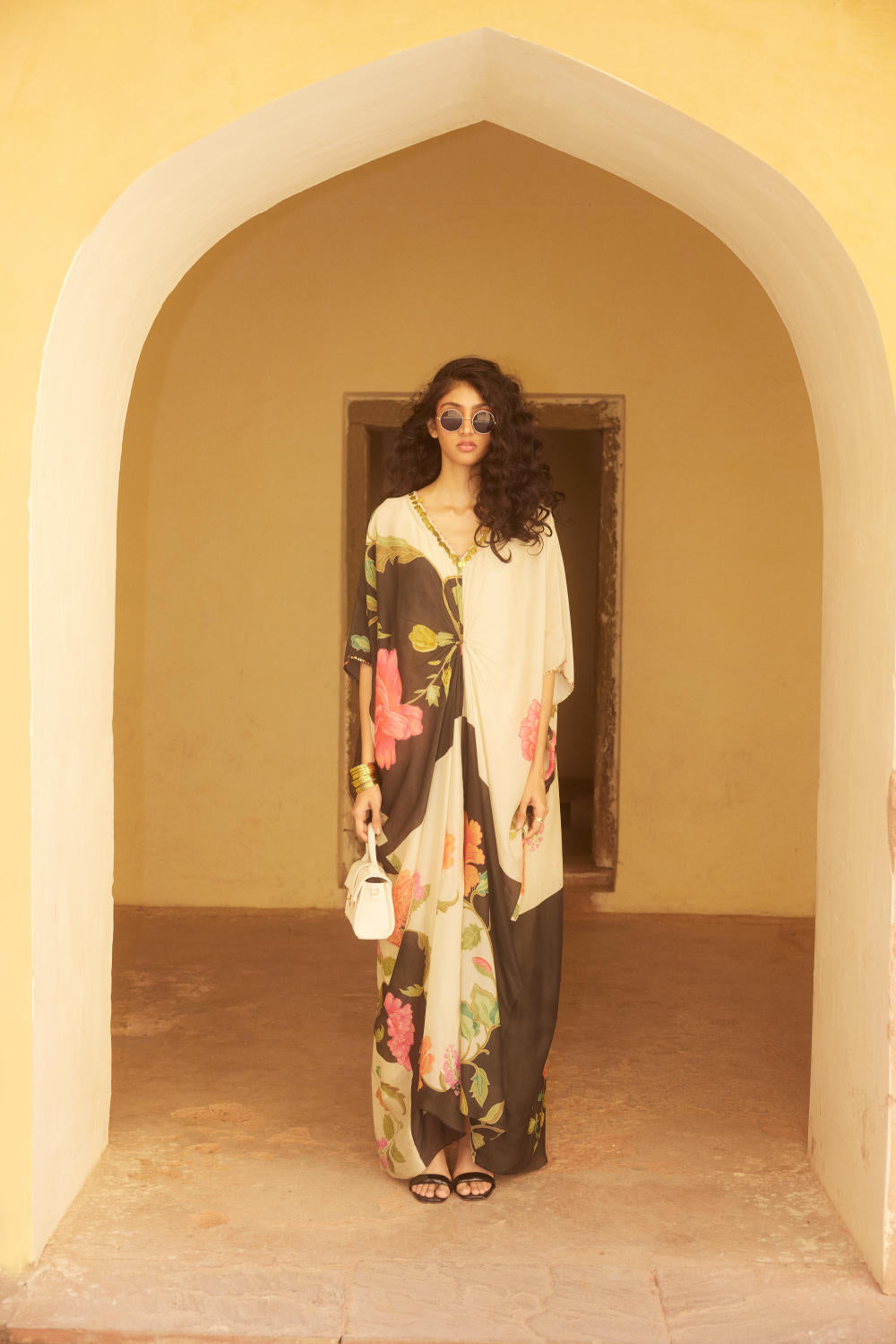 Our easy breezy knot kaftan set is a playful mix of florals and color contrasting. It has hand tucked coin and beads detailings on neck and sleeves. Perfect from day brunches to evening dinners.