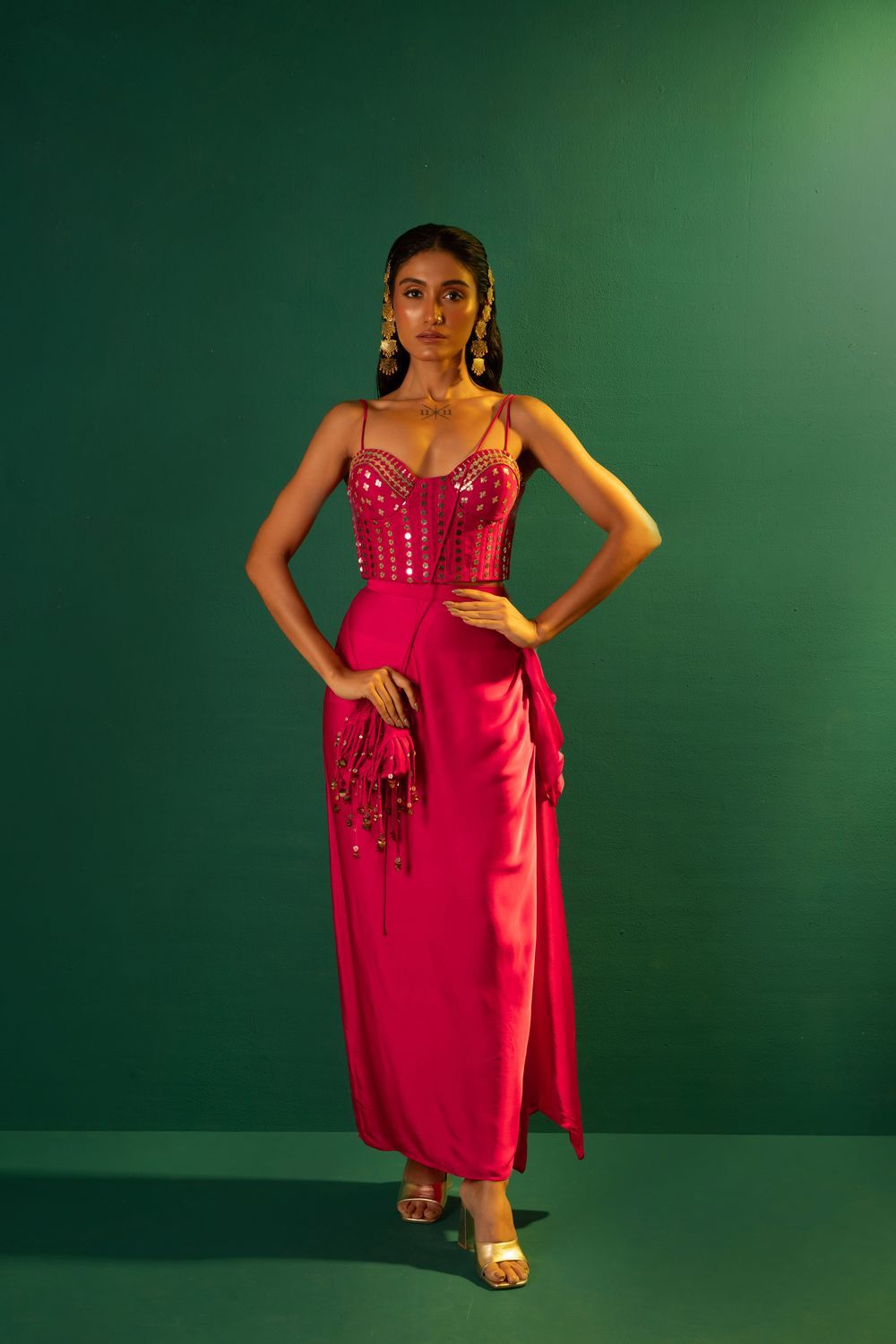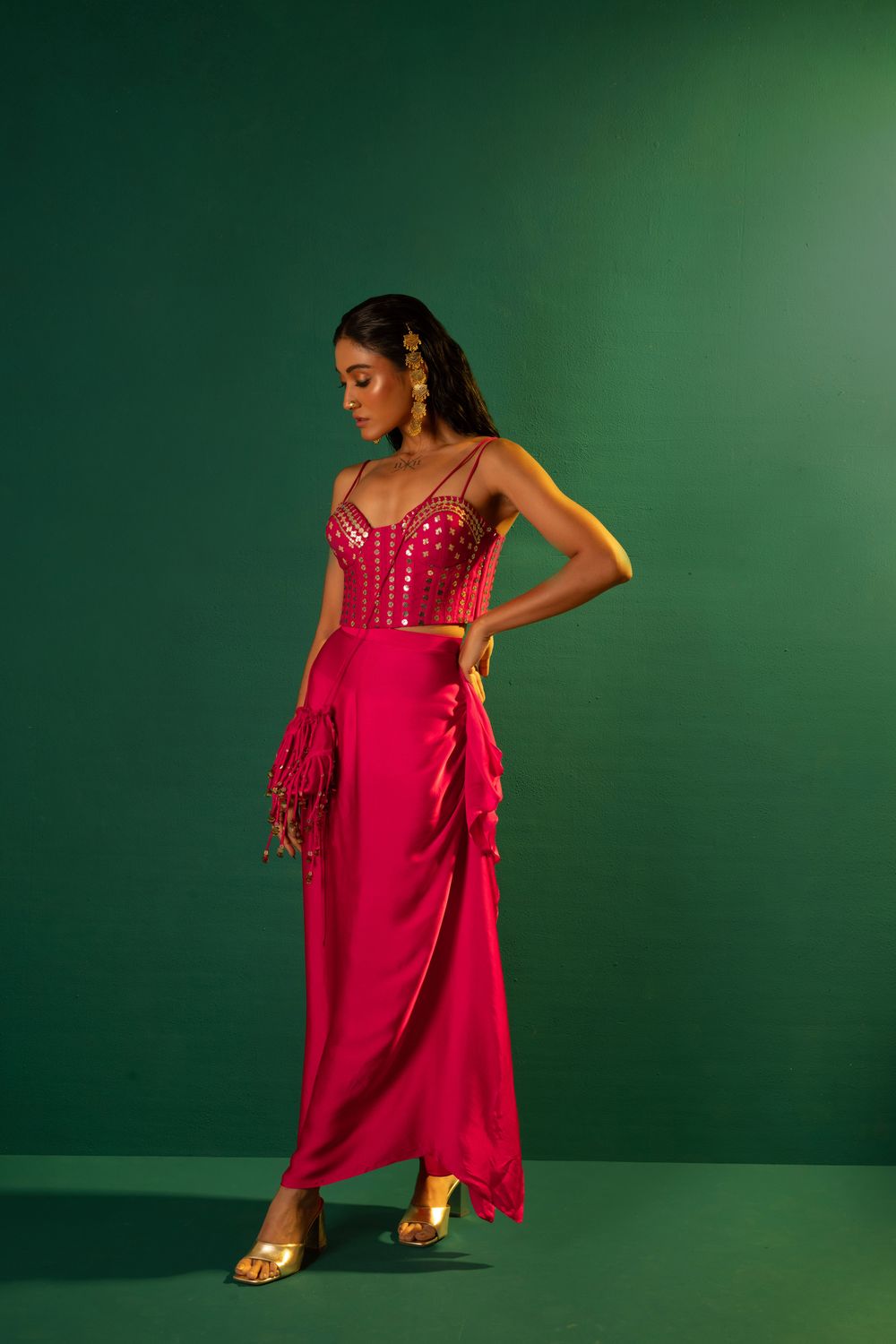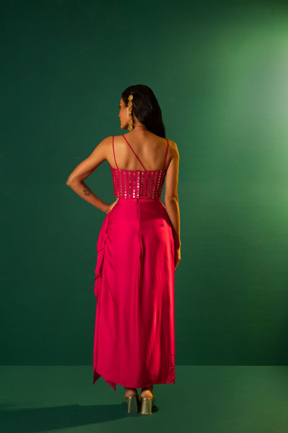 Heavily embroidered blouse with semi ruffled straight skirt in Satin
