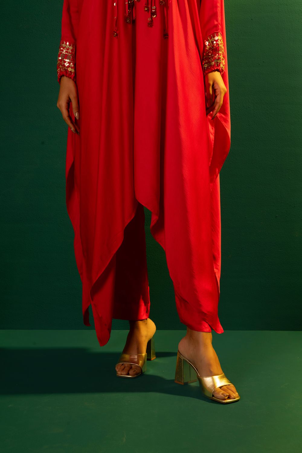 Chilli Red Kaftaan with hand embroidered mirror look alike coin & reflective sequin lace with hand folded coin sequin lace to give a starry glow.The set is completed with Pants