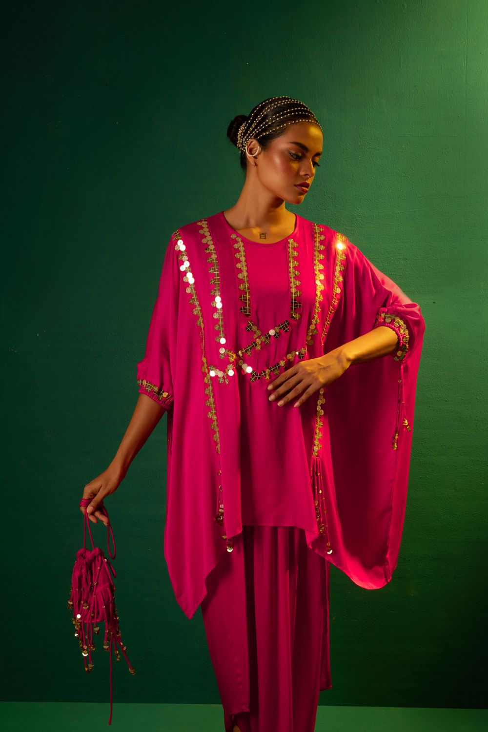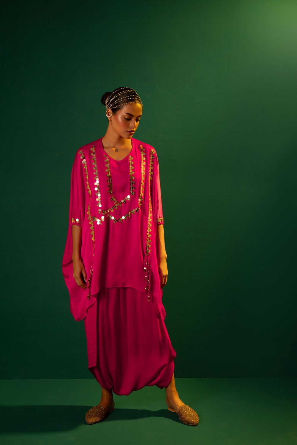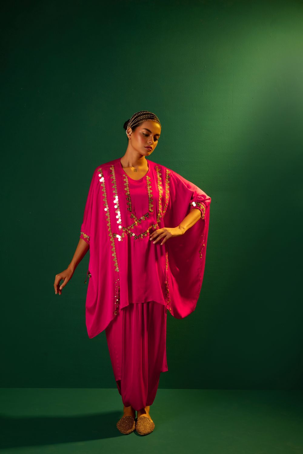 French Fuscia satin antifit tunic co-ord set.The top is embellished with handembroidered lace in mirror like sequin in white gold.