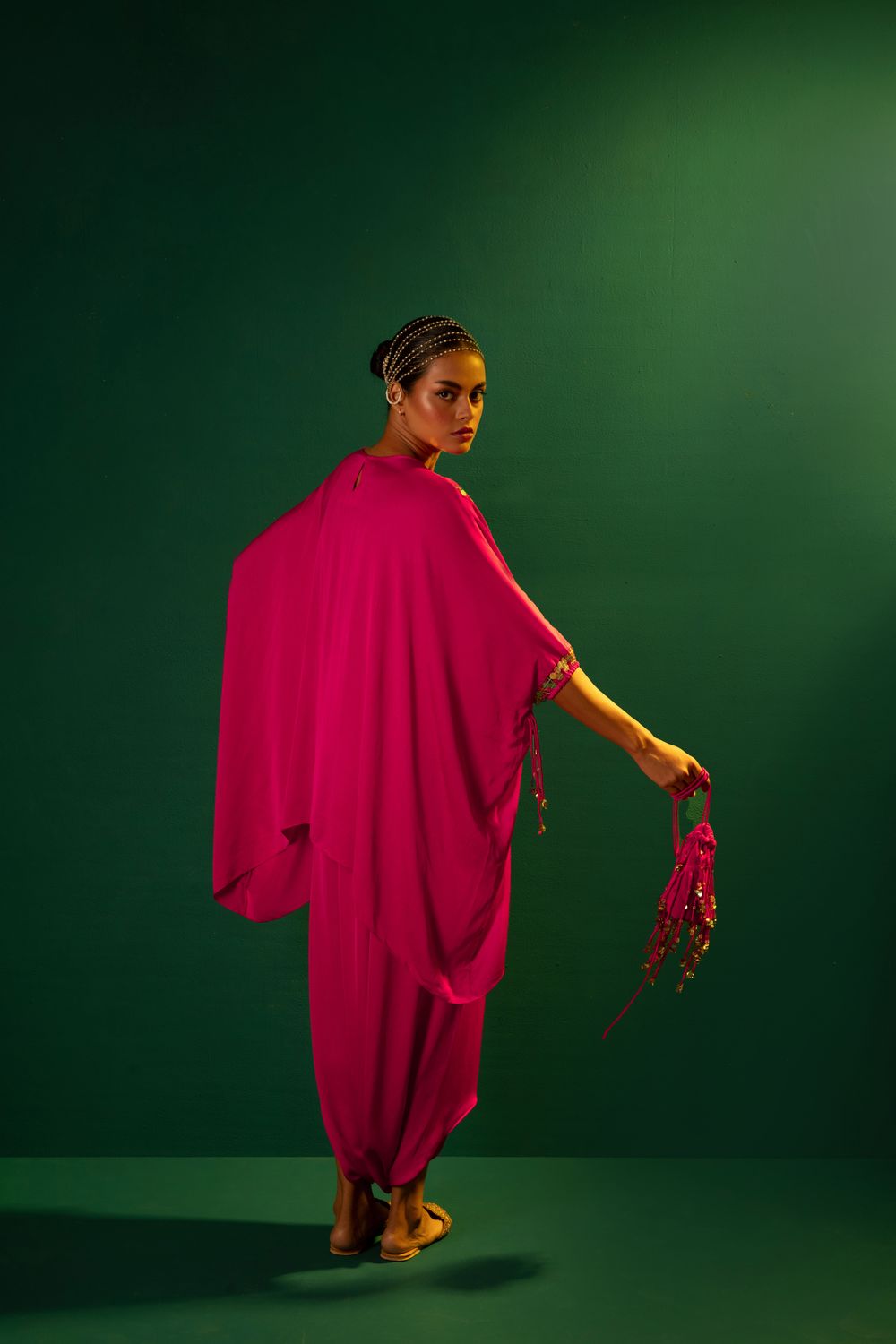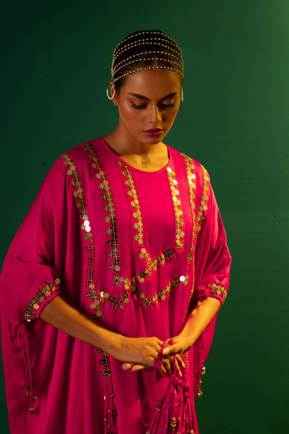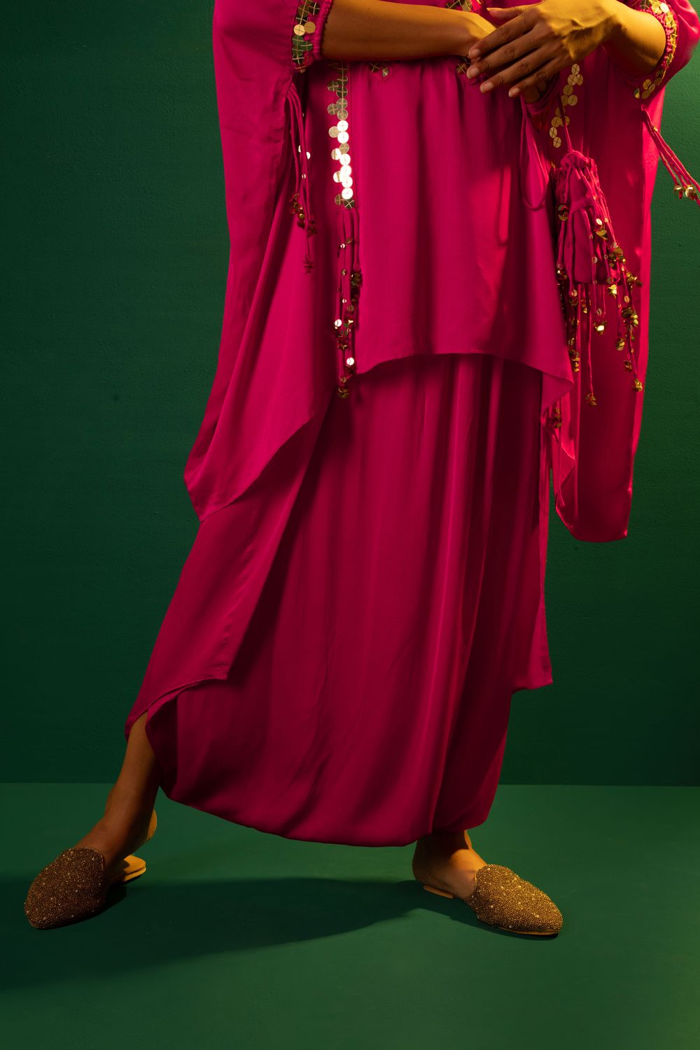 French Fuscia satin antifit tunic co-ord set.The top is embellished with handembroidered lace in mirror like sequin in white gold.