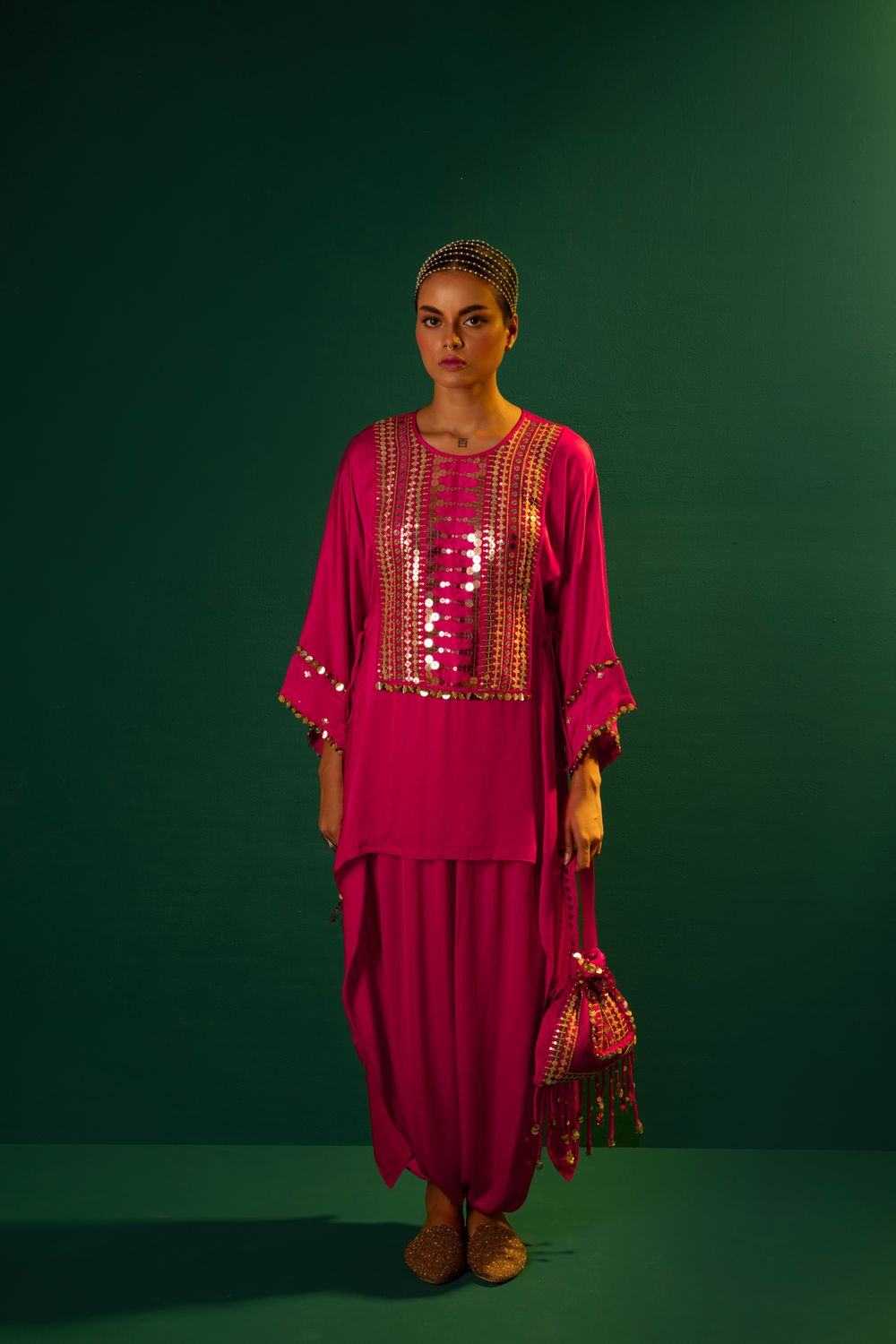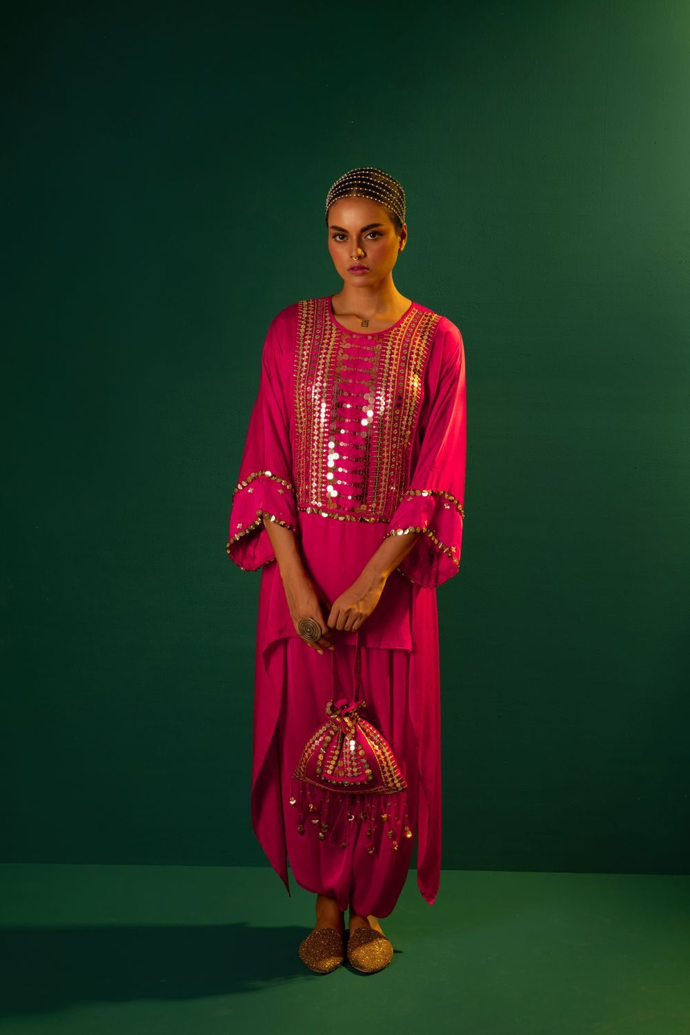 Featuring french fuscia asymmetric tunic with dhoti skirt.Hand embroidered with mirror like reflective sequin.