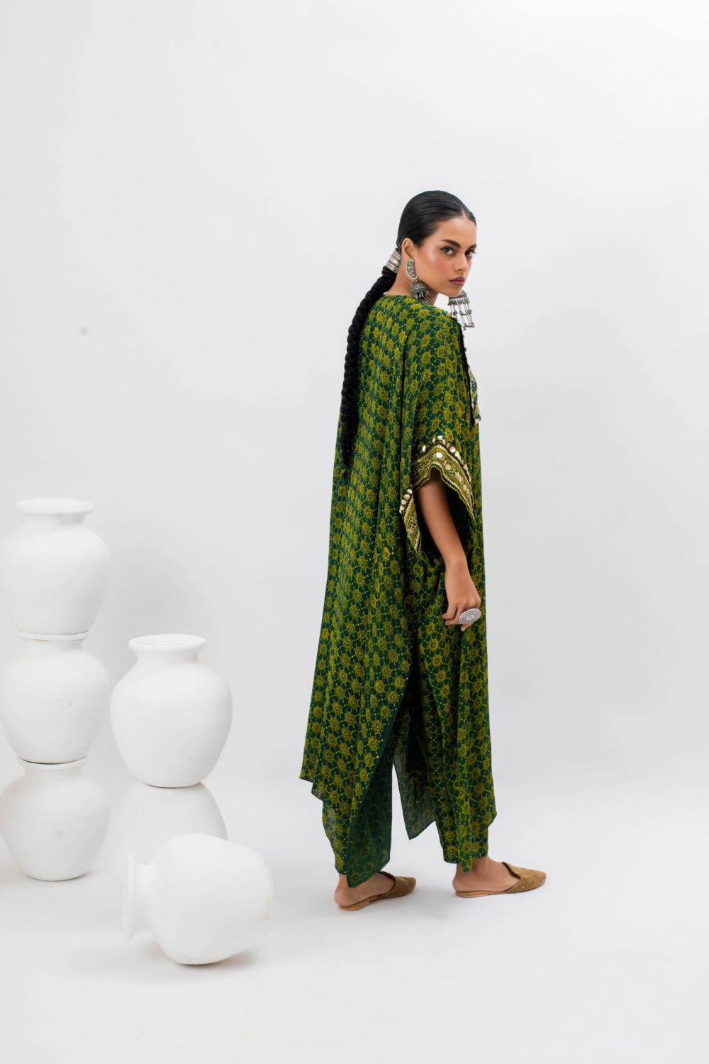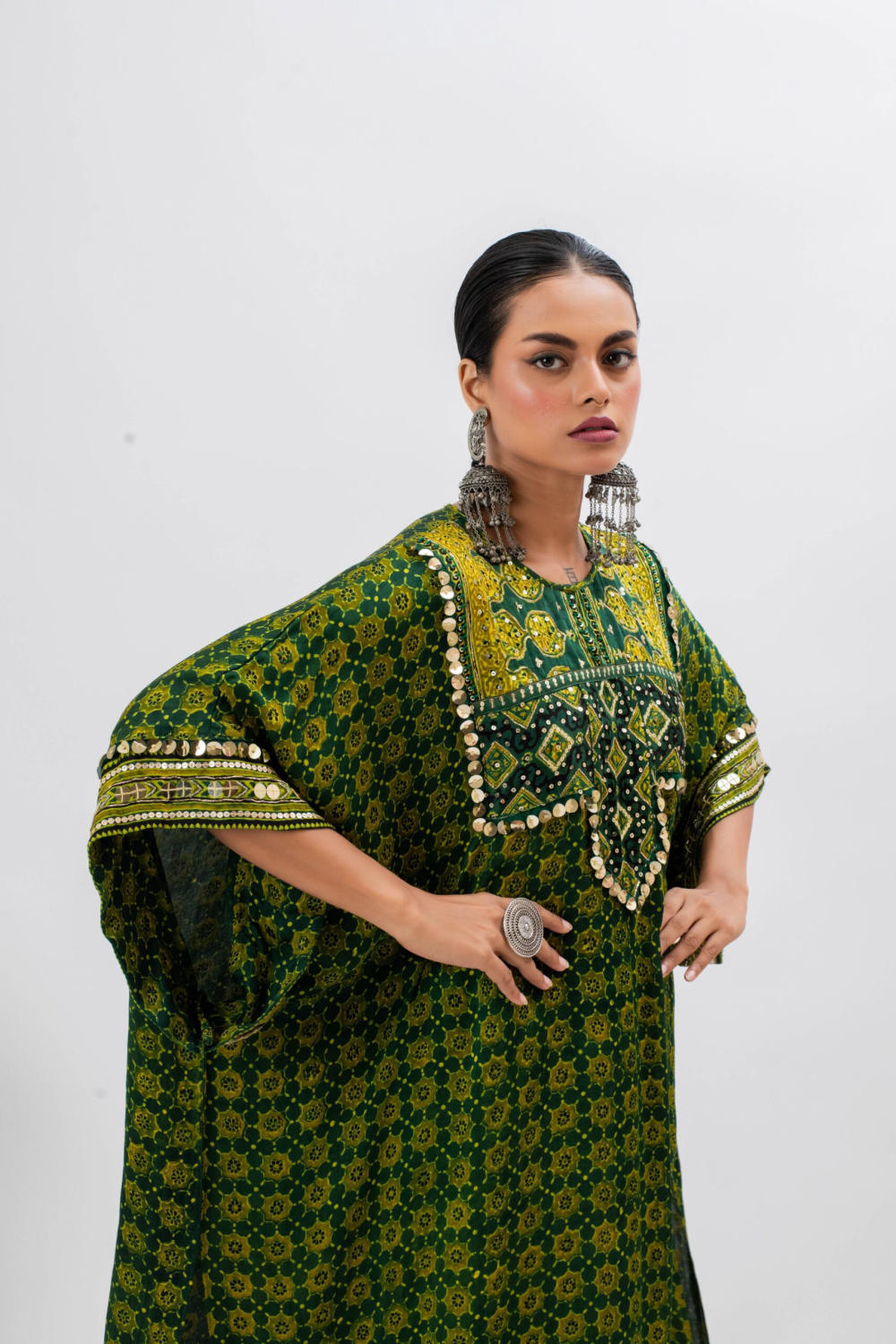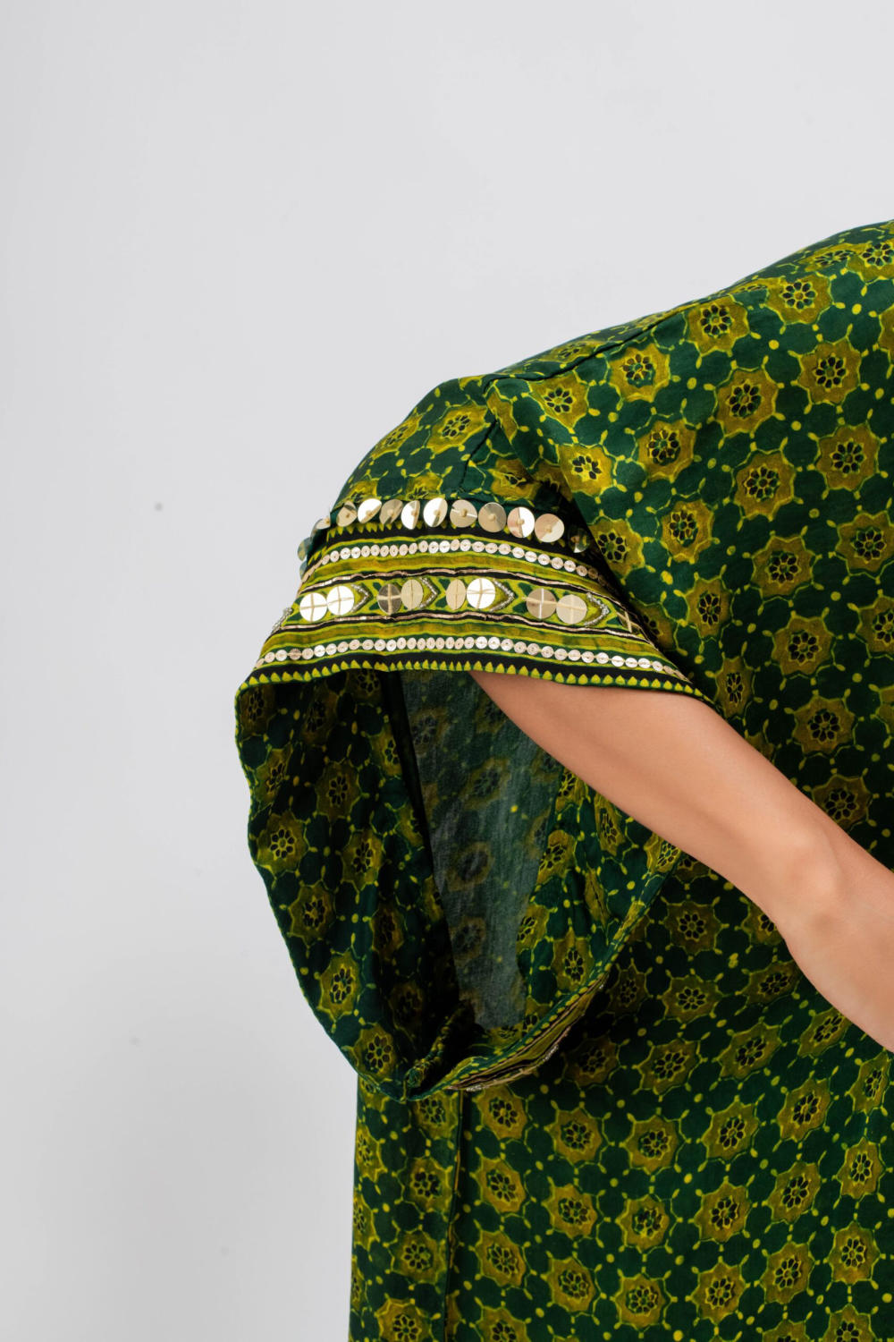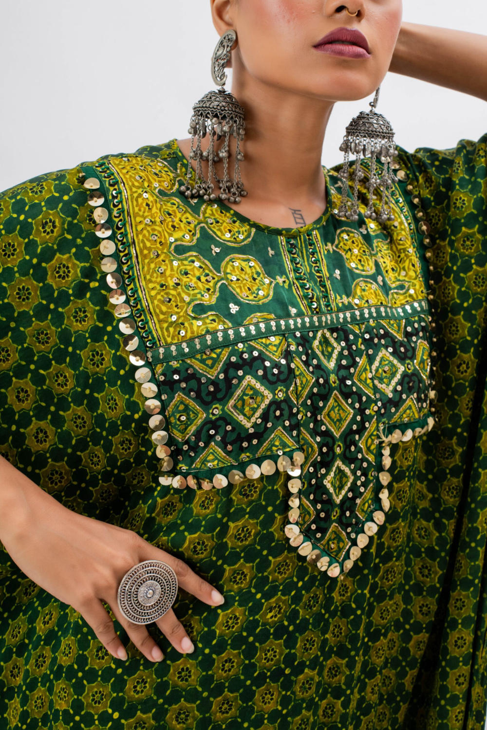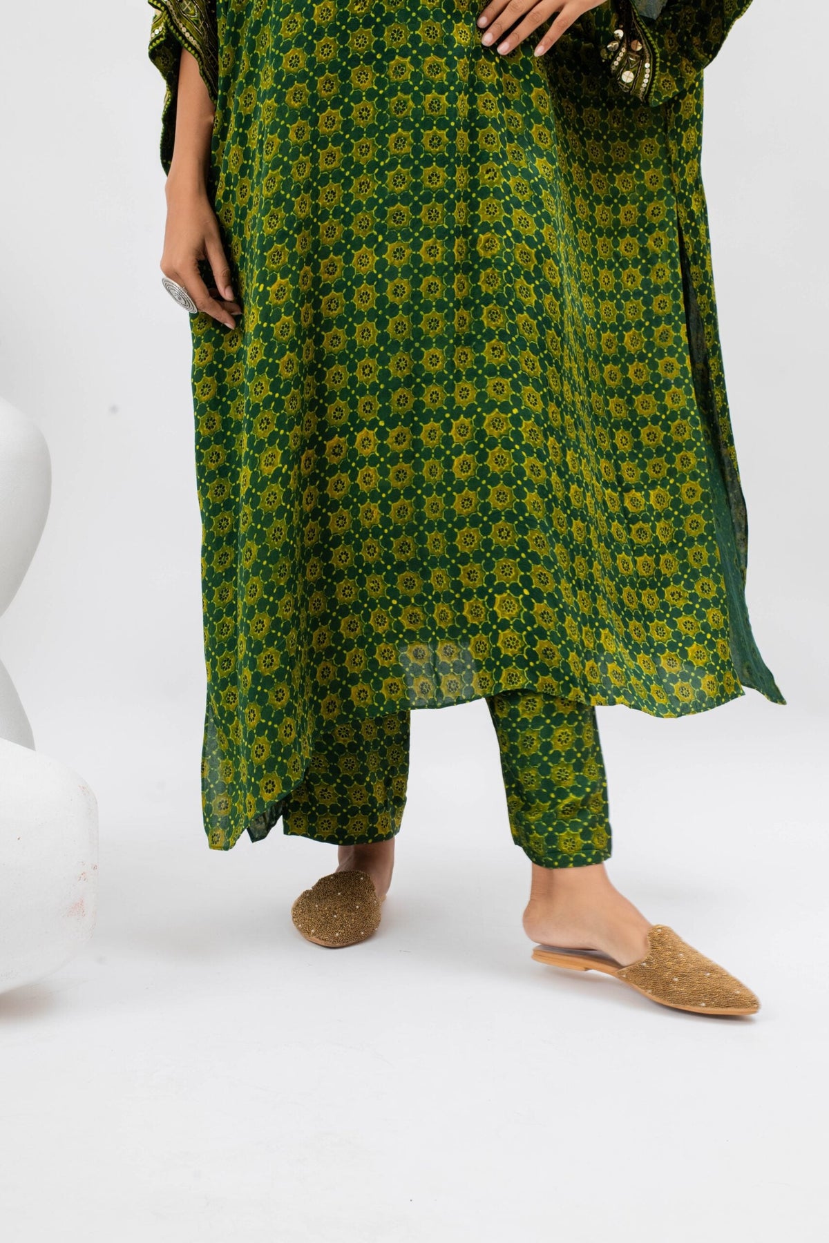 Green Handblocked Ajrak hand embroidered anti-fit kurta with boho style embroidered yoke.The set comes with slim pants