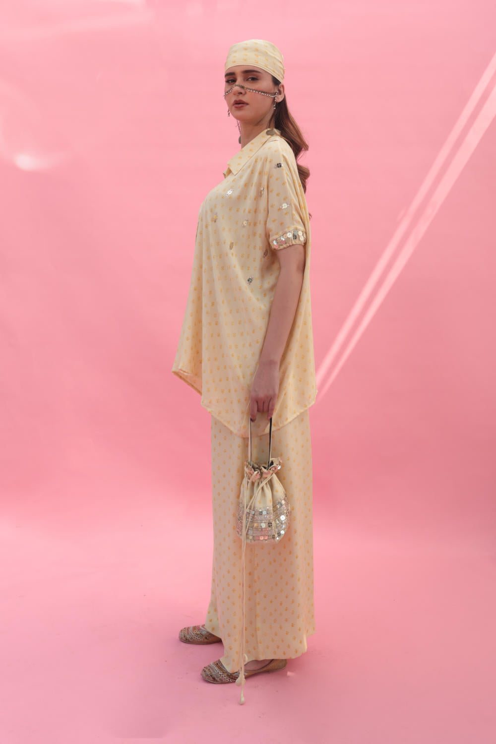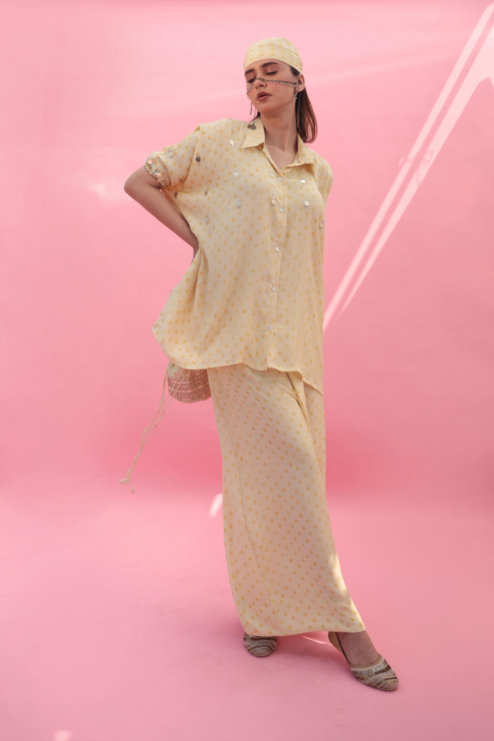 Introducing our handblocked pastel yellow anti-fit hand-embroidered shirt, embellished with mirror-like sequins. Paired with coordinated pants for chic summer elegance.