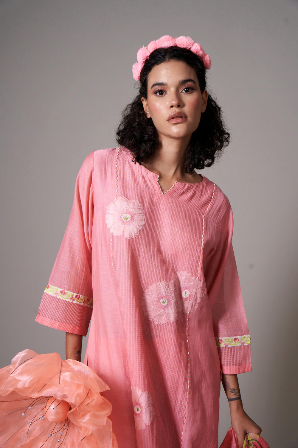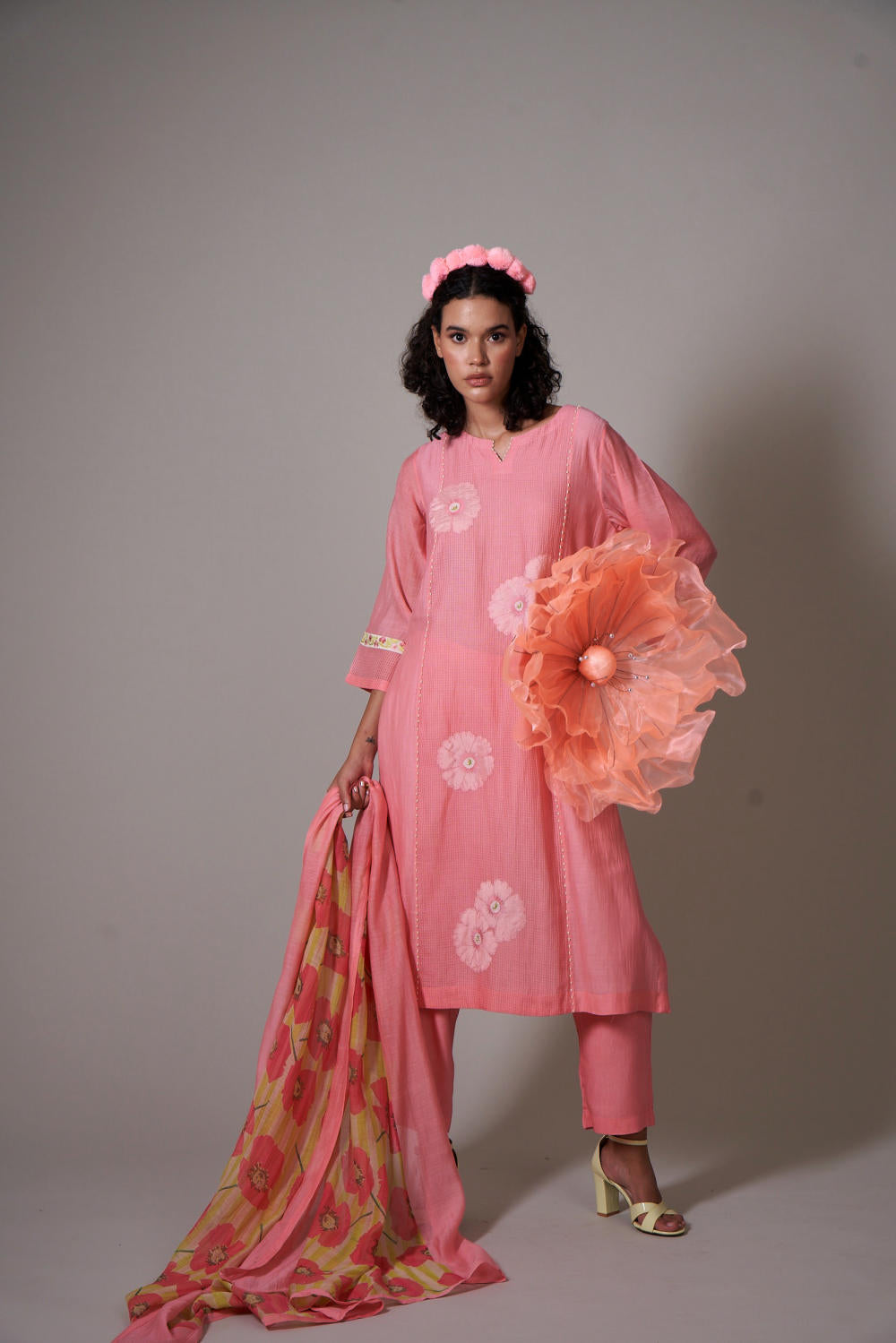 Mul cotton silk peach kurta set mix textures having applique florals, bead work,sleeves with embroidery border and mul poppy print dupatta with peach color pants.