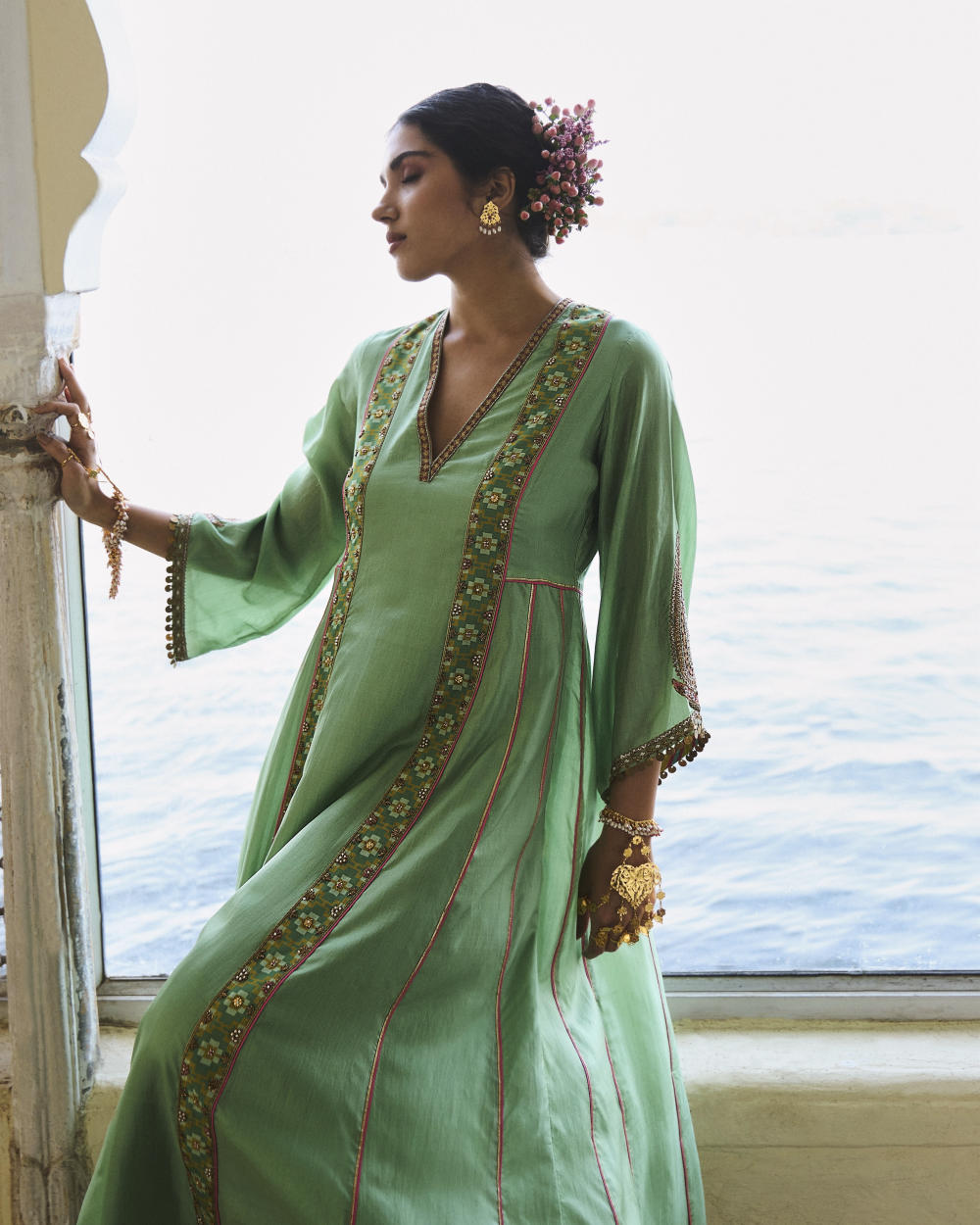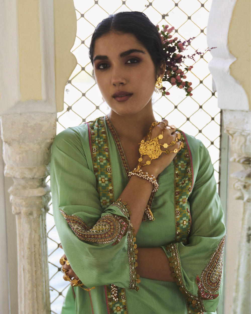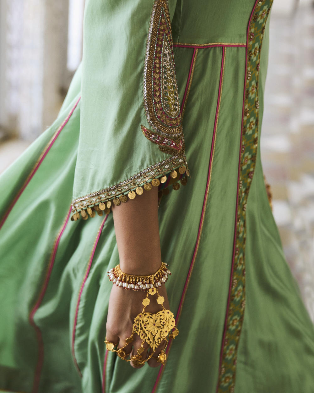 Sage Green side kali kurta with hand embroidered neckline , sleeves and panel pattis paired with sequin embroidered lime yellow salwar. Along with hand embroidered organza dupatta with printed back finish.