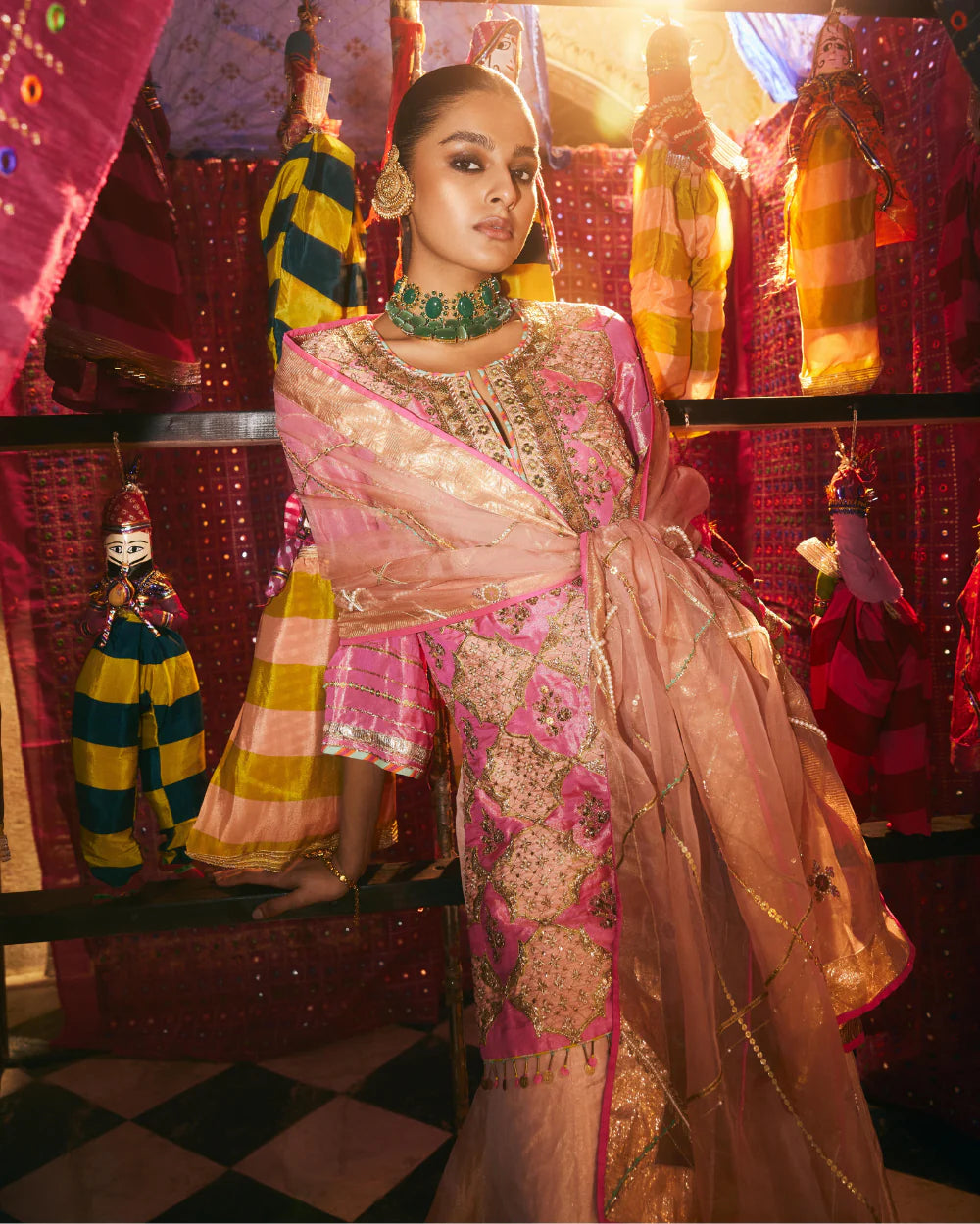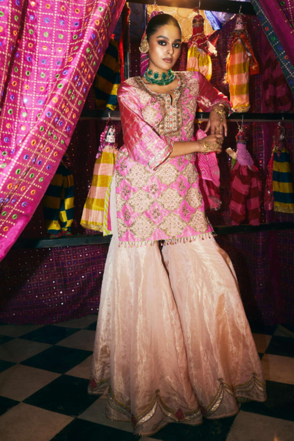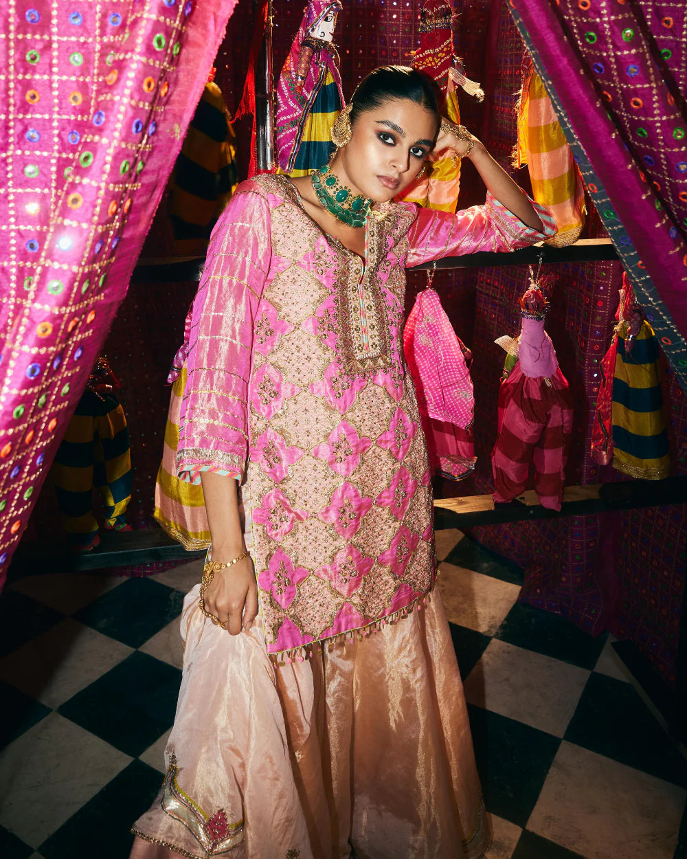 Illuminate your wardrobe with this exquisite Hot Pink Tissue Gharara set. The short kurti boasts of all over delicate hand embroidery, Paired with a Nude Pink Tissue applique work gharara and embroidered jaal organza dupatta creating a timeless ensemble for any occasion.