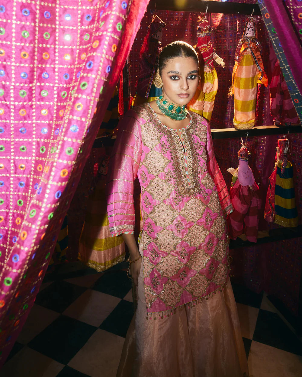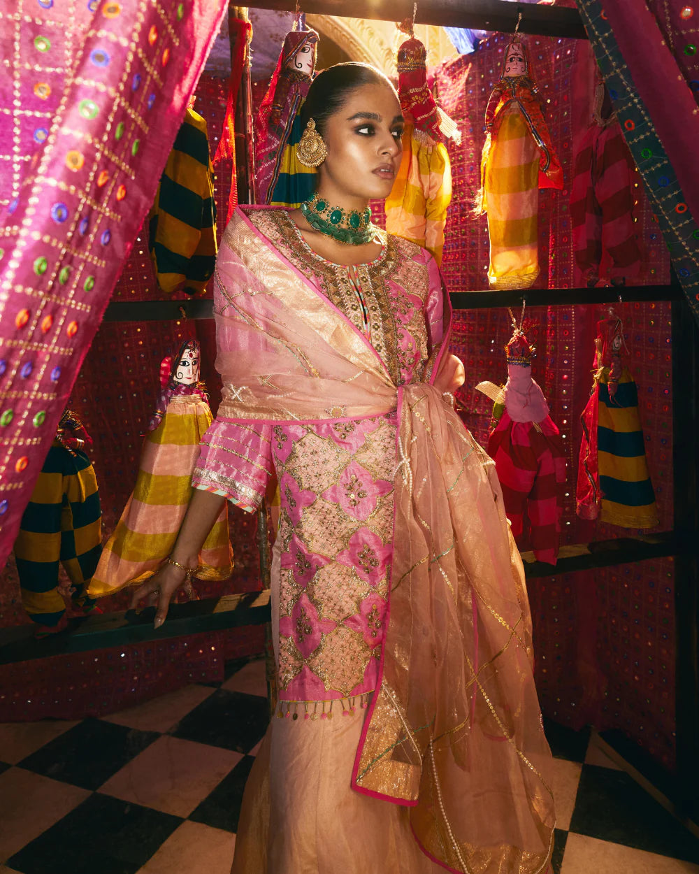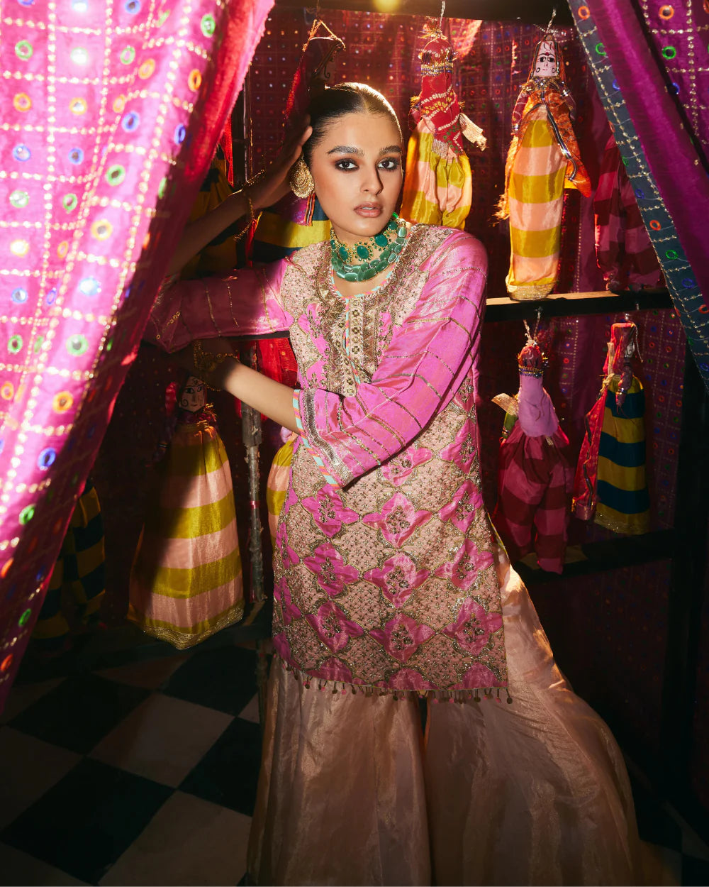 Illuminate your wardrobe with this exquisite Hot Pink Tissue Gharara set. The short kurti boasts of all over delicate hand embroidery, Paired with a Nude Pink Tissue applique work gharara and embroidered jaal organza dupatta creating a timeless ensemble for any occasion.