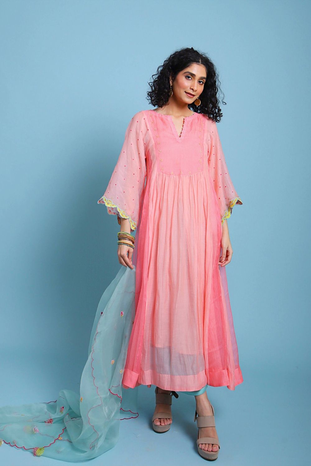 Blush Pink Chanderi Anarkali with organza printed striped panels,paired with danty embroridery on Powder Blue oraganza dupatta having applique and dori work. Along with Grey modal palazzo with tassel detailing.