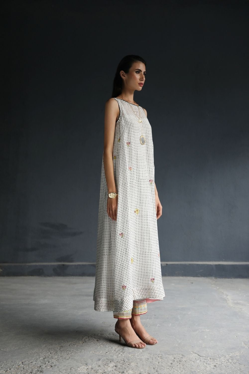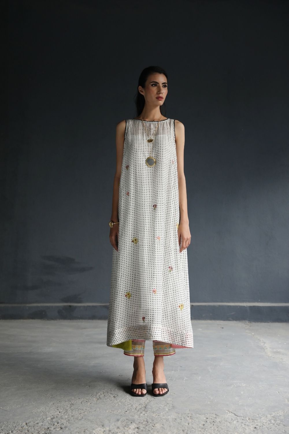 Printed Cotton Silk side pintuck Kurta with Applique work paired with intricate embroidered Pant.