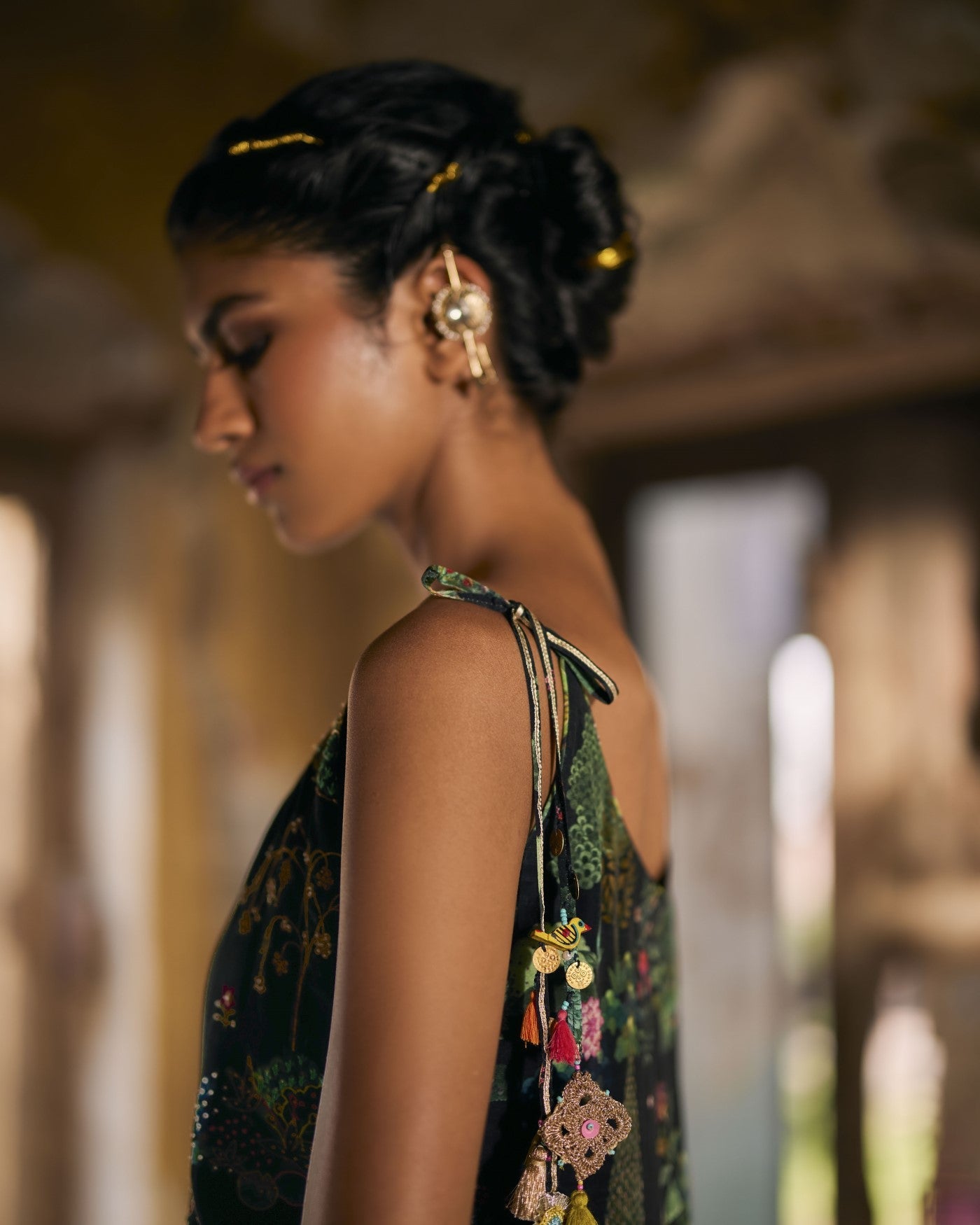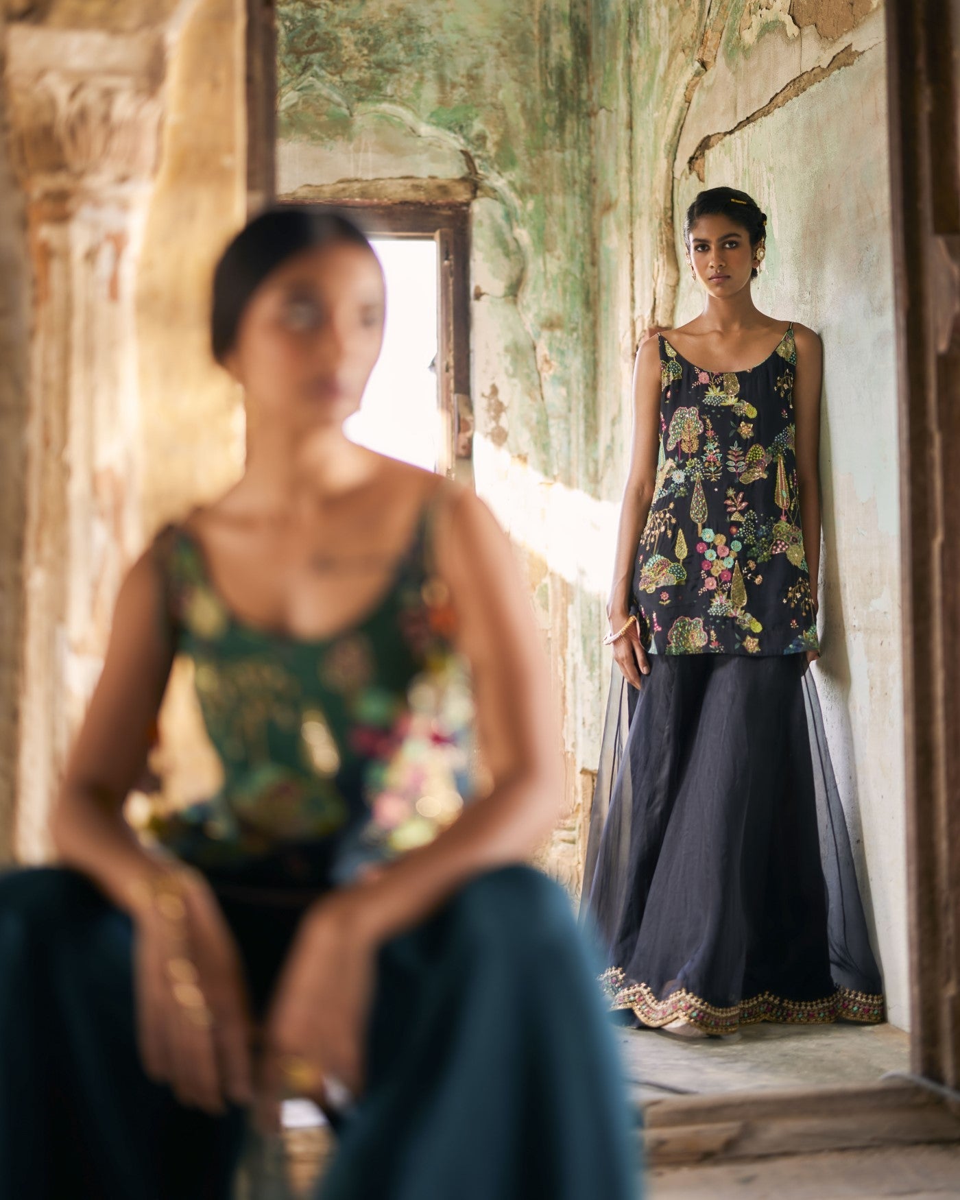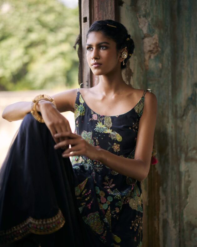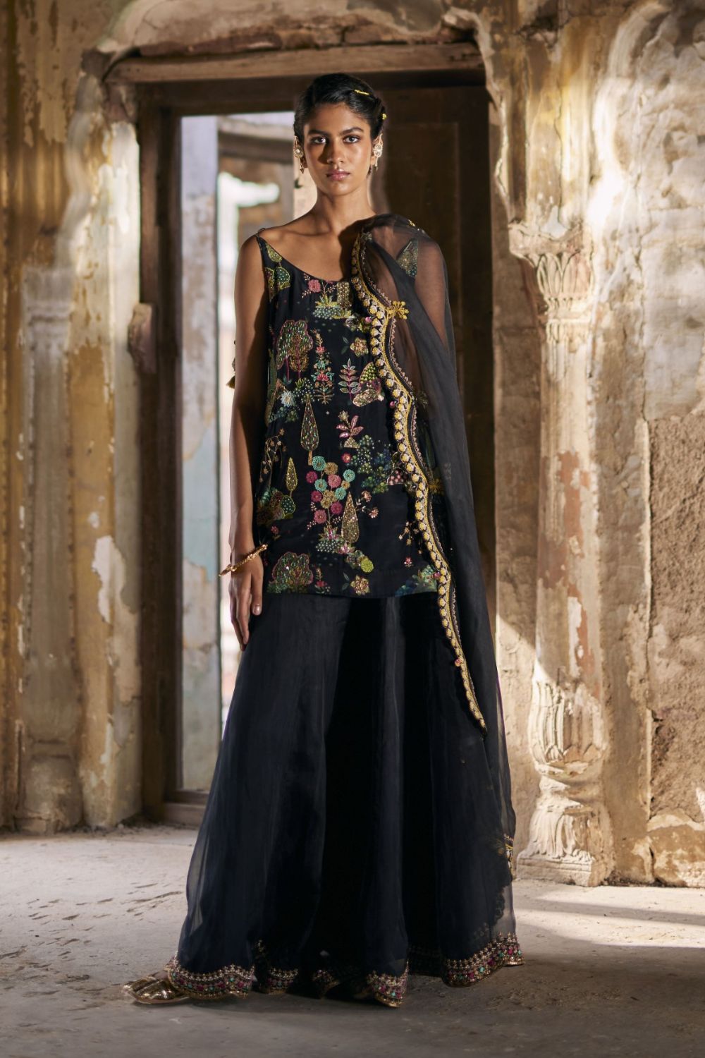 A Perfect ensemble for all occasions .The beautiful Nature Inspired print is the breath of fresh air in the gleaming Sunshine. Black hand embroidered crepe short kurti with all over Pitta, Dabka and Resham work . It is paired with delicate black hand embroidered silk organza sharara scalloped at hemline and black organza scalloped dori work dupatta.